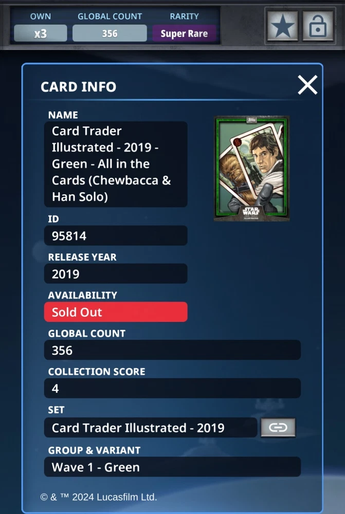 Topps Star Wars Card Trader 2019 Card Trader Illustrated Wave 1 Super Rare Green CTI All In The Cards (Chewbacca and Han Solo) This is a digital card. Please include Swct IGN with purchase. We do not sell to new accounts or accounts with poor trade ratings.