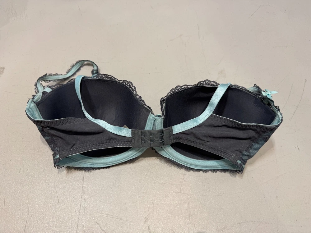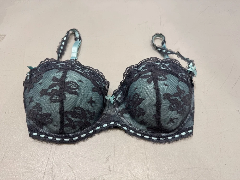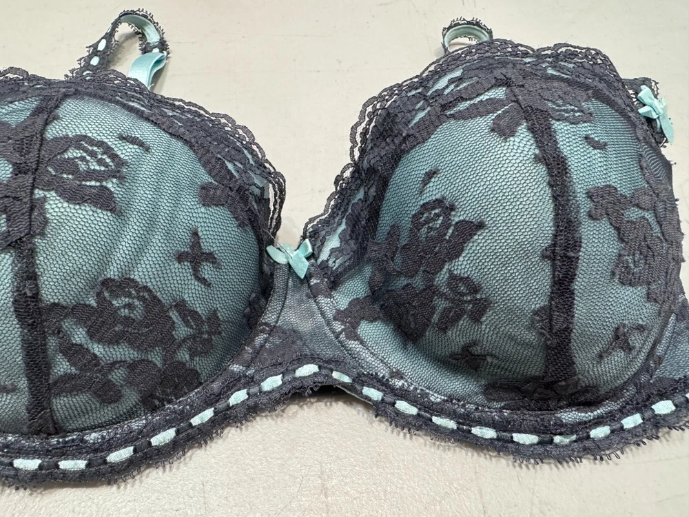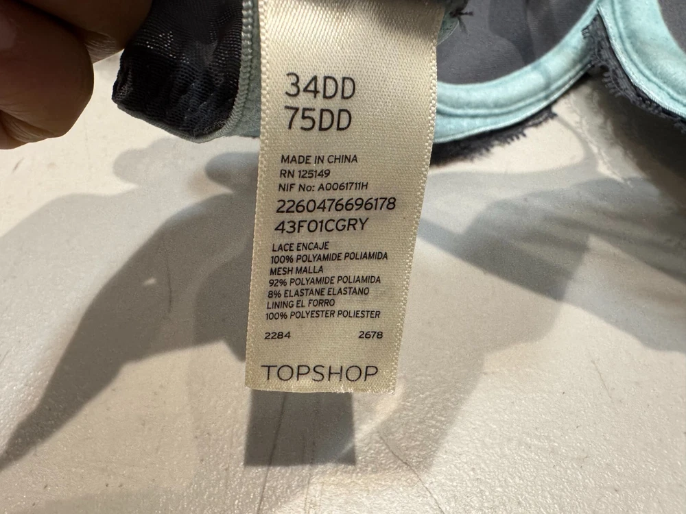 This Topshop bra is a green balconette style with an underwired construction and padded cups for added support and shaping. The bra features a floral lace covered design with embroidered accents, giving it a feminine touch. It has a bra strap closure with hook and eye fastening, suitable for a band size of 34 and cup size of DD. Perfect for women looking for a stylish and comfortable lingerie option.