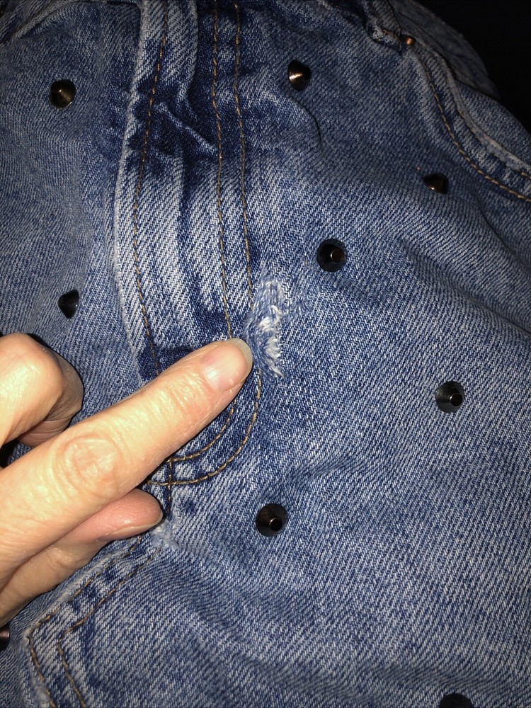 Great little mini skirt with studs and raw hem . Distressed effect. Please note there is a small rip in skirt by zip. Not sure if this is part of the distressed look or not. Price reflects this . Otherwise very good condition.