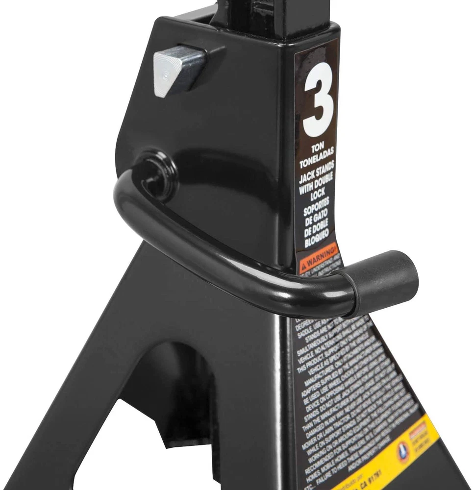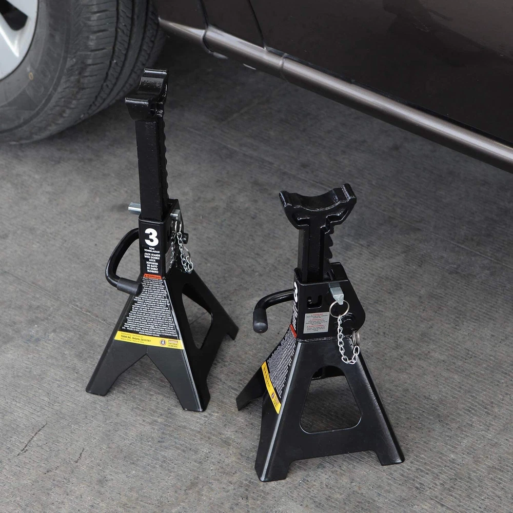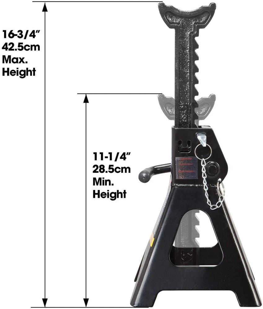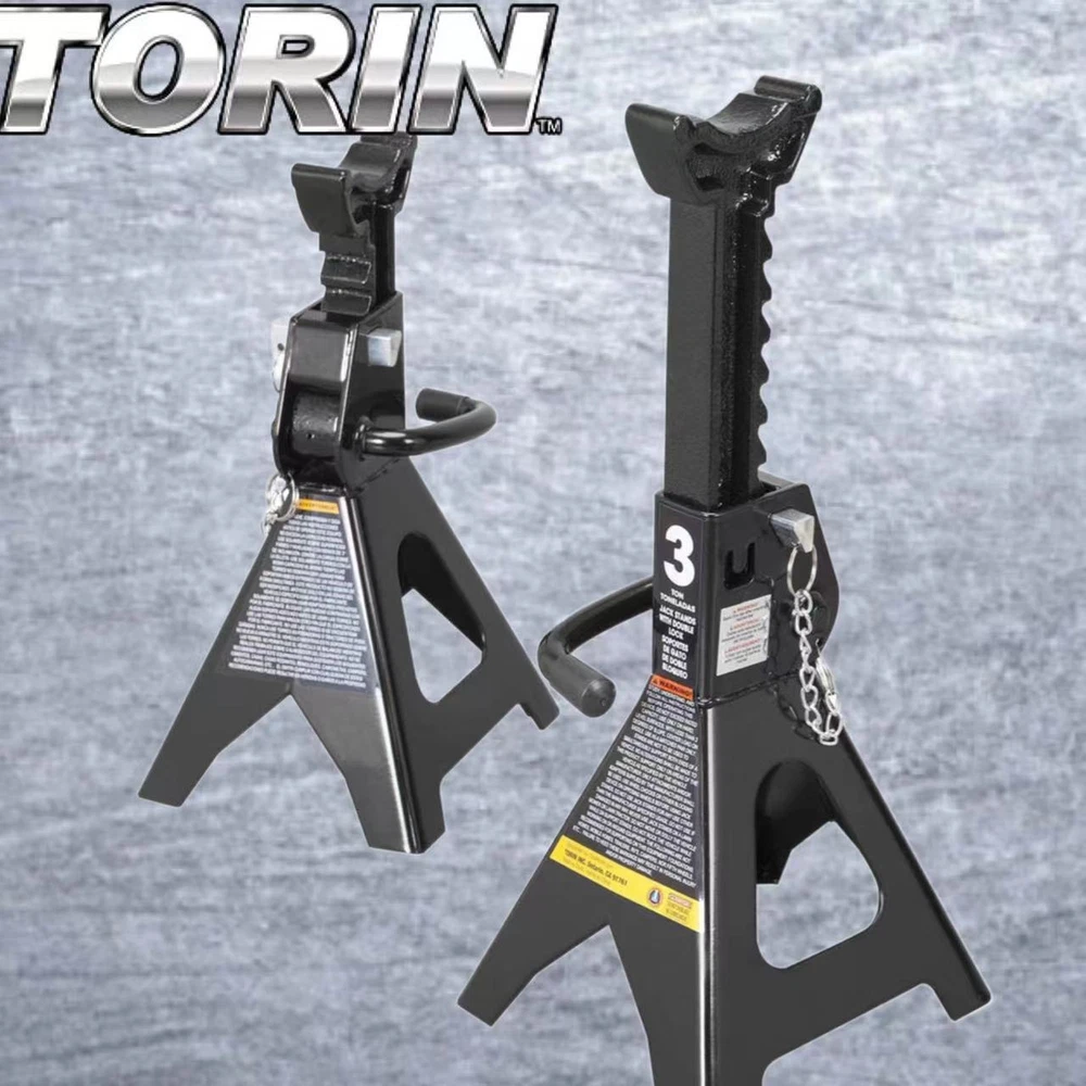 Torin Double Locking 3 Ton Heavy Duty Steel Jack Stands Car Lift, 2 Pack, Black Key Features: Double locking jack stands help support vehicles after lifting with a jack; Handles a wide range of vehicles including small cars, jeeps, ATV's, UTV's, and more Features a lifting range of 11-1/4" to 16-3/4" with a 3 ton (6,000 lb) load capacity; Saddle has a large surface area that provides better contact with the load being supported Constructed with heavy-duty steel and is industrial welded for quality and long term durability; Removable locking support pin provides added security that increases safety by 200% Wide pyramid style foot base provides added strength; Large foot base delivers additional stability and measures 7-11/16" x 6-7/8" Multi-position forged iron ratchet bar has a sawtooth design, allowing for quick height adjustments that lock into place Specifications: Lifting Capacity: 3 Ton Color: Black Material: Alloy Steel Minimum Height: 11-1/4" Maximum Height: 16-3/4" Package Dimensions: 7.87 x 8.43 x 14.57 inches Item Weight : 14.9 pounds Product Description: Torin AT43002AB steel double locking jack stands are a must have necessity in any garage. Handles a wide range of vehicles including small cars, jeeps, ATV's, UTV's, and more. It's constructed of high-grade steel with a welded frame for quality and long term durability. Features a lifting range of 11-1/4" to 16-3/4" with a 3 ton (6,000 lb) load capacity. Each stand is equipped with a removable locking support pin designed and dedicated to keeping you safe and increases safety by 200%. Multi-position forged iron ratchet bar has a sawtooth design, allowing for quick height adjustments that lock into place. The saddle has a large surface area that provides better contact with the load being supported. Wide pyramid style foot base provides added strength; Large foot base delivers additional stability and measures 7-11/16" x 6-7/8". On Jul 6, 2023 at 09:06:13 PDT, seller added the following information: On Nov 14, 2024 at 03:23:59 PST, seller added the following information: