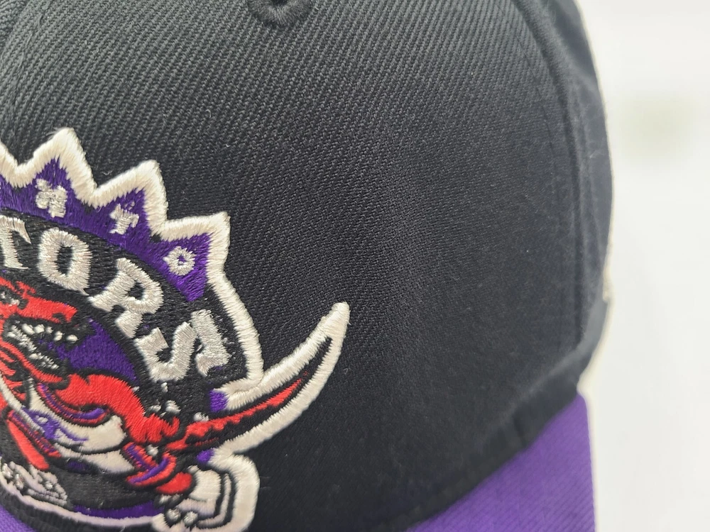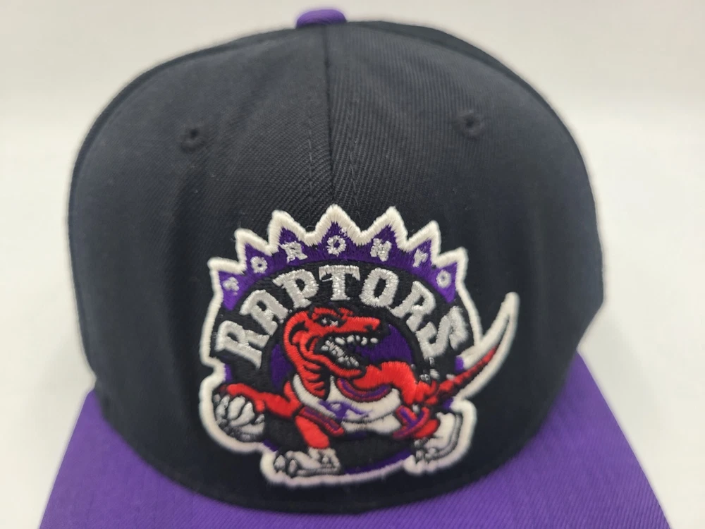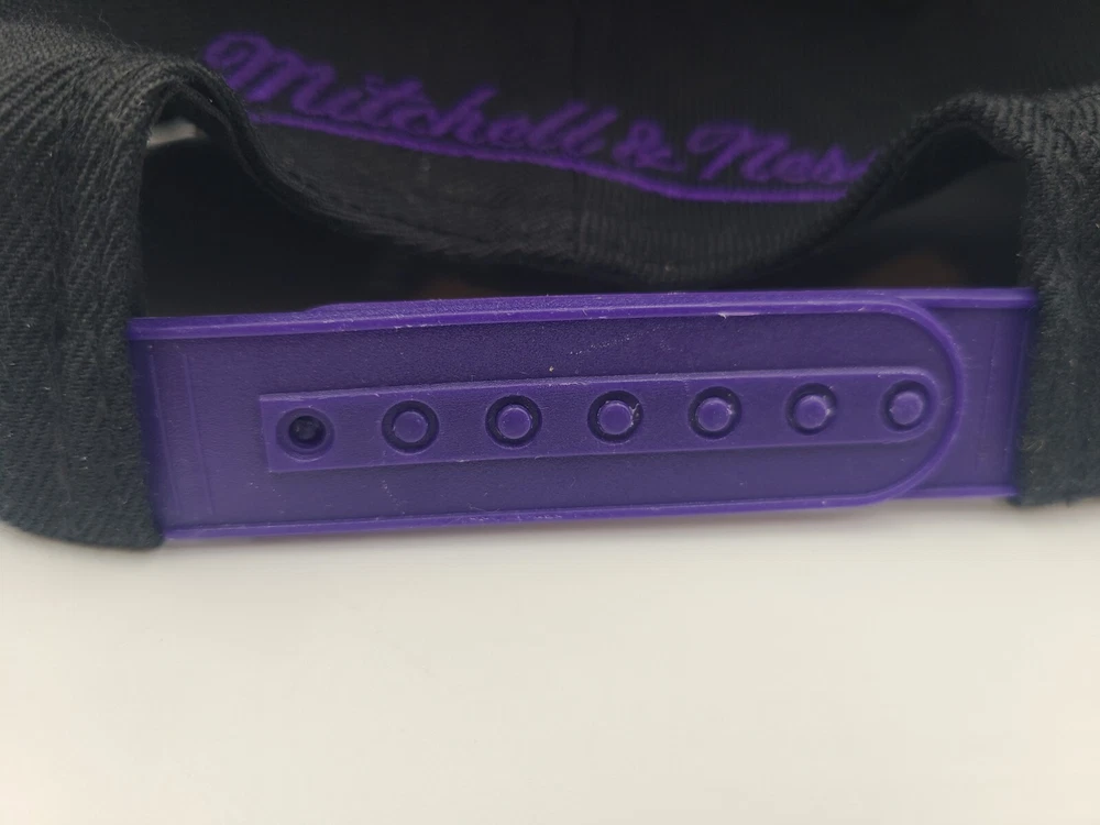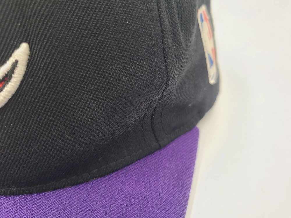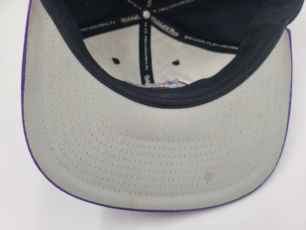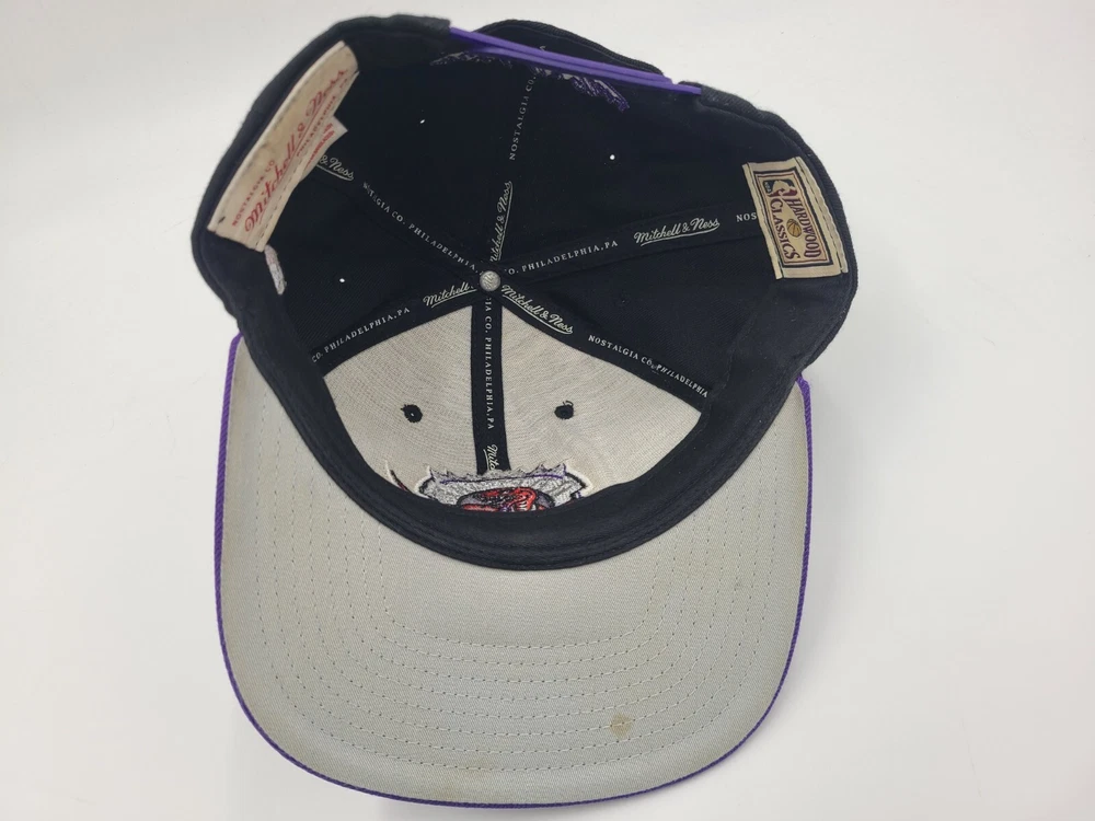 The 1st pin on the snapback is broken and doesn't snap in as seen in photos. Has a mark left over from the sticker on the brim, creasing and scuffs on the front, scuffs on the side and back, and stains underneath the brim. Toronto Raptors Mitchell & Ness Hardwood Classics Snapback Hat Cap Black Purple. EACH ADDITIONAL HAT PURCHASED IS ONLY $1 ADDED SHIPPING!