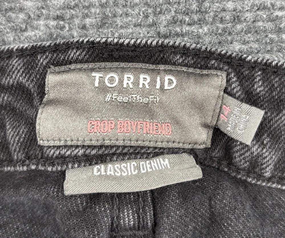 Elevate your denim game with these Torrid crop boyfriend jeans. The classic black color and solid pattern make them versatile for any occasion. The button fly closure and high-rise waist add a touch of bohemian and preppy vibe to the overall look. Made with a blend of spandex and cotton, these denim jeans are machine washable and have a breathable fabric type. The distressed details and pockets make them perfect for casual wear while the stretch and comfort features provide all-day wearability. Ideal for winter, summer, fall, and spring, these jeans are a must-have addition to any wardrobe. Items are PREOWNED, NWT or NWOT (NEW WITH or WITHOUT TAGS). Items are checked for flaws and if applicable are pictured. Items are well cared for and stored indoors. Please review and compare the measurements we provide in the photos. Measurements are approximate and in flat inches. Please keep in mind many items are preowned and may not reflect the manufacturer's tag/sizing and may have shrunken. We ship quickly. 30 day returns available. Please contact with any questions. Thank you for your business and remember to save our store info as we add new items often. God Bless Mdubs Clothing