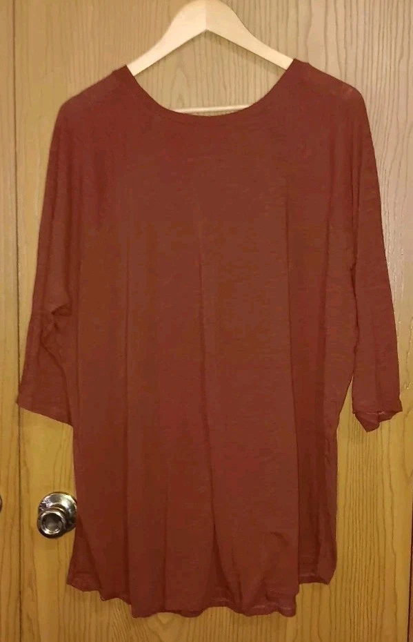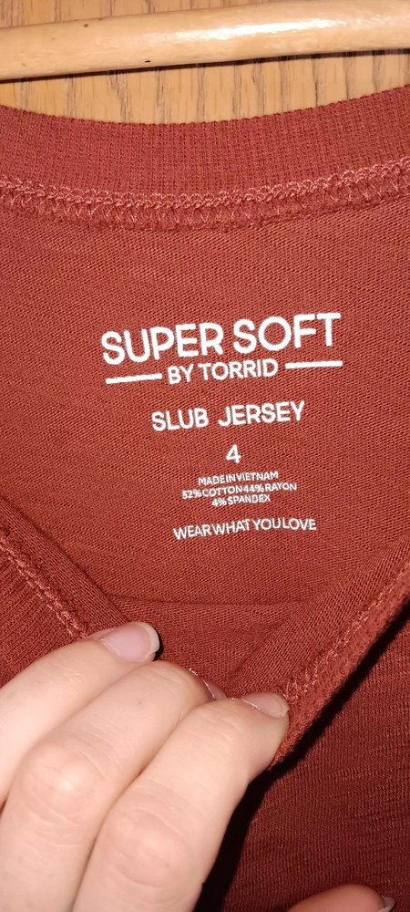 The Torrid Super Soft Slub Jersey Shirt in size 4XL is a plus-size women's t-shirt in a heather rust red color. It features a 3/4 sleeve design and is made from lightweight material, making it comfortable and easy to wear. With the Torrid brand known for its quality and style, this shirt is sure to be a versatile and flattering addition to any woman's wardrobe. 33.