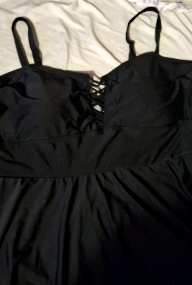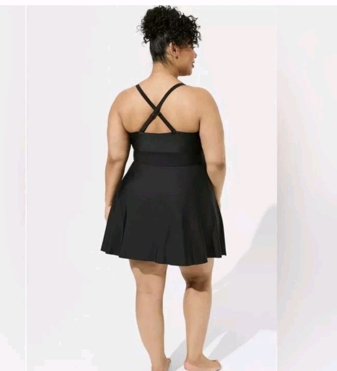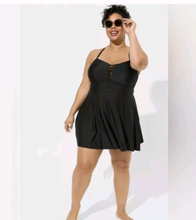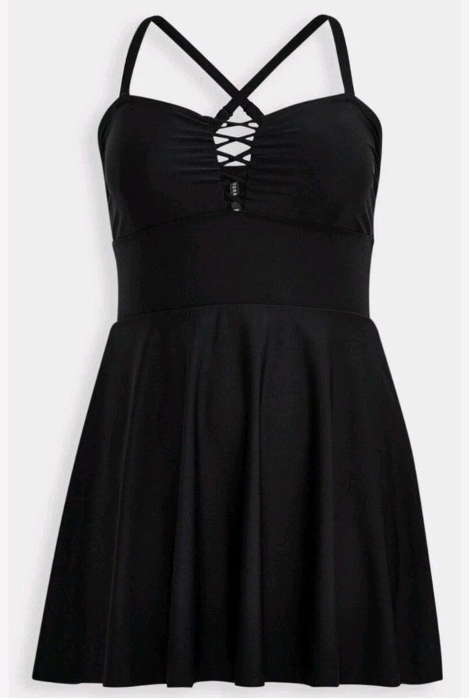Torrid Wireless Long Lattice Front Swim Dress W/ Brief size 5X PRODUCT DETAILS FIT Lightly lined; wireless cups. Adjustable multiway straps. Fits most bust sizes. Please refer to the Size Fit & Guide Chart for the perfect fit. MATERIALS + CARE Nylon/spandex knit fabric. Wash cold; line dry Imported plus size swimwear DETAILS Mid coverage. Modesty pads. Crisscross-front detail. Long length for more coverage. Power mesh lining contours your shape. UPF 50+