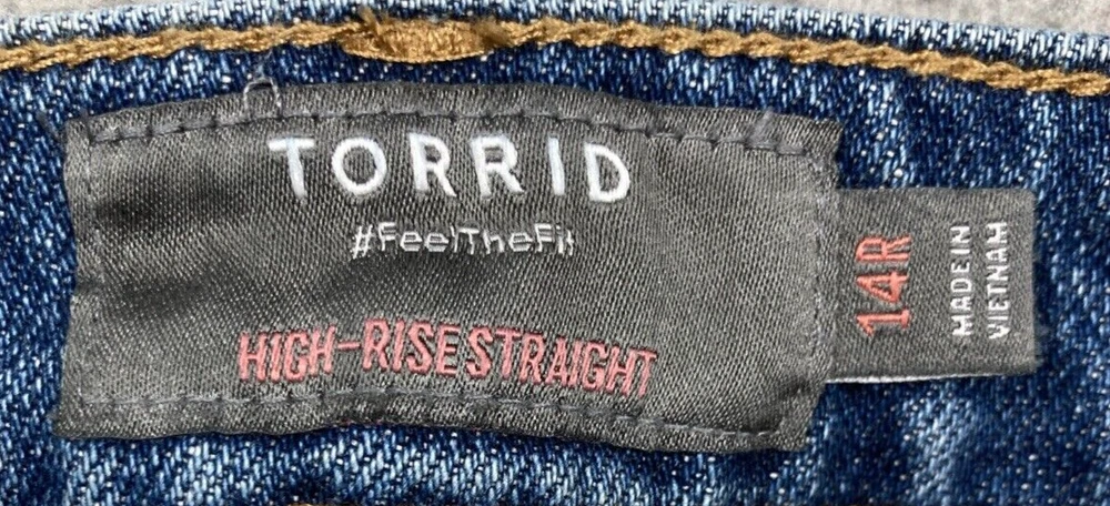 For Sale: Torrid Jeans Womens 14R Blue Button Fly Distressed High Rise Straight Studded Please check photos carefully for details/measurements. Measure your favorite garment and compare. * May be wrinkled upon arrival due to packaging. * This item has been cleaned per eBay policy. We welcome questions and offers! Thank you for taking time to view and consider this item!