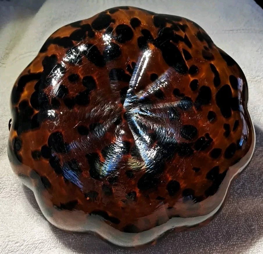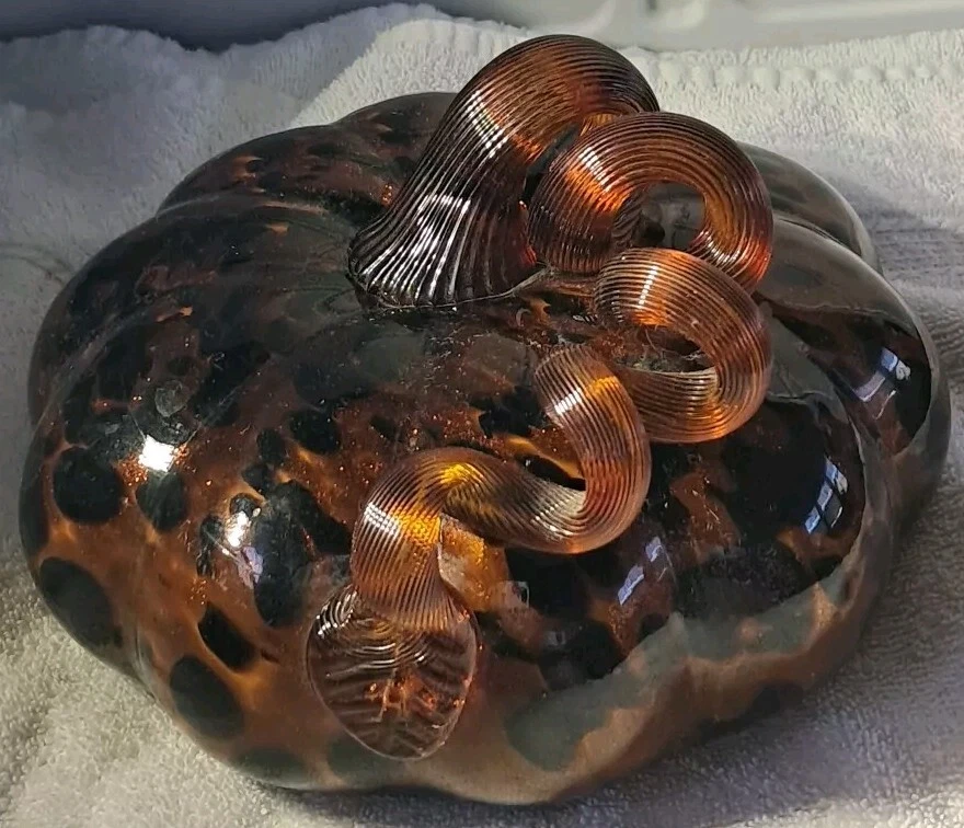 Tortoise Shell & Glitter Art Glass Hand Blown Pumpkin Swirled Stem with glossy finish and glitter details make this piece a standout addition to any collection. Measuring 5.5 inches in height and 9 inches in width, this contemporary original is an ideal size for display. The artist is unknown, but the quality of this sculpture is undeniable. Whether you're a fan of art glass or simply love unique and eye-catching decor, this pumpkin is sure to impress. Beautiful piece to add to your collection. Please see all photos. Buyer pays shipping. Please see my other items. Thank you.