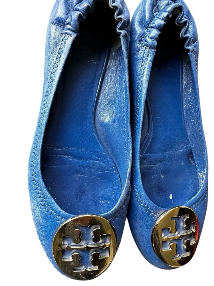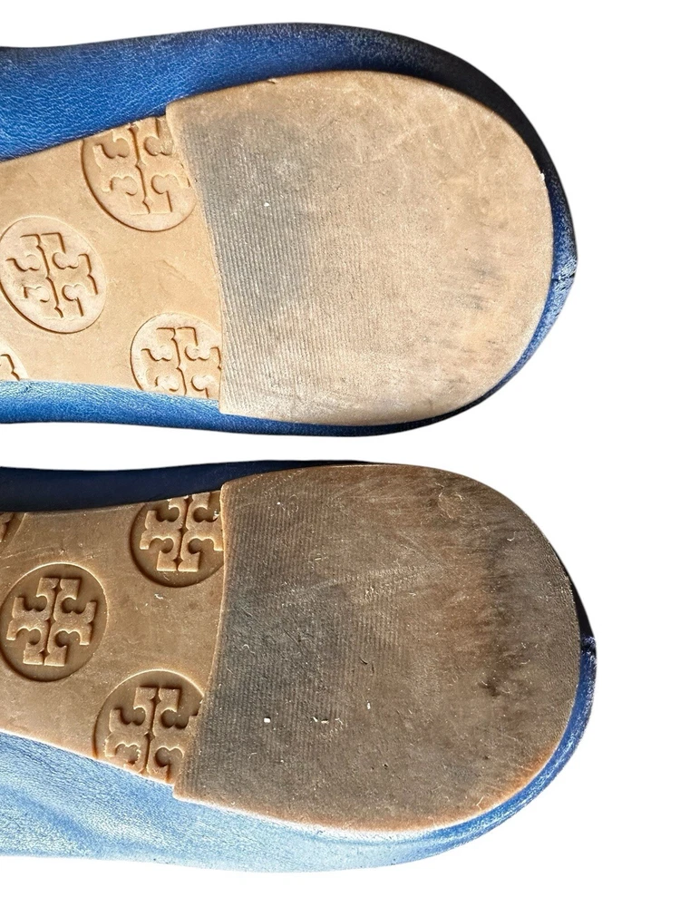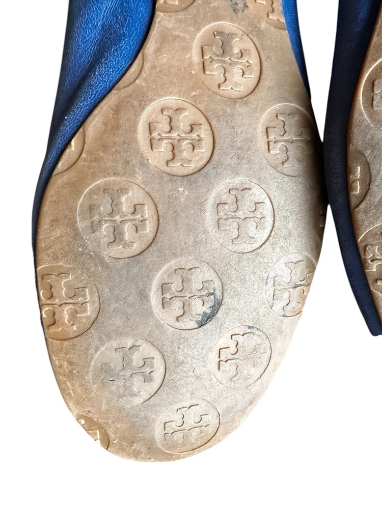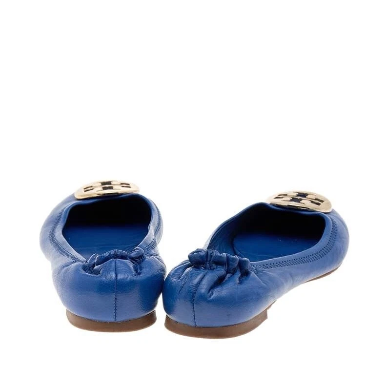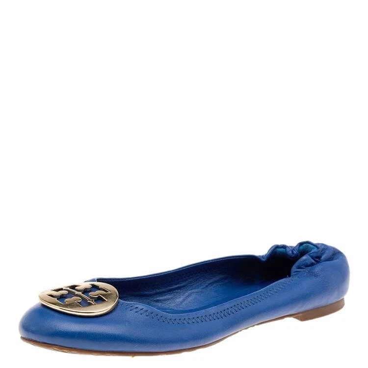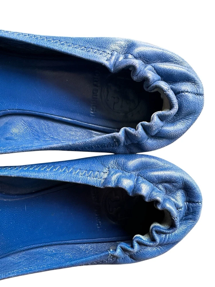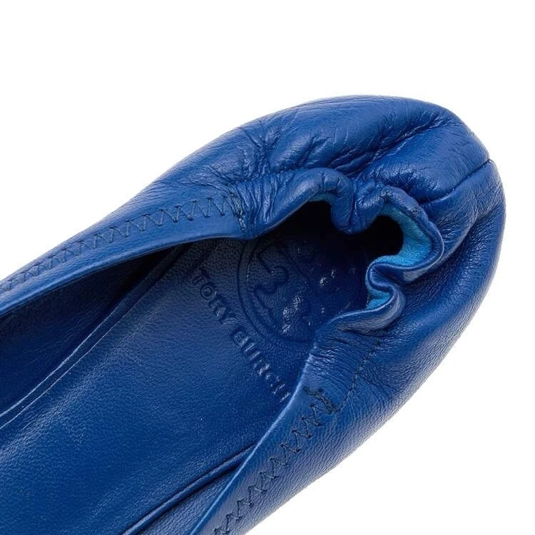 Tory Burch Blue Leather Twiggie Scrunch Ballet Flats Size 6.5 These Tory Burch ballet flats offer the joy of comfort. Crafted from blue leather, they flaunt logo details on the toes and a scrunch style on the counters to give you a good fit. The pair is complete with comfortable insoles for all-day ease. Item Condition Good EXTERIOR:Minor darkening and scratches. SOLE:Minor signs of use. INSOLE:some whitening and creases. LINING /Heel Compartment:Minor Creases and darkening. HARDWARE: Minor scratches.