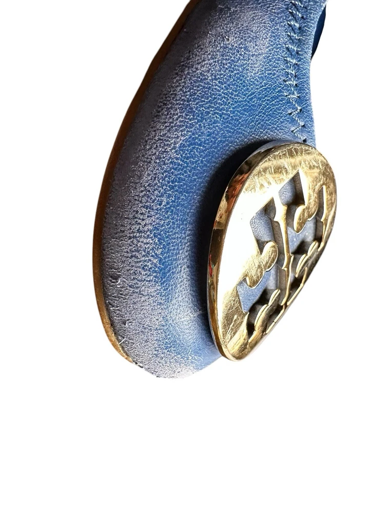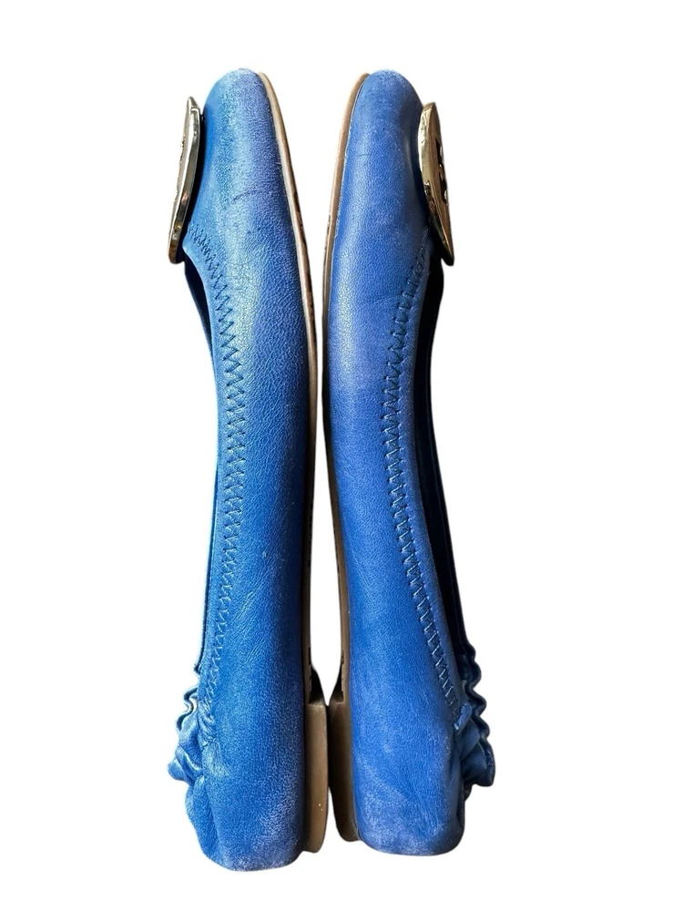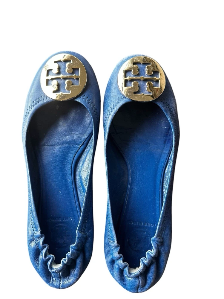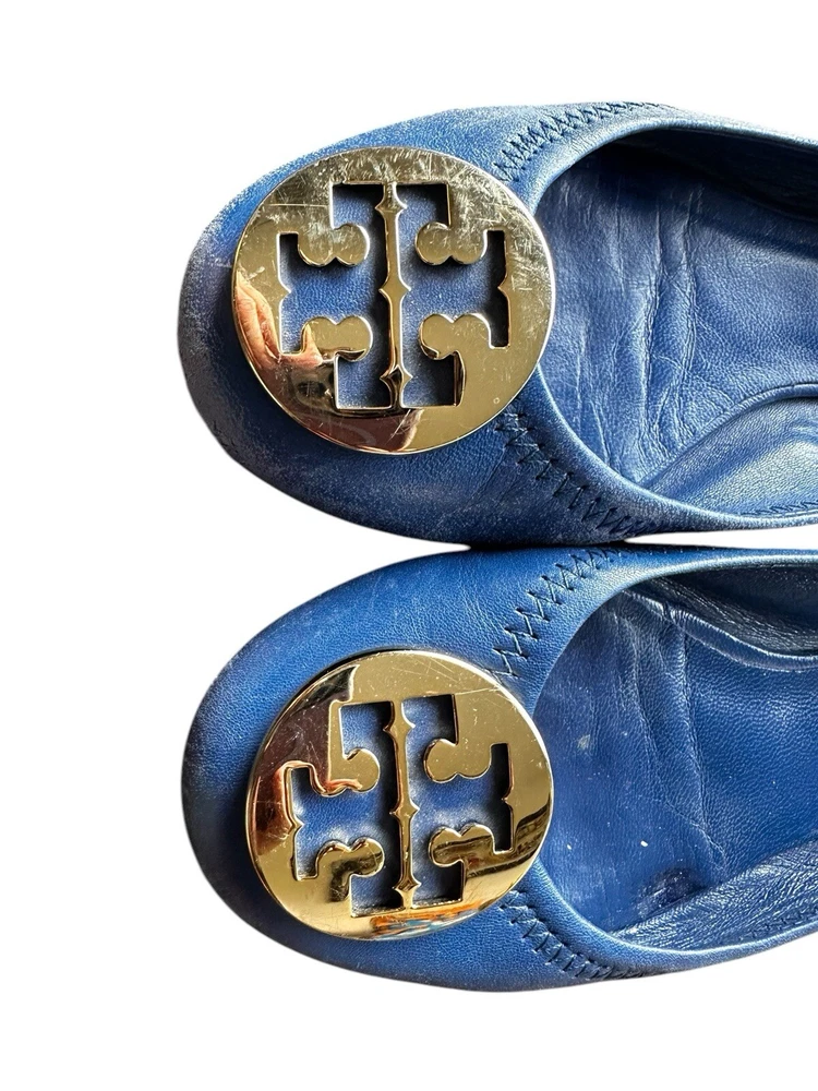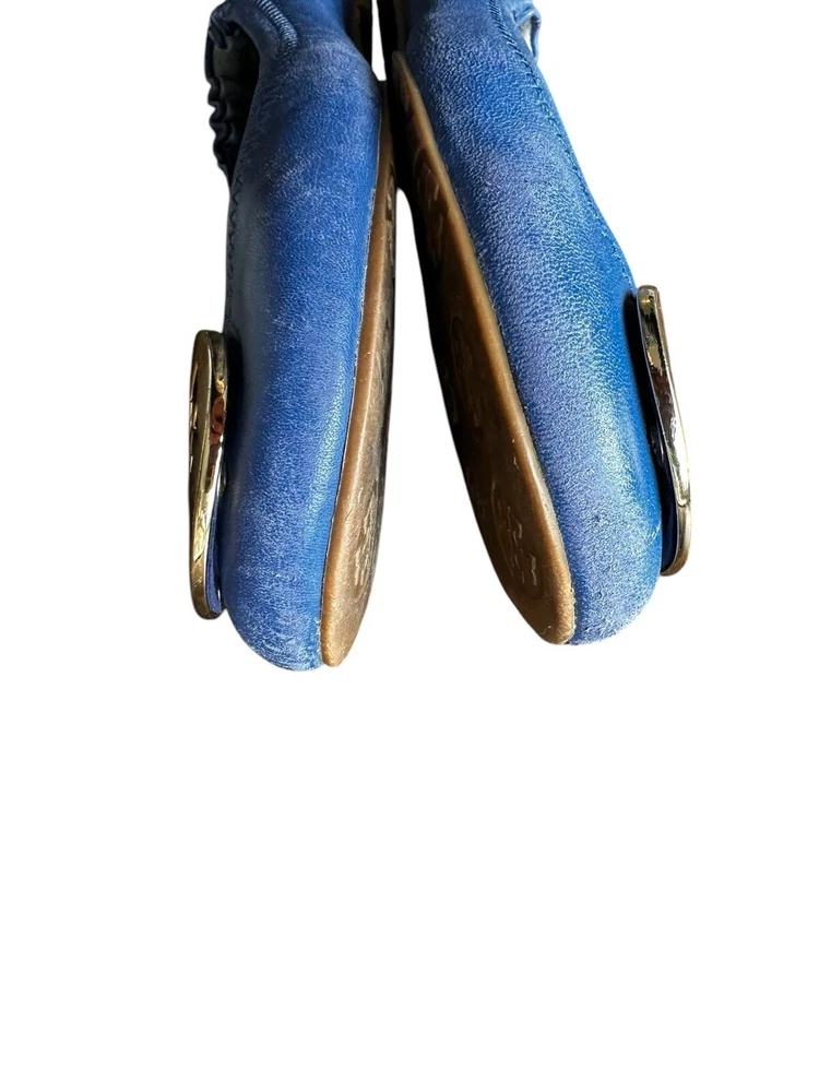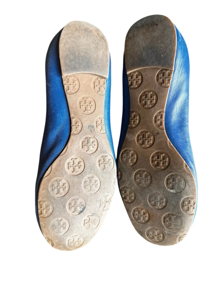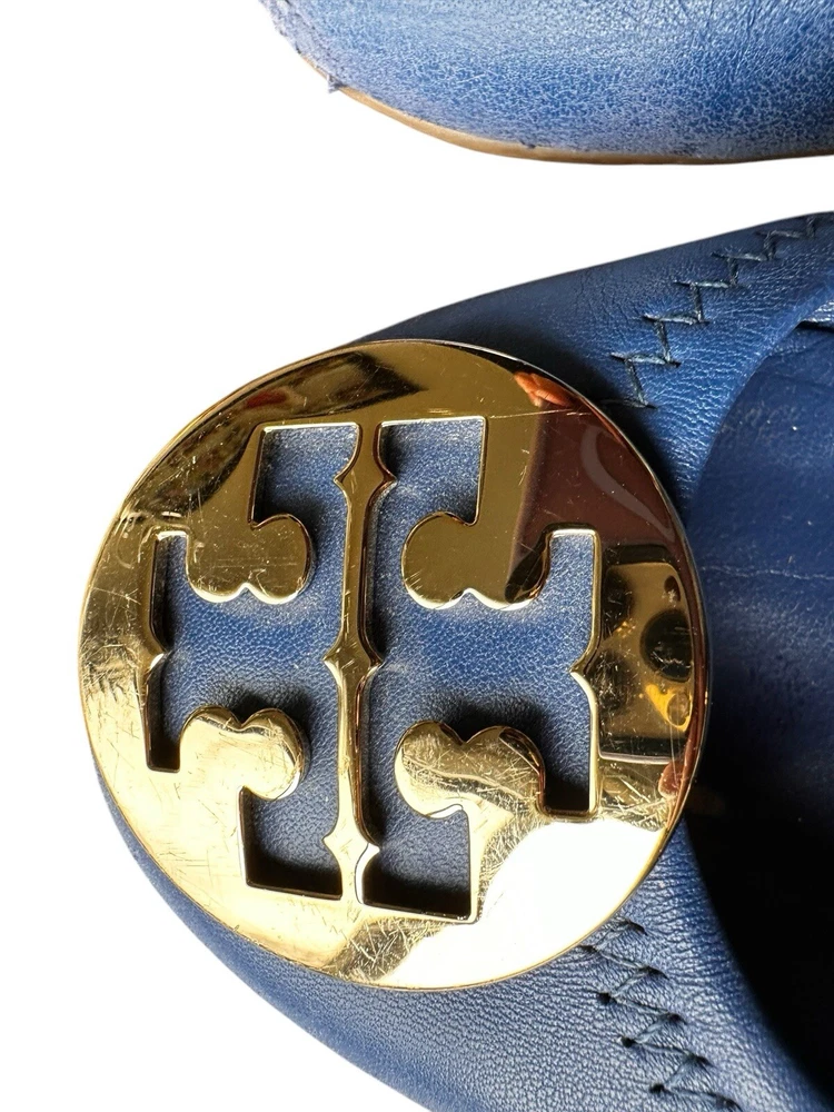 Tory Burch Blue Leather Twiggie Scrunch Ballet Flats Size 6.5 These Tory Burch ballet flats offer the joy of comfort. Crafted from blue leather, they flaunt logo details on the toes and a scrunch style on the counters to give you a good fit. The pair is complete with comfortable insoles for all-day ease. Item Condition Good EXTERIOR:Minor darkening and scratches. SOLE:Minor signs of use. INSOLE:some whitening and creases. LINING /Heel Compartment:Minor Creases and darkening. HARDWARE: Minor scratches.