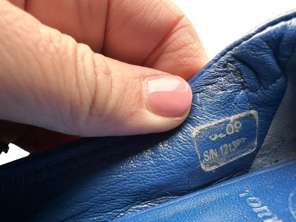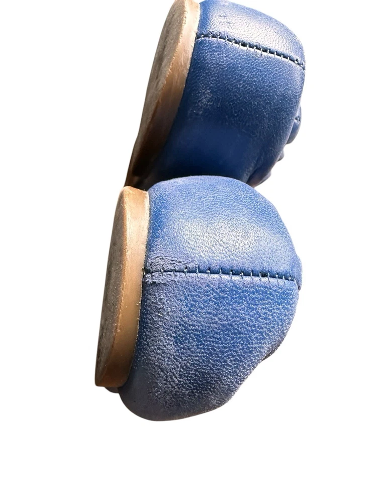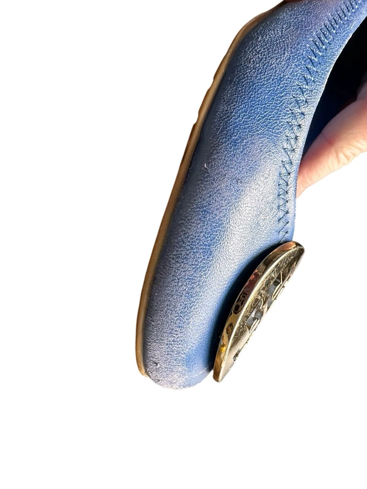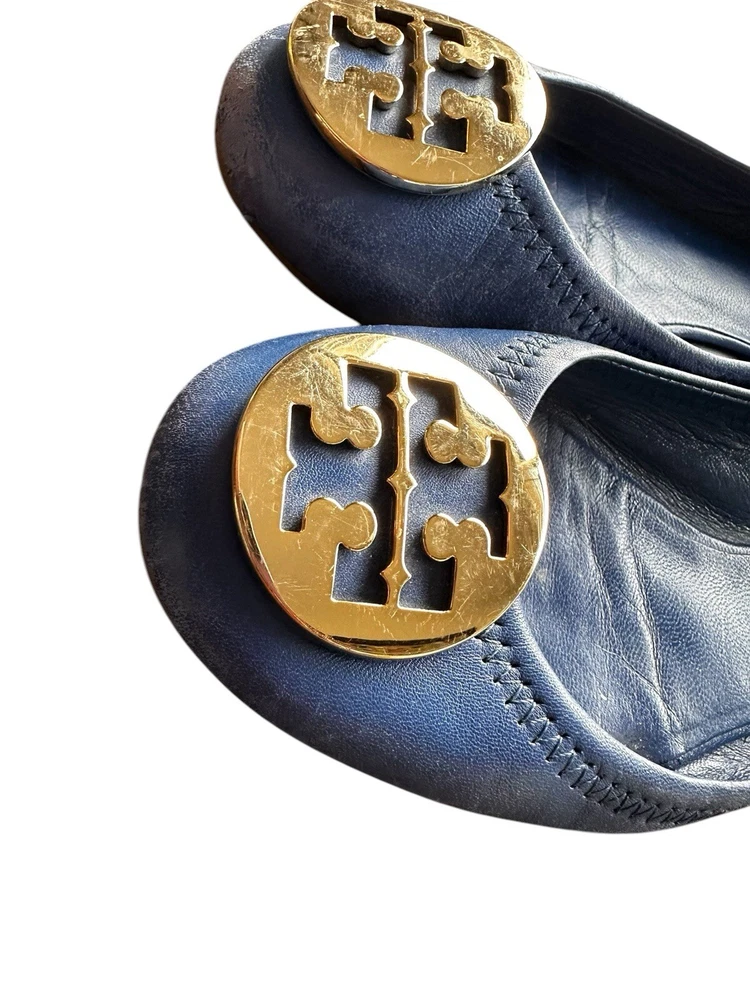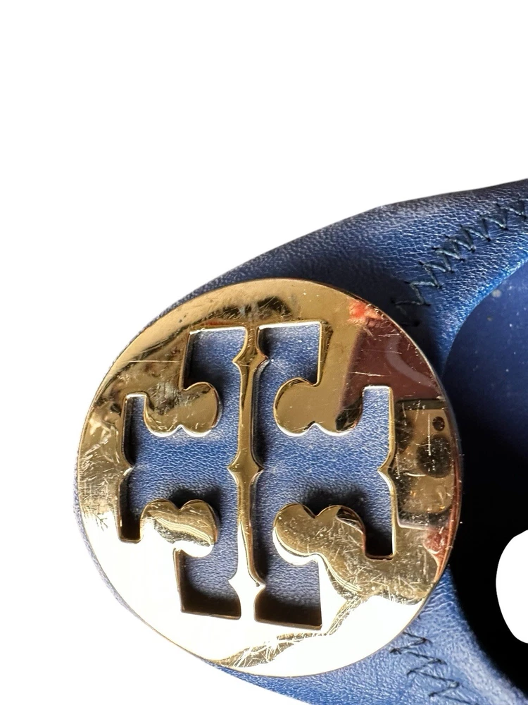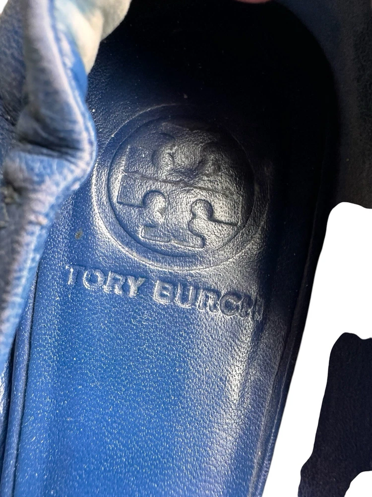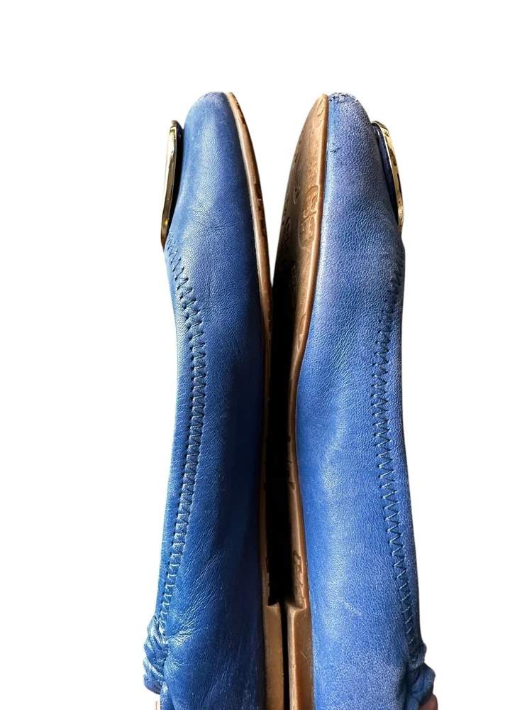 Tory Burch Blue Leather Twiggie Scrunch Ballet Flats Size 6.5 These Tory Burch ballet flats offer the joy of comfort. Crafted from blue leather, they flaunt logo details on the toes and a scrunch style on the counters to give you a good fit. The pair is complete with comfortable insoles for all-day ease. Item Condition Good EXTERIOR:Minor darkening and scratches. SOLE:Minor signs of use. INSOLE:some whitening and creases. LINING /Heel Compartment:Minor Creases and darkening. HARDWARE: Minor scratches.