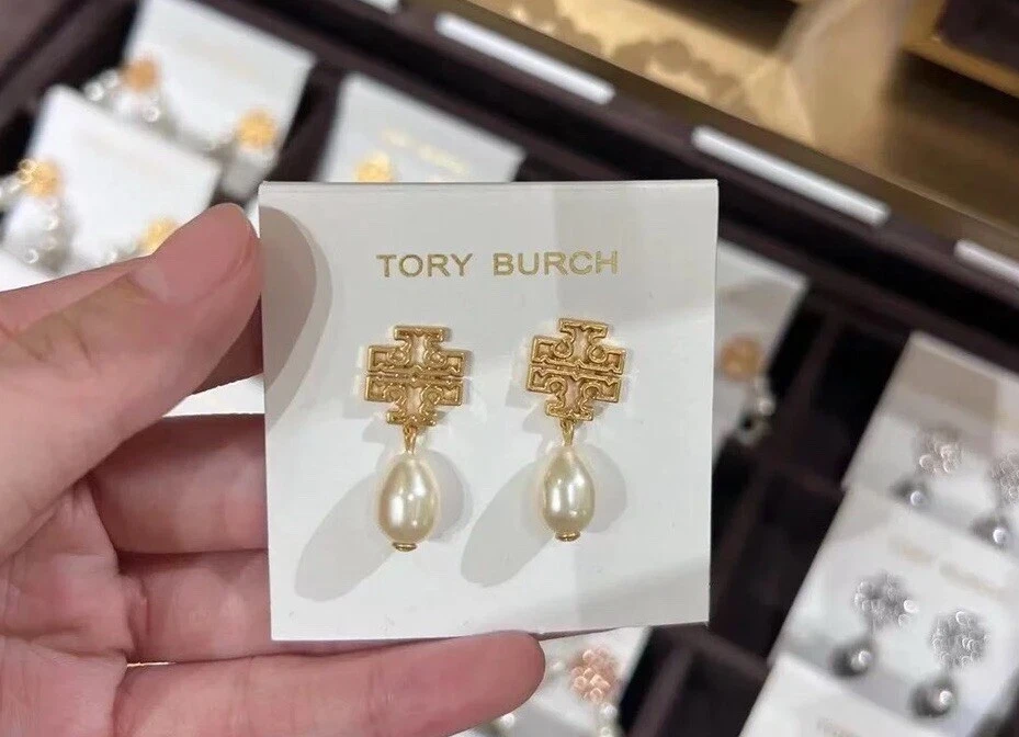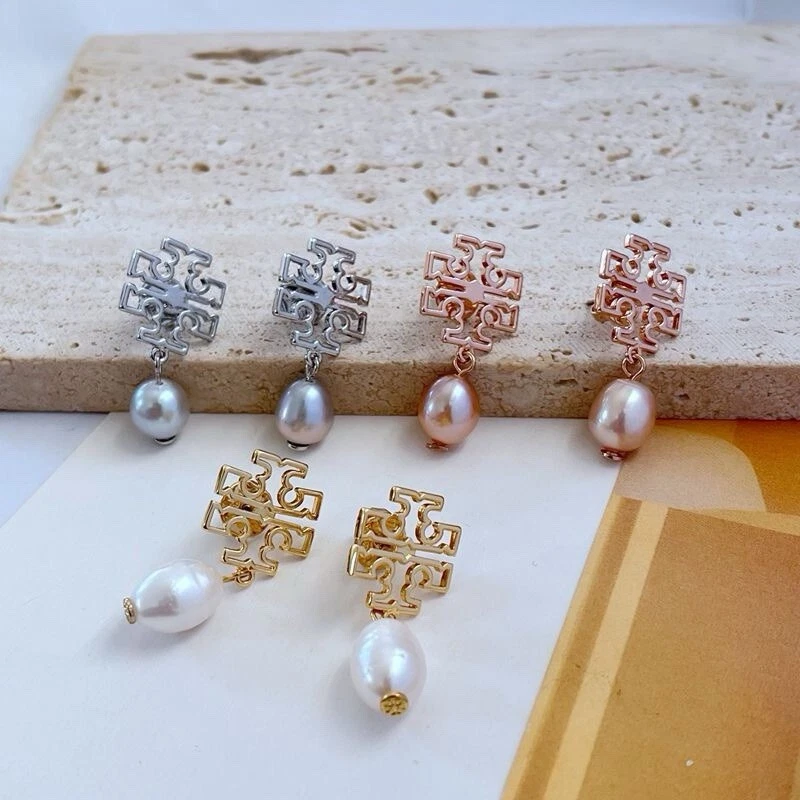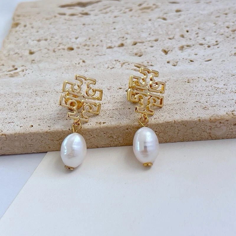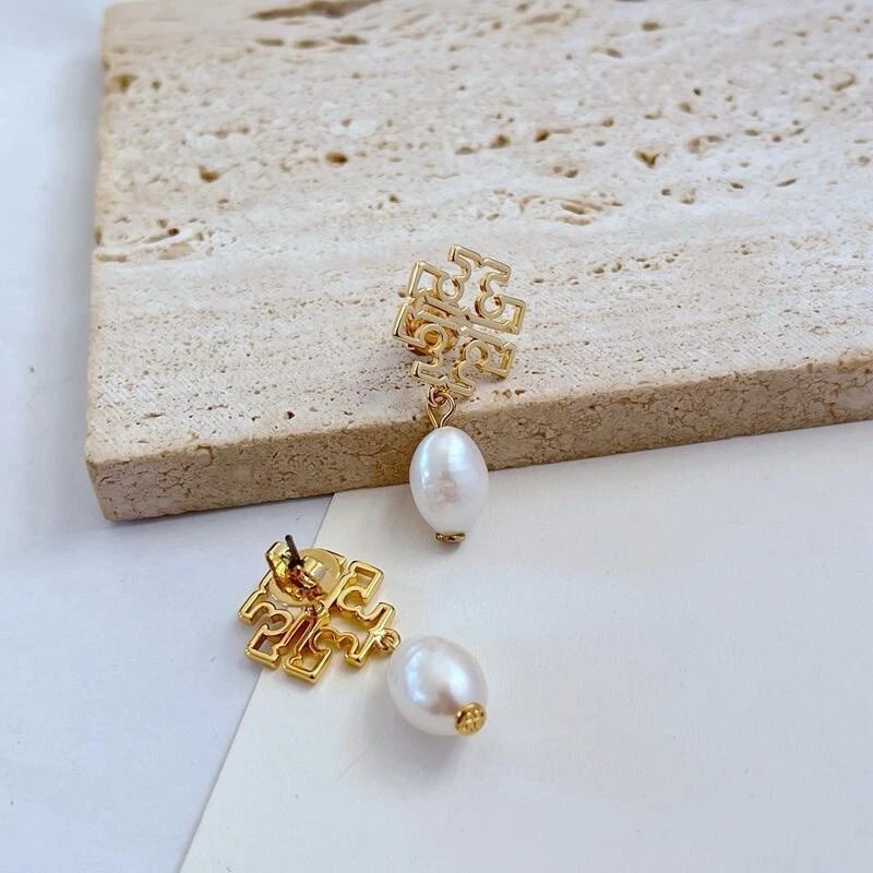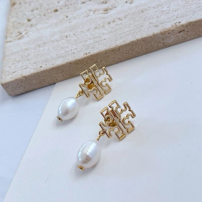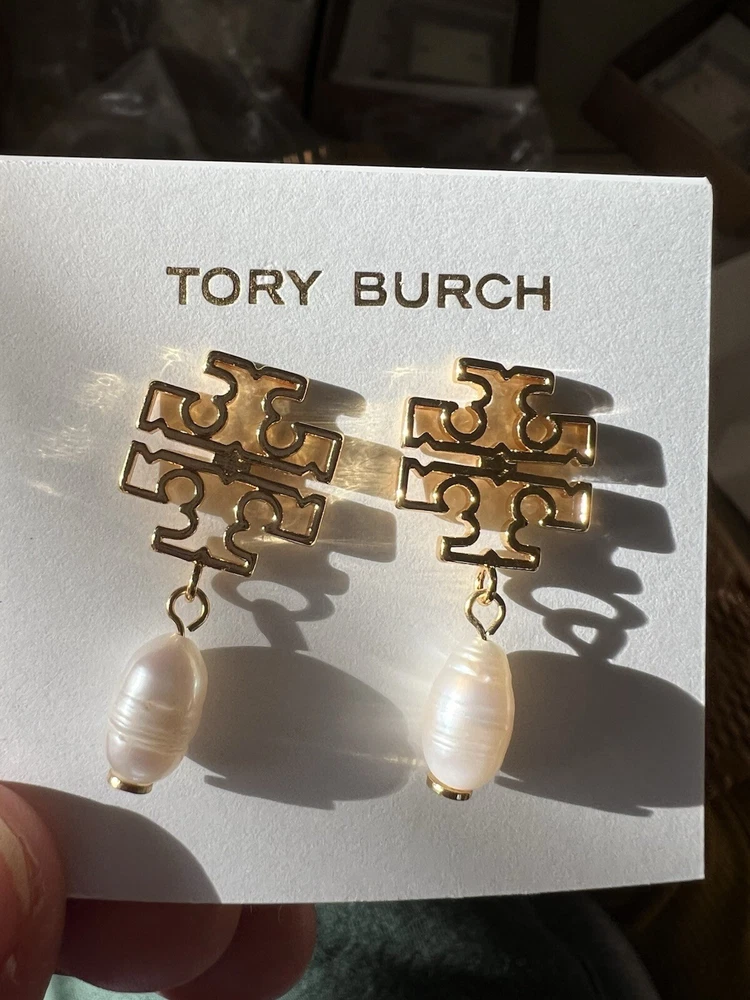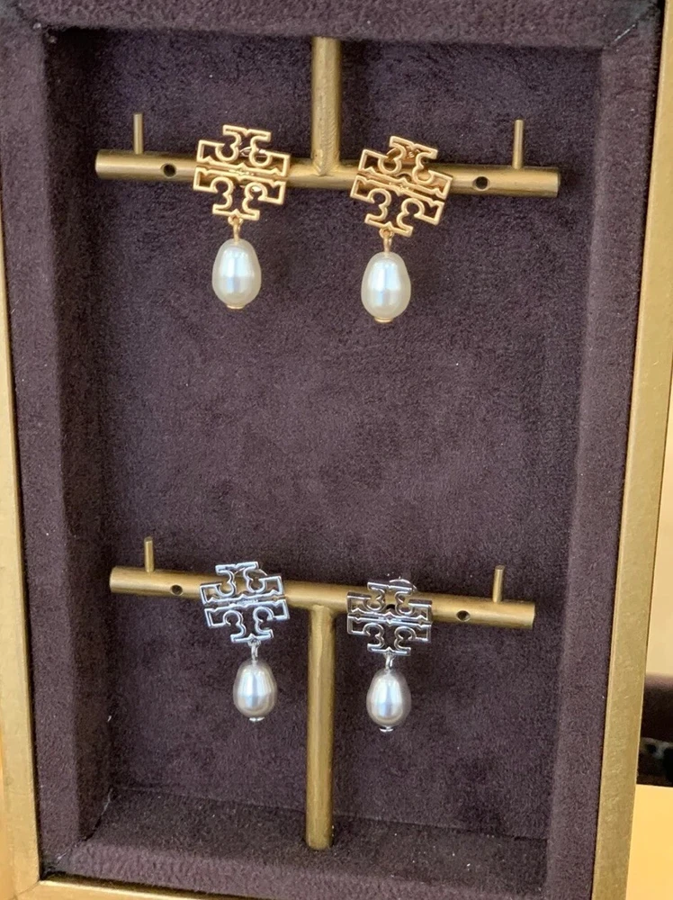 Tory Burch Classic DoubleT Pearl Drop Lady Classic Earrings