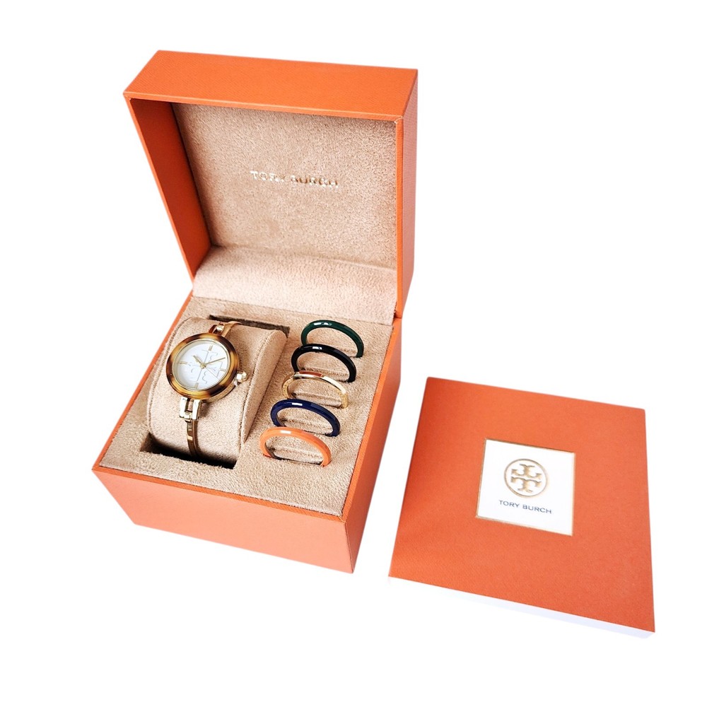 1 Details WATCH BRAND: Tory Burch COLLECTION: Gigi MODEL NUMBER: TBW2100 GENDER: Women MOVEMENT: Japan Quartz RETAIL/MSRP: $228 DIAL COLOR Ivory logo enamel finish SIZE: diameter: 21 mm (0.83") HANDS/MARKERS Gold tone stainless steel, polished finish BRACELET BANDS: 3 mm (0.11") width; gold tone stainless steel, polish finished slim bangle features a hook closure to keep the watch secure and comfortable around the wrist. LUG WIDTH: 3 mm (0.11") CLASP: Hook closure; Adjust-O-Matic closure FITS WRIST: Up to 16.5 cm (6.5") CASE MATERIAL: Gold Plated Stainless Steel; Polished Finish SIZE: 27 mm x 27 mm (1.06" x 1.06") excluding crown THICKNESS: 7.5 mm (0.3") BEZEL: 6 interchangeable top rings in gold hardware, black, green, navy, orange, and tortoise included. Twist anti-clockwise to loosen the top ring. ADDITIONAL INFORMATION FEATURES: Scratch-Resistant Sapphire Crystal with Anti-Reflective Coating.; Octagon-Shaped Crown FUNCTIONS : Hour, Minute WATER RESISTANCE: 30 meters/165 feet/3 ATM WARRANTY: 2 Year Factory International Warranty 100% brand new and authenticity guaranteed or your money back. Item comes with original Tory Burch presentation box, retail tag, instruction manual, and two year international warranty. Brand new with factory seals intact. All items are in stock ready to ship.