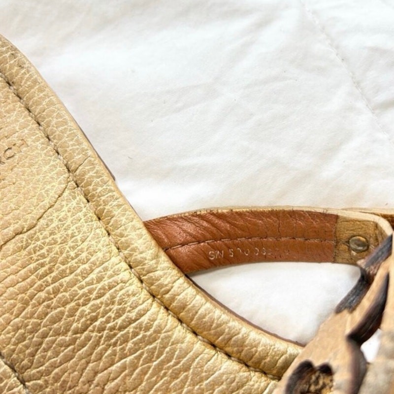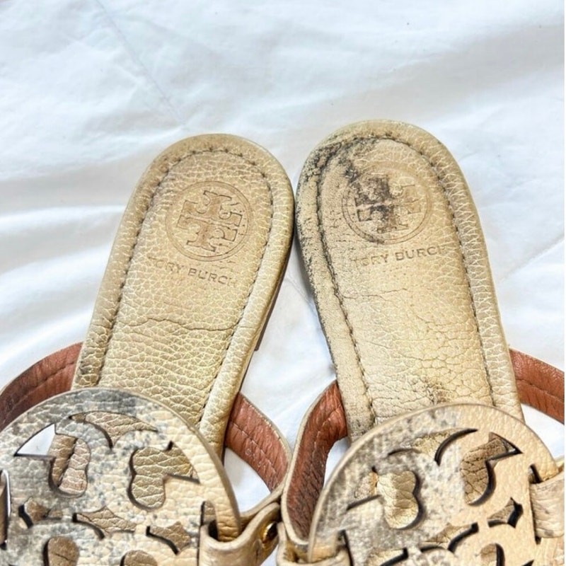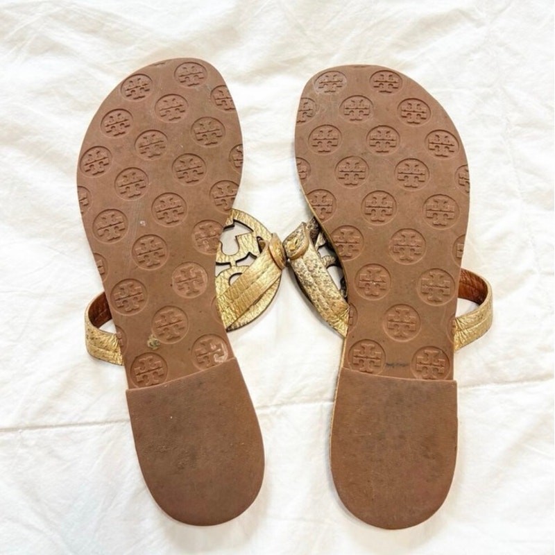 Step into classic style with these Tory Burch Miller sandals in metallic gold leather. Featuring the iconic cutout double-T logo and thong strap design, these sandals are a chic and versatile addition to any wardrobe. Made with quality leather uppers and rubber soles embossed with the Tory Burch logo for comfort and traction. • Brand: Tory Burch • Style: Miller Sandals • Color: Metallic Gold • Material: Leather upper, rubber sole • Size: Women’s 8 • Iconic cutout logo detail • Slip-on thong sandal style • Condition: Pre-owned with visible wear on insoles and soles (see photos). Still lots of life left! Perfect for warm-weather outfits, vacations, or casual chic looks year-round. 12
