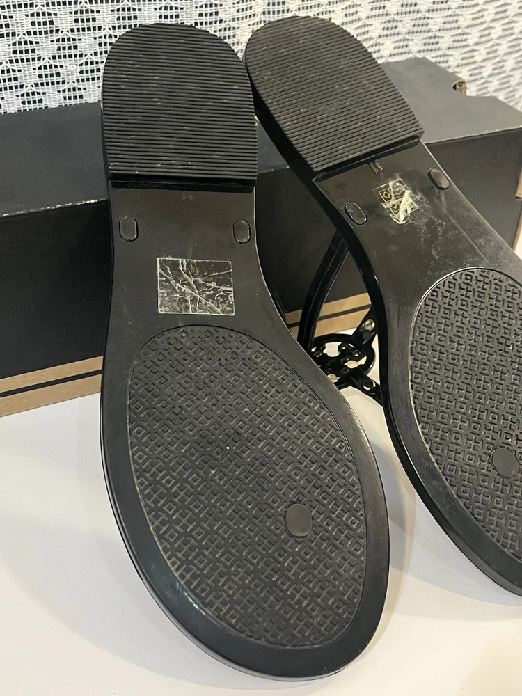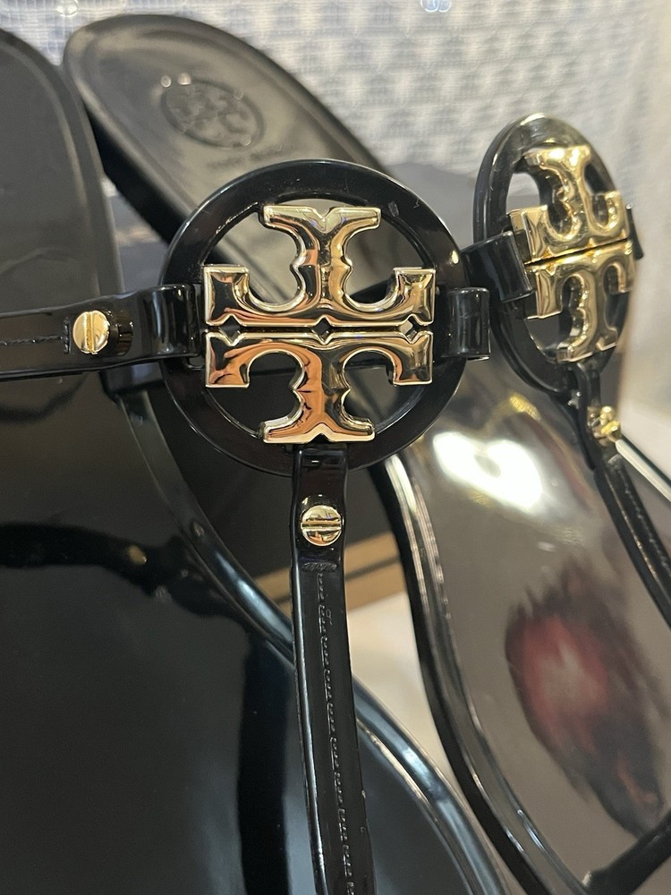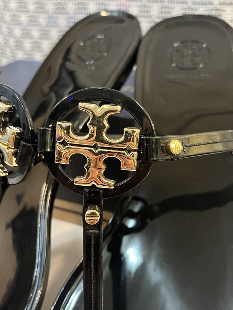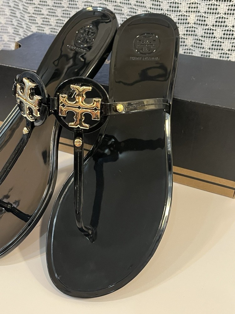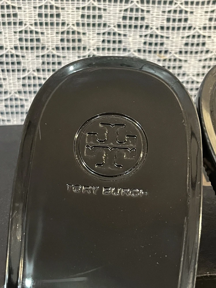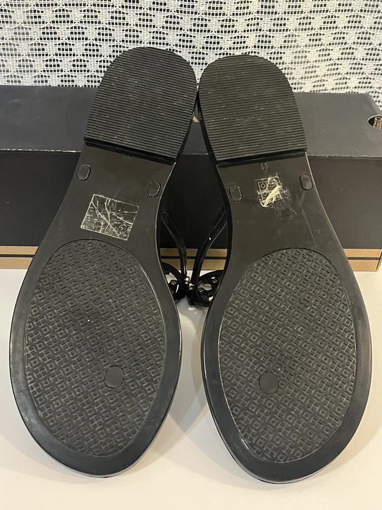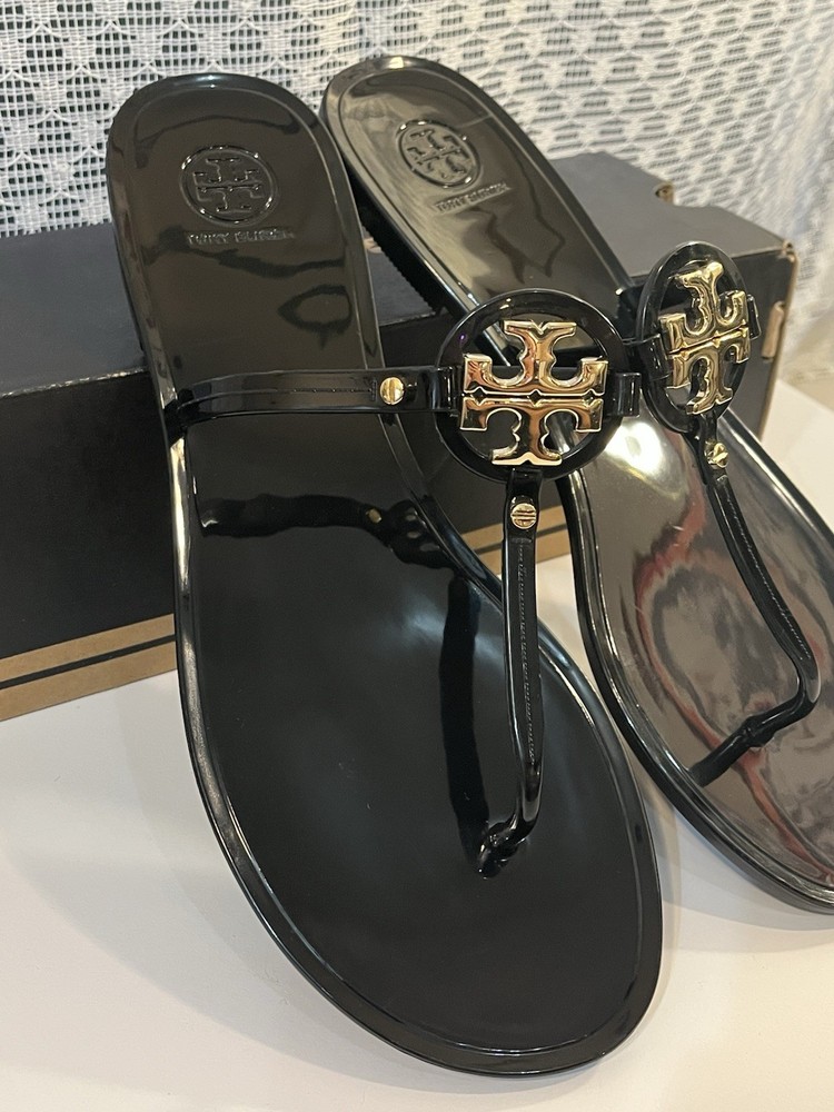 The Tory Burch Mini Miller Women's Flat Thong Jelly Sandals in black with gold accents are a stylish and comfortable option for casual occasions. With a flat heel and pull-on closure, these sandals feature a synthetic lining and upper material, with rubber outsole for non-slip wear. The Tory Burch logo and embroidered accents add a touch of designer flair, making them a versatile and trendy choice for the summer and spring seasons. The limited edition version adds a unique element to these classic flop-style sandals. These sandals are size 11M!