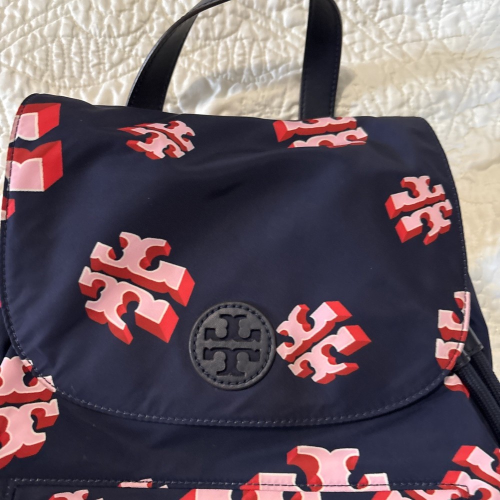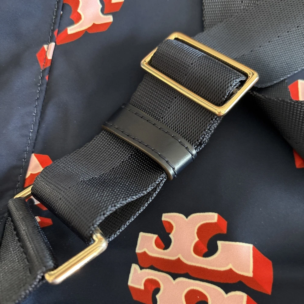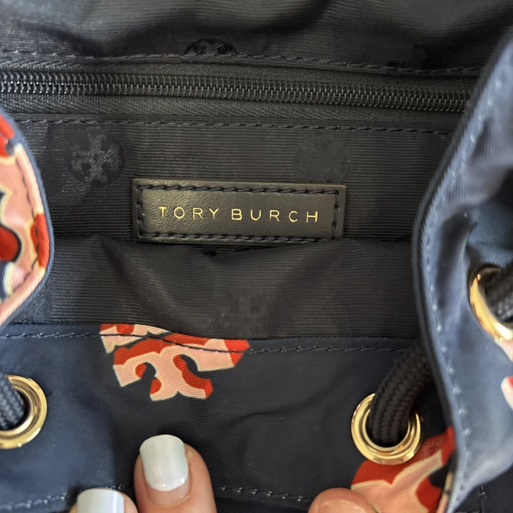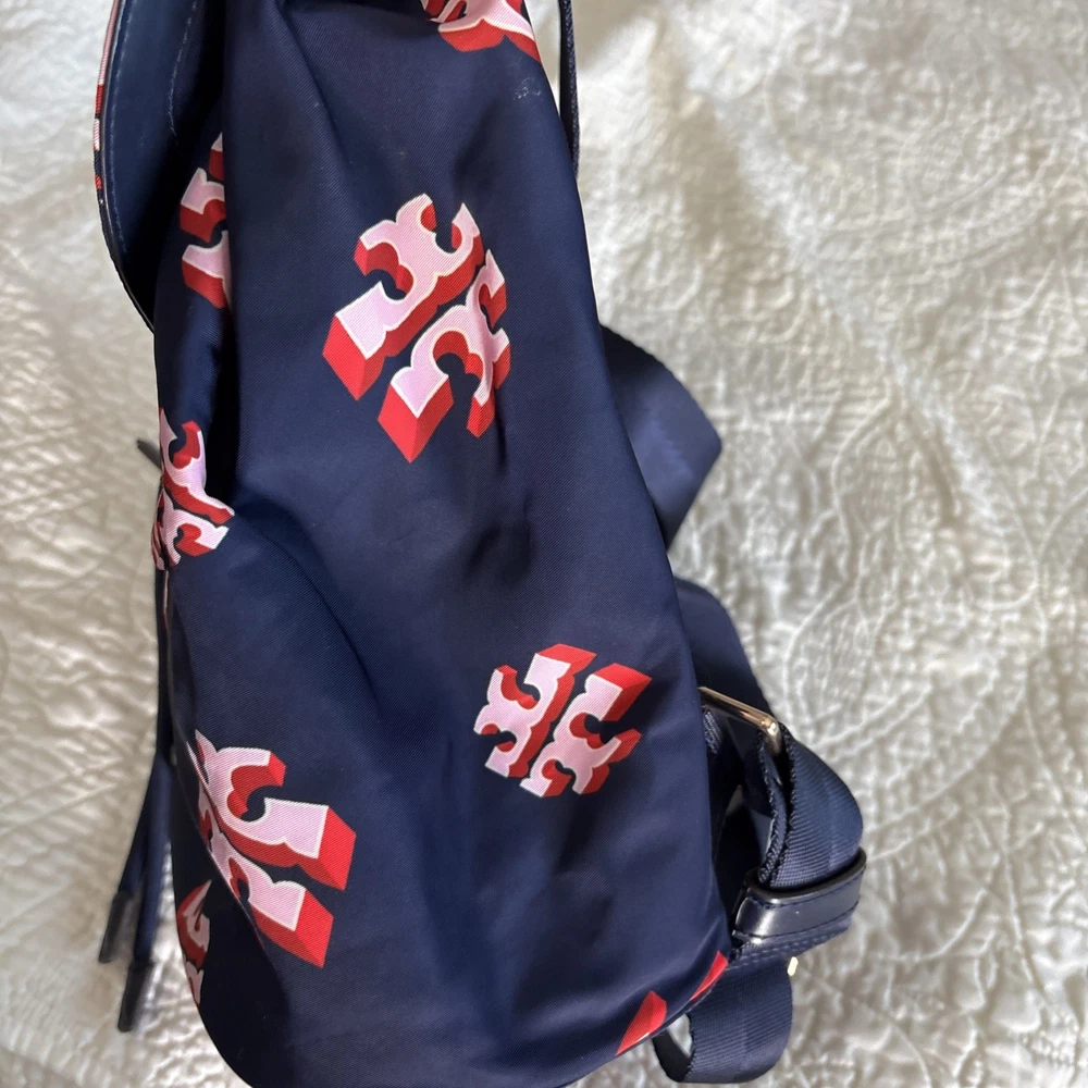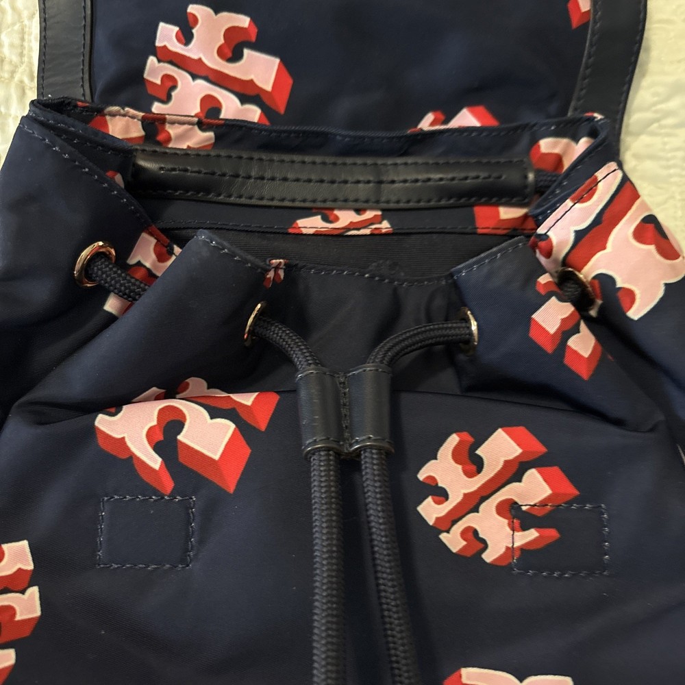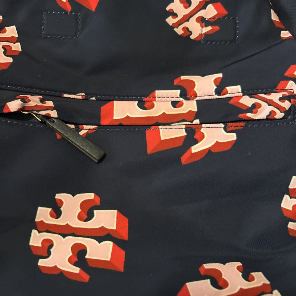 Vintage: No Exterior Material: Nylon Department: Women Occasion: Casual, Travel Exterior Color: Navy Customized: No Style: Backpack Size: Medium Features: Adjustable Strap Handle/Strap Material: Leather Closure: Zip Accents: Zipper Pattern: Logo Theme: Designer Character: Tori Brand: Tory Burch Personalize: No Handmade: No