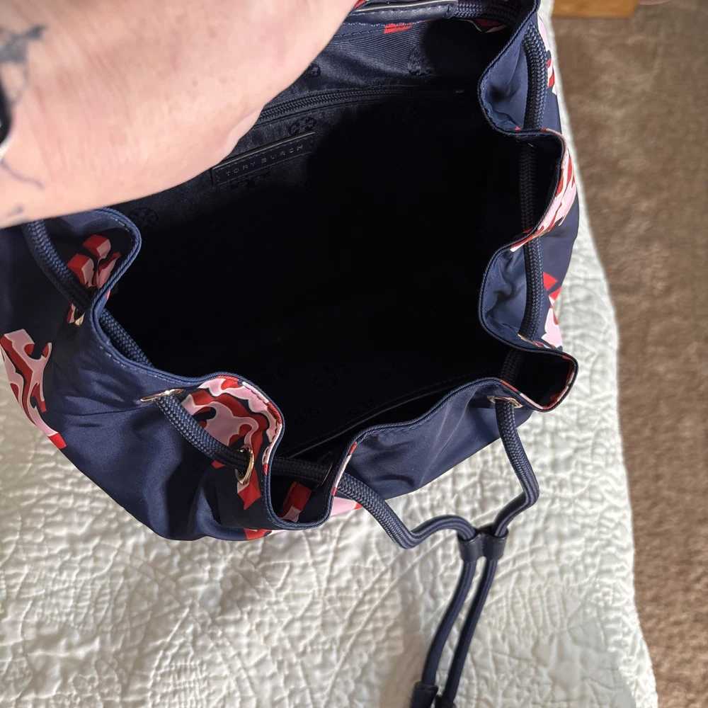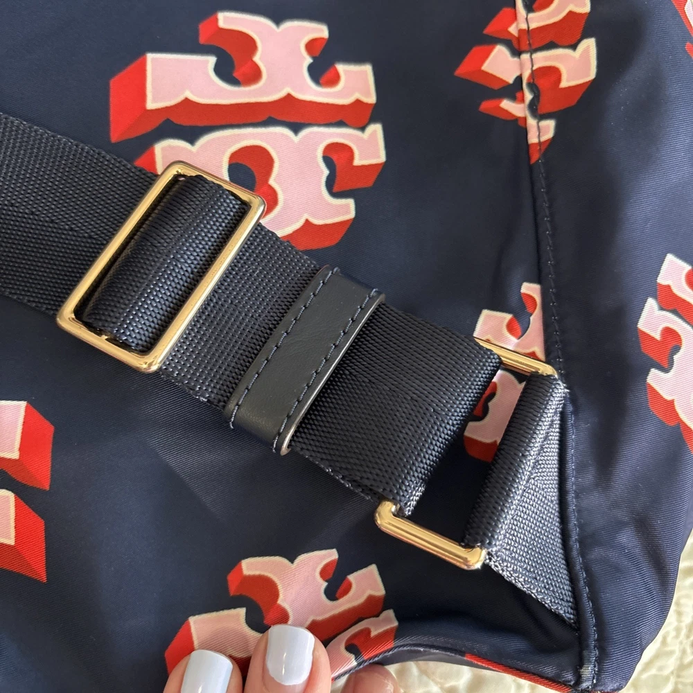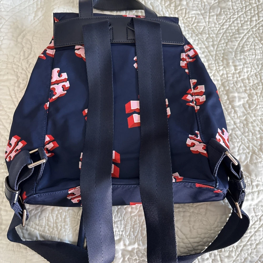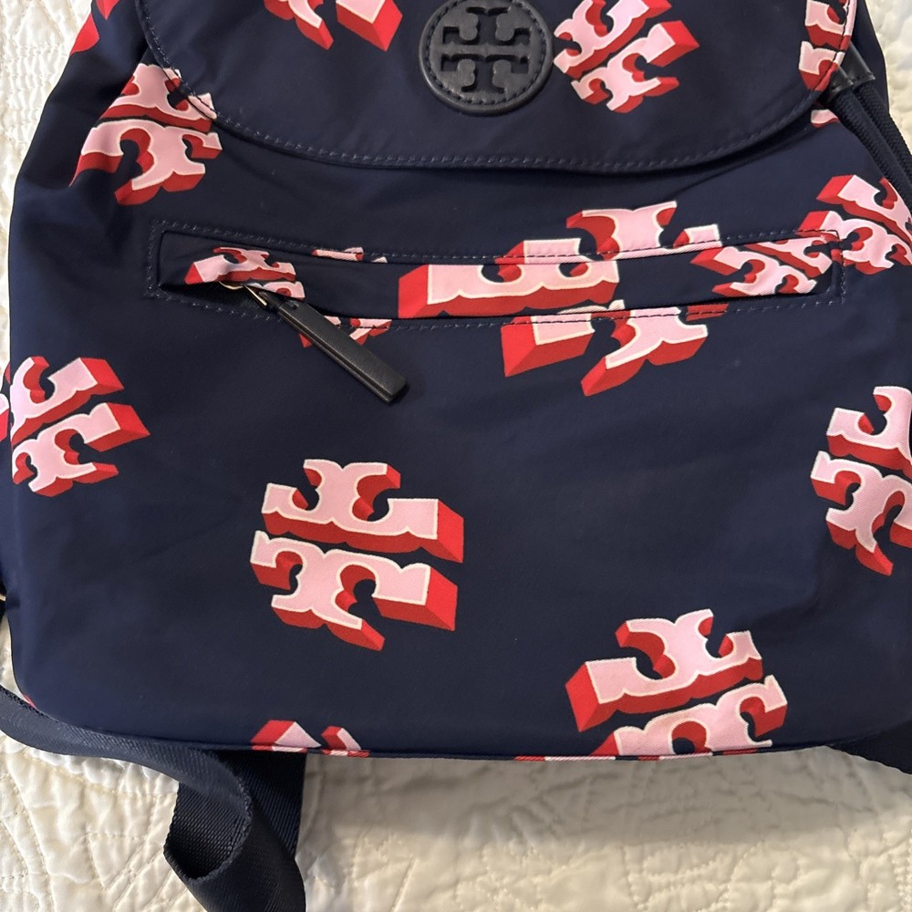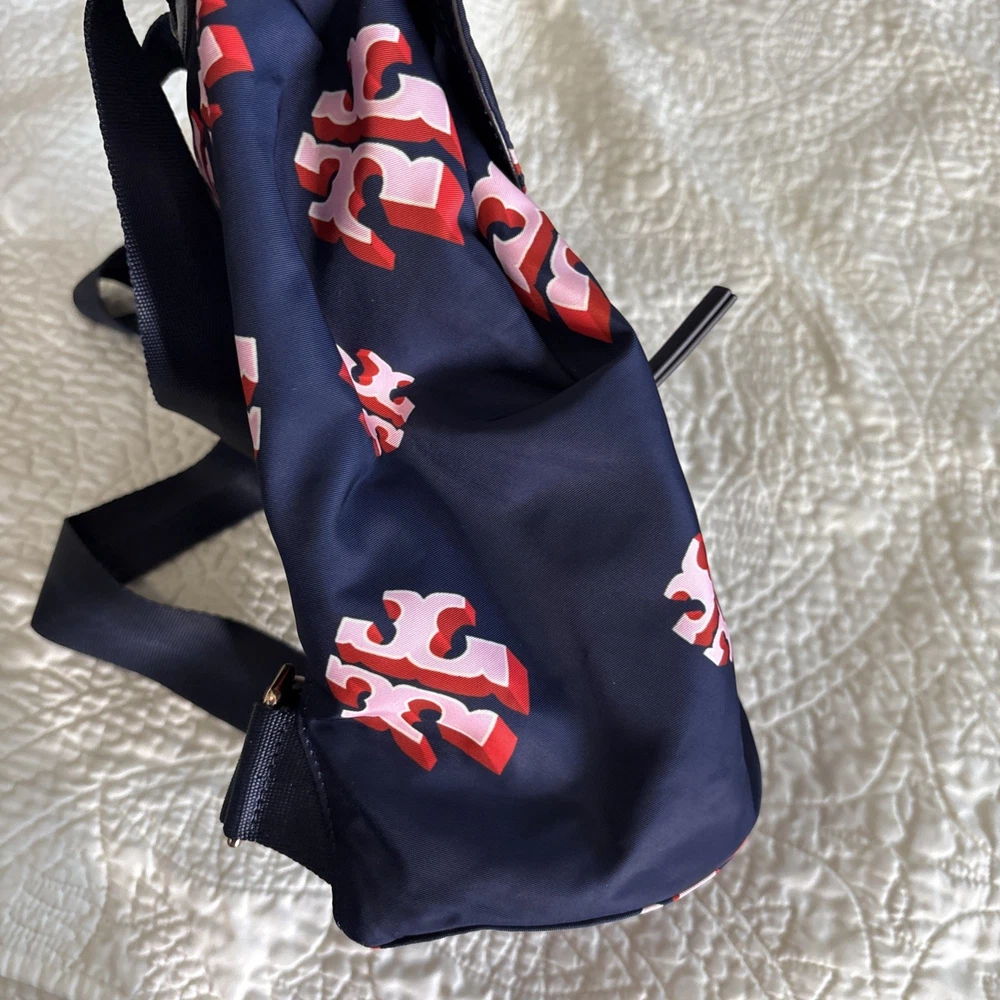 Vintage: No Exterior Material: Nylon Department: Women Occasion: Casual, Travel Exterior Color: Navy Customized: No Style: Backpack Size: Medium Features: Adjustable Strap Handle/Strap Material: Leather Closure: Zip Accents: Zipper Pattern: Logo Theme: Designer Character: Tori Brand: Tory Burch Personalize: No Handmade: No
