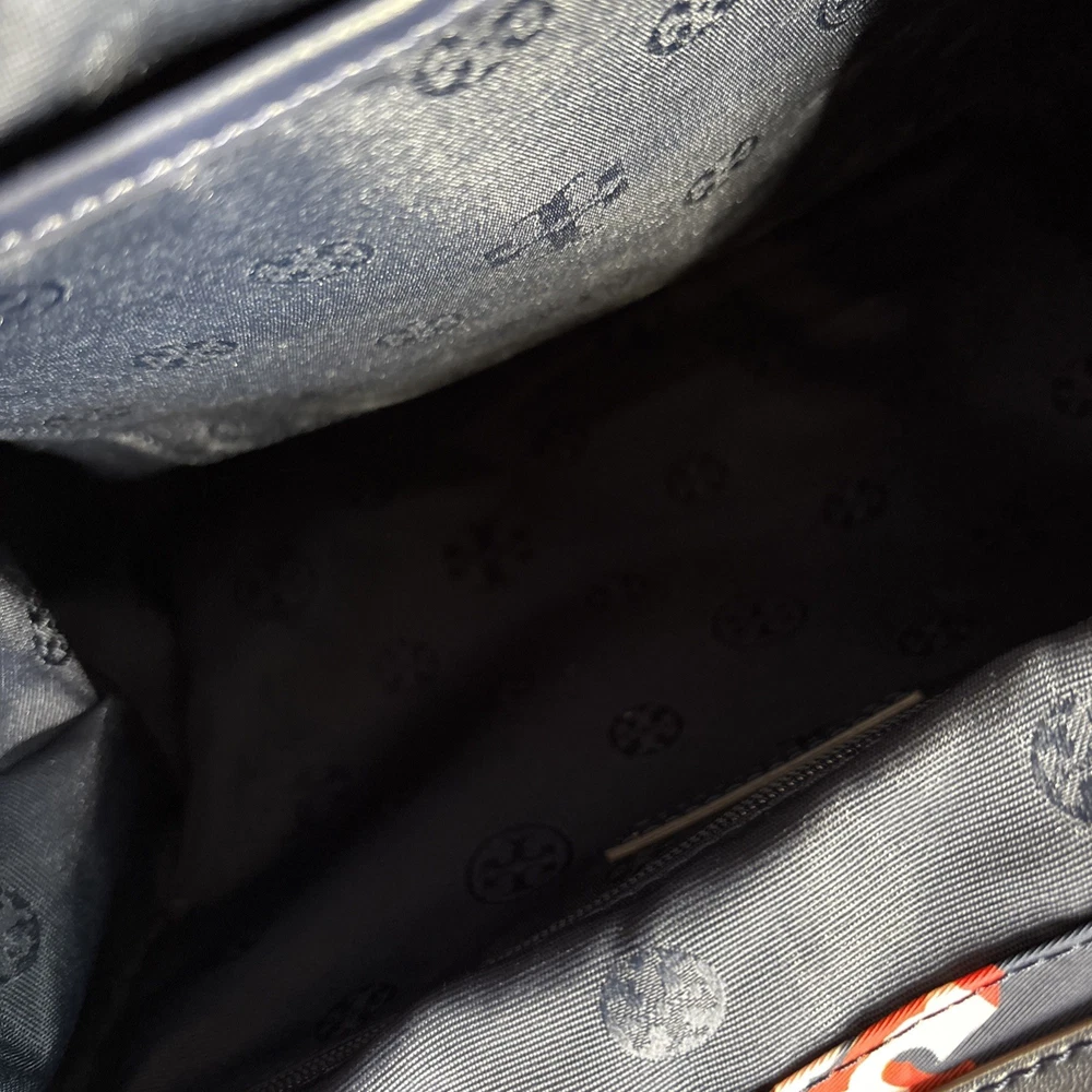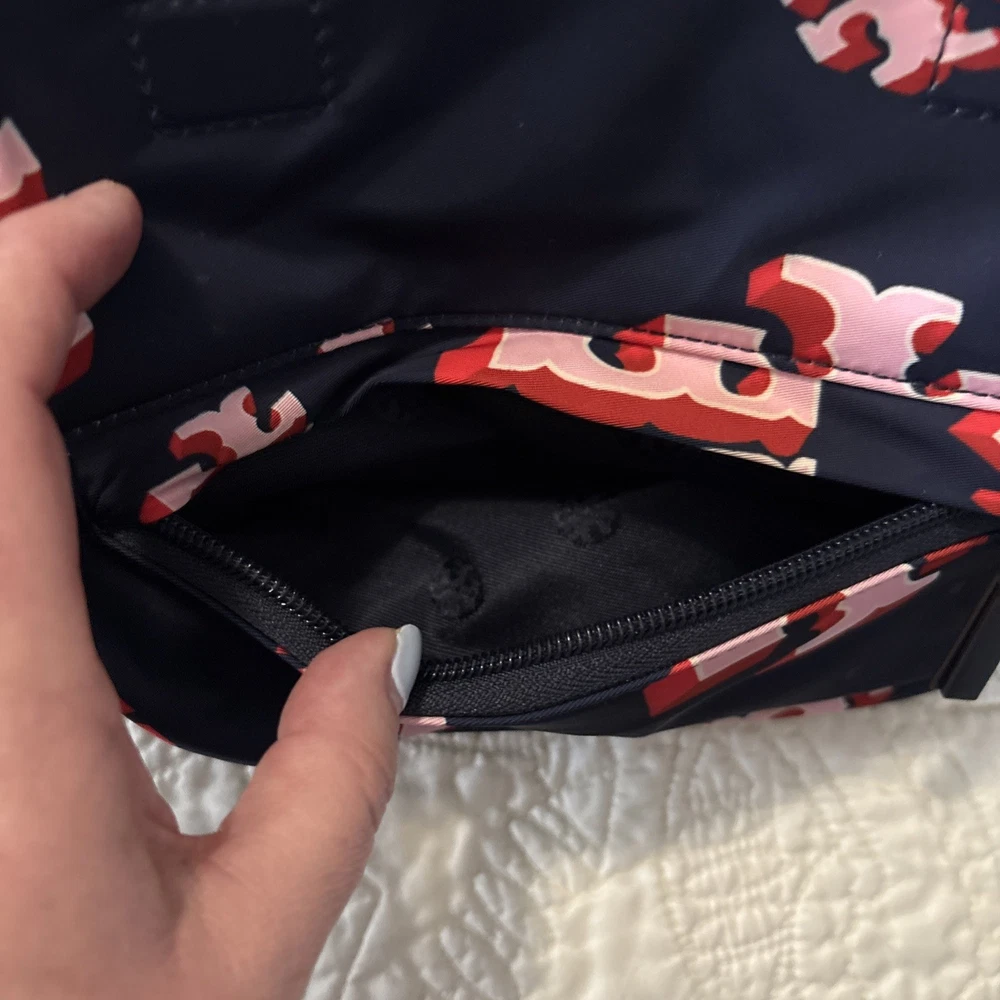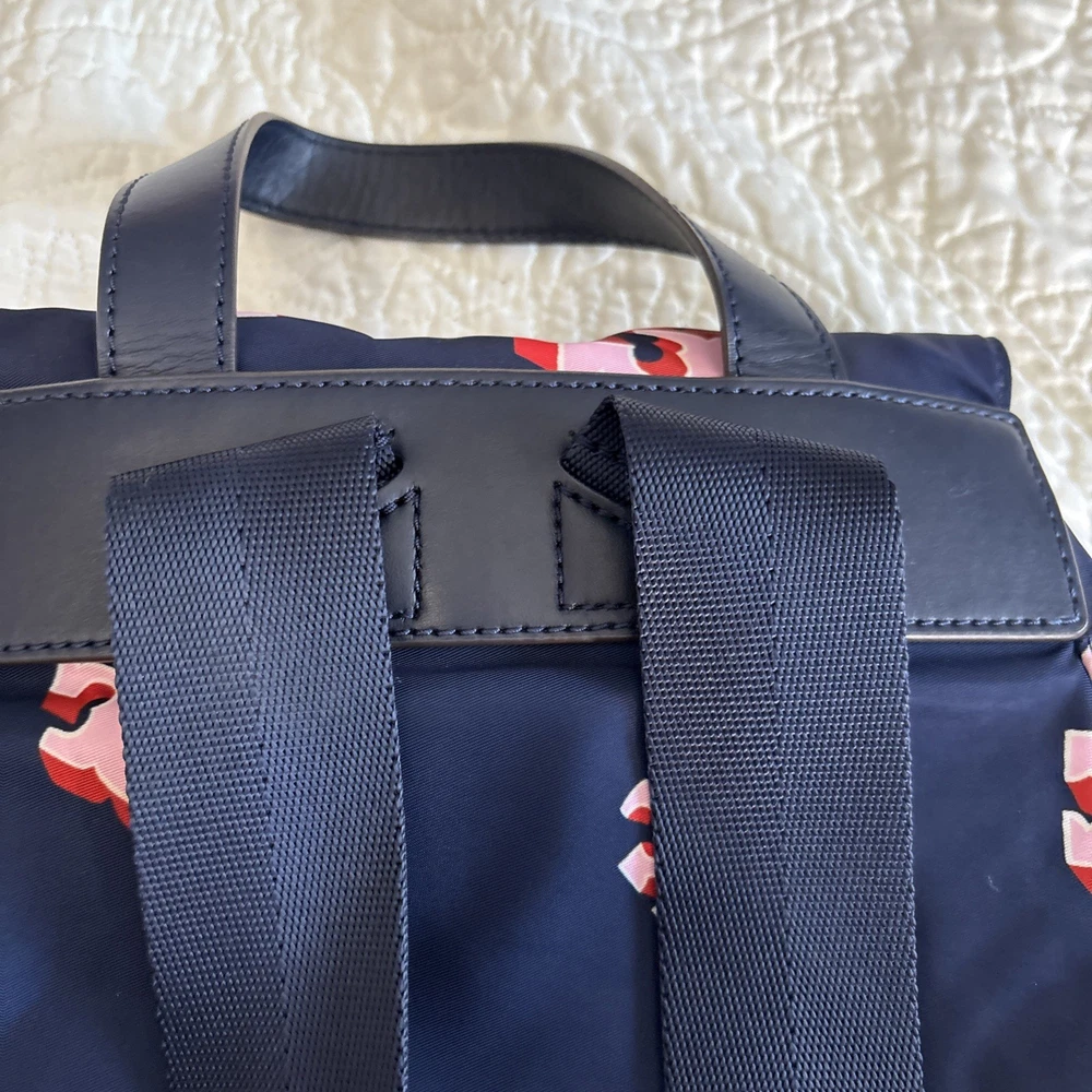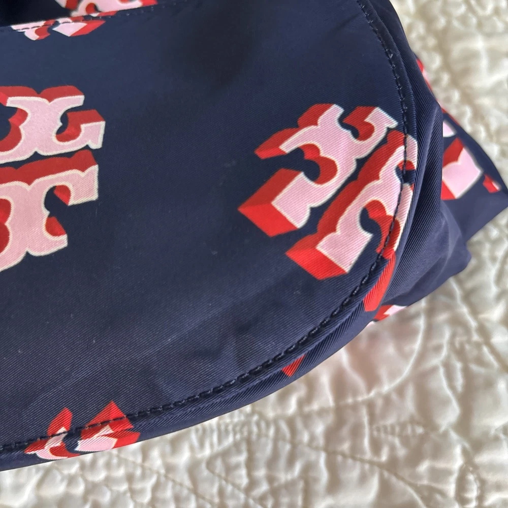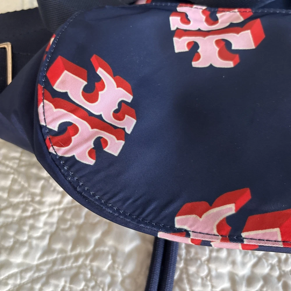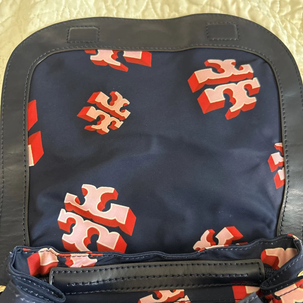 Vintage: No Exterior Material: Nylon Department: Women Occasion: Casual, Travel Exterior Color: Navy Customized: No Style: Backpack Size: Medium Features: Adjustable Strap Handle/Strap Material: Leather Closure: Zip Accents: Zipper Pattern: Logo Theme: Designer Character: Tori Brand: Tory Burch Personalize: No Handmade: No