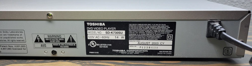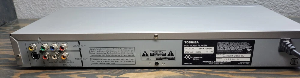 Playable Disc Formats:DVDRecordable Media Format:DVD+RType:DVD PlayerConnectivity:Digital Audio Coaxial RCA, Composite Video RCA, S-VideoModel:Toshiba SD-K730SUCustom Bundle:NoCountry/Region of Manufacture:ChinaPlayable Media Format:DVD VideoBrand:ToshibaColor:Silver