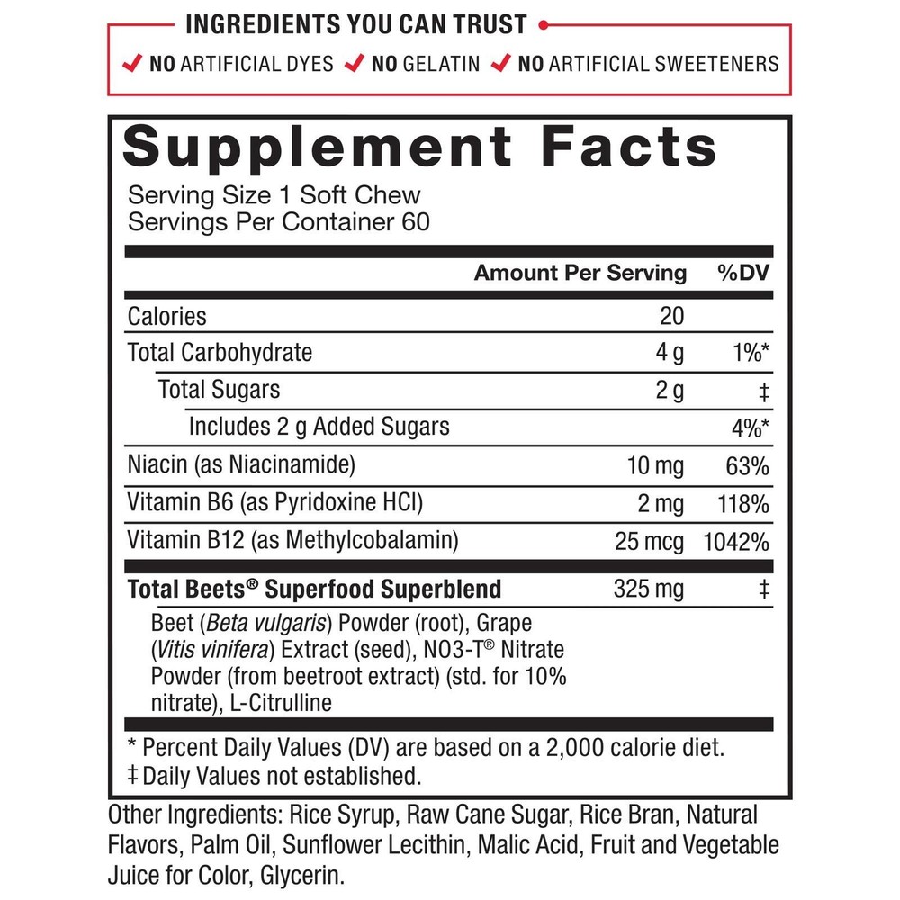 CONTACT US DIRECTLY FOR FREE & PREPAID RETURNS Total Beets Heart Healthy Energy Chews 60 Count Berry Flavor Soft Chews HEART-HEALTHY ENERGY Too many energy supplements are designed without heart health in mind. Some energy boosters — stimulant-packed energy drinks, for instance — can narrow blood vessels, which forces your heart to work harder to pump blood throughout your body. That’s why the scientists at Force Factor developed Total Beets soft chews as a safe source of heart-healthy energy. These delicious chews include nitrates and antioxidants, and help give you an anytime energy boost to tackle whatever life throws your way. This superfood formula features both beetroot powder and beetroot extract, blended together with antioxidant-rich grapeseed extract in a naturally flavored, tasty açaí berry chew with no bitter beet aftertaste. No matter what you are looking to accomplish, Total Beets soft chews help deliver a clear boost of energy specifically formulated with cardiovascular health in mind so you can fully Unleash Your Potential. Features: HEART-HEALTHY ENERGY: Total Beets soft chews are a safe source of heart-healthy energy, with no stimulants or artificial sugars, giving you an anytime energy boost to tackle whatever life throws your way. Plus, they are convenient when you're on the go Product Note: Exposure to heat or sunlight may lead to melting/damage of product. Hence customers are expected to be available during the product delivery PREMIUM INGREDIENTS: This superfood formula features both beetroot powder and beetroot extract, blended together with antioxidant-rich grapeseed extract and the amino acid L-citrulline, for 650mg of daily cardiovascular support. EASY TO TAKE: These guilt-free, individually wrapped Total Beets soft chews are portable and fun to eat, with no need to mix into water. Just unwrap, chew, and enjoy a clear boost of heart-healthy energy whenever and wherever your day takes you. AMAZING TASTE: Beets are polarizing. Some people love the taste, some people hate it. Total Beets soft chews taste amazing, with a delicious açaí berry flavor that masks virtually all of the raw beet notes. And better yet, no juicing required MADE IN USA: Force Factor vitamins and supplements are expertly formulated with premium, globally sourced ingredients that are carefully tested for quality and potency. They are produced in GMP-certified facilities right here in the USA. REVIEWS The product came very well packaged. I'm very happy. thank you for everything. Seller strongly recommended. This is great! I definitely recommend! Product looks amazing Delivery was fast. Excellent seller, great communication. I advise everyone