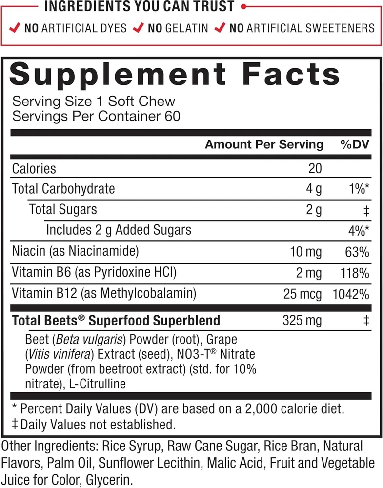 Total Beets Soft Chews with Beetroot, Nitrates, L-Citrulline, Grapeseed Extract, and Antioxidants, Healthy Energy Supplement with Elite Ingredients, Heart Health Superfood, 60 Chews HEART-HEALTHY ENERGY: Total Beets soft chews are a safe source of heart-healthy energy, with no stimulants or artificial sugars, giving you an anytime energy boost to tackle whatever life throws your way. Plus, they are convenient when you're on the go Product Note: Exposure to heat or sunlight may lead to melting/damage of product. Hence customers are expected to be available during the product delivery INGREDIENTS: This superfood formula features both beetroot powder and beetroot extract, blended together with antioxidant-rich grapeseed extract and the amino acid L-citrulline, for 650mg of daily cardiovascular support. EASY TO TAKE: These guilt-free, individually wrapped Total Beets soft chews are portable and fun to eat, with no need to mix into water. Just unwrap, chew, and enjoy a clear boost of heart-healthy energy whenever and wherever your day takes you. AMAZING TASTE: Beets are polarizing. Some people love the taste, some people hate it. Total Beets soft chews taste amazing, with a delicious açaí berry flavor that masks virtually all of the raw beet notes. And better yet, no juicing required MADE IN USA: vitamins and supplements are expertly formulated with , globally sourced ingredients that are carefully tested for quality and potency. They are produced in GMP-certified facilities right here in the USA. HEART-HEALTHY ENERGY Too many energy supplements are designed without heart health in mind. Some energy boosters — stimulant-packed energy drinks, for instance — can narrow blood vessels, which forces your heart to work harder to pump blood throughout your body. That’s why the scientists at developed Total Beets soft chews as a safe source of heart-healthy energy. These delicious chews include nitrates and antioxidants, and help give you an anytime energy boost to tackle whatever life throws your way. This superfood formula features both beetroot powder and beetroot extract, blended together with antioxidant-rich grapeseed extract in a naturally flavored, tasty açaí berry chew with no bitter beet aftertaste. No matter what you are looking to accomplish, Total Beets soft chews help deliver a clear boost of energy specifically formulated with cardiovascular health in mind so you can fully Unleash Your Potential.