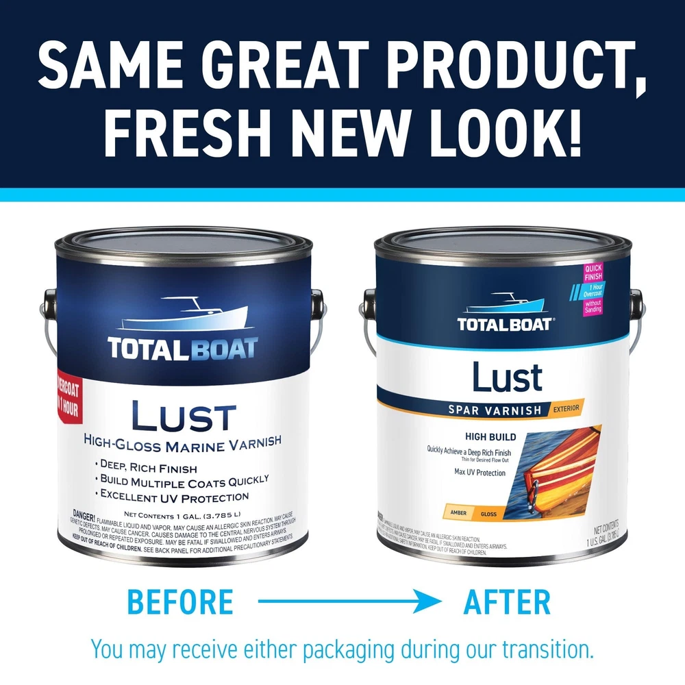 TotalBoat-482869 Lust Marine Varnish, High Gloss and Matte Finish for Wood, Boats, Outdoor Furniture (High Gloss, Quart) Product Details Color: High Gloss Size: Quart Brand: TotalBoat MPN: 482869 UPC: 811932021564 EAN: 0811932021564 Brand: TotalBoat Material: Oil and Resin Finish Type: High-Gloss Compatible Material: Wood Coverage: 750 sq ft/gal (1 mil thickness), 250 sq ft/gal (3 mils thickness) Recommended Uses For Product: Exterior, Interior Liquid Volume: 1 Quarts Item Form: Liquid Manufacturer: TotalBoat UPC: 811932021564 Part Number: 482869 Item Weight: 2.18 pounds Product Dimensions: 4.2 x 4.3 x 4.7 inches Country of Origin: USA Item model number: 482869 Is Discontinued By Manufacturer: No Size: Quart Color: High Gloss Finish: High-Gloss Item Package Quantity: 1 Included Components: Varnish Batteries Included?: No Batteries Required?: No Date First Available: August 19, 2015 MARINE GRADE VARNISH imparts a rich, clear amber tone that enhances wood grain; creates a durable, uv resistant, waterproof finish that won't fade; ideal for interior and exterior wood, brightwork on boats & outdoor furniture CLASSIC SPAR VARNISH WITH A MODERN TWIST: High-build, fast-drying formula allows rapid recoating, multiple coats per day and no sanding between coats; sand lightly before the final coat - be done in a little over 1 day FLEXIBLE COATING WON'T CRACK OR PEEL: Premium, oil-based marine polyurethane finish is not damaged when wood expands and contracts with changes in temperature; perfect for all types of wood EASY TO APPLY by brushing, rolling or spraying; For a high gloss varnish finish apply 6-8 coats of Lust Gloss; for a smooth satin finish, build with coats of Lust gloss varnish; use Lust Matte for the finish coats AVAILABLE IN HIGH GLOSS OR MATTE FINISH in Pint, Quart and Gallon sizes; Thinner: TotalBoat Special Brushing Thinner 100 (brushing/rolling) or TotalBoat Spray Thinner 101 (spraying); Coverage: 360-400 sq. ft./gallon Lust is the first true one-part marine spar varnish that lets you finish any varnish job faster because you can apply multiple coats in one day - without sanding between coats. It cures to a warm, rich, clear amber tone with a high gloss or matte finish that looks spectacular on all types of interior and exterior marine and household wood, including teak brightwork, toe rails, hand rails, trim, doors, cabinets, outdoor patio furniture, bar tops, tabletops, and more. This marine varnish is truly an exciting innovation because you can recoat Lust in as little as 1 hour at 72 degrees F, ultimately applying up to 5 coats in one day! You can't do that with traditional marine varnishes that require tedious sanding between coats, and that have a thin film build requiring 10 or more coats. There are also marine wood finishes that mimic the look of varnish but are no substitute for the real thing. TotalBoat Lust has a linseed oil modified polyurethane formula for smooth flow-out, and is easy to apply by brushing, rolling, or spraying. Its unique formula also makes Lust flexible when it cures, similar to tung oil varnishes. Flexibility is very important in exterior applications because wood tends to contract and expand with seasonal outdoor temperature and humidity changes. And compared to exterior polyurethane, Lust has stronger UV properties that make it a perfect choice for boat brightwork, teak, household trim, exterior doors, wood sculpture and artwork, and more. Available in a High Gloss Varnish or Matte Varnish finish. Compare to Epifanes Clear Varnish, Wood Finish Matte, Wood Finish Gloss, Pettit Flagship Varnish, Z Spar Captain's Varnish, Minwax Helmsman Spar Urethane, Varathane Spar Varnish, Rust-Oleum Marine Spar Varnish, System Three Clear Marine Spar Urethane Varnish Coating, and Old Masters Spar Marine Varnish. All TotalBoat products provide great value and great results. 100% made in the USA.