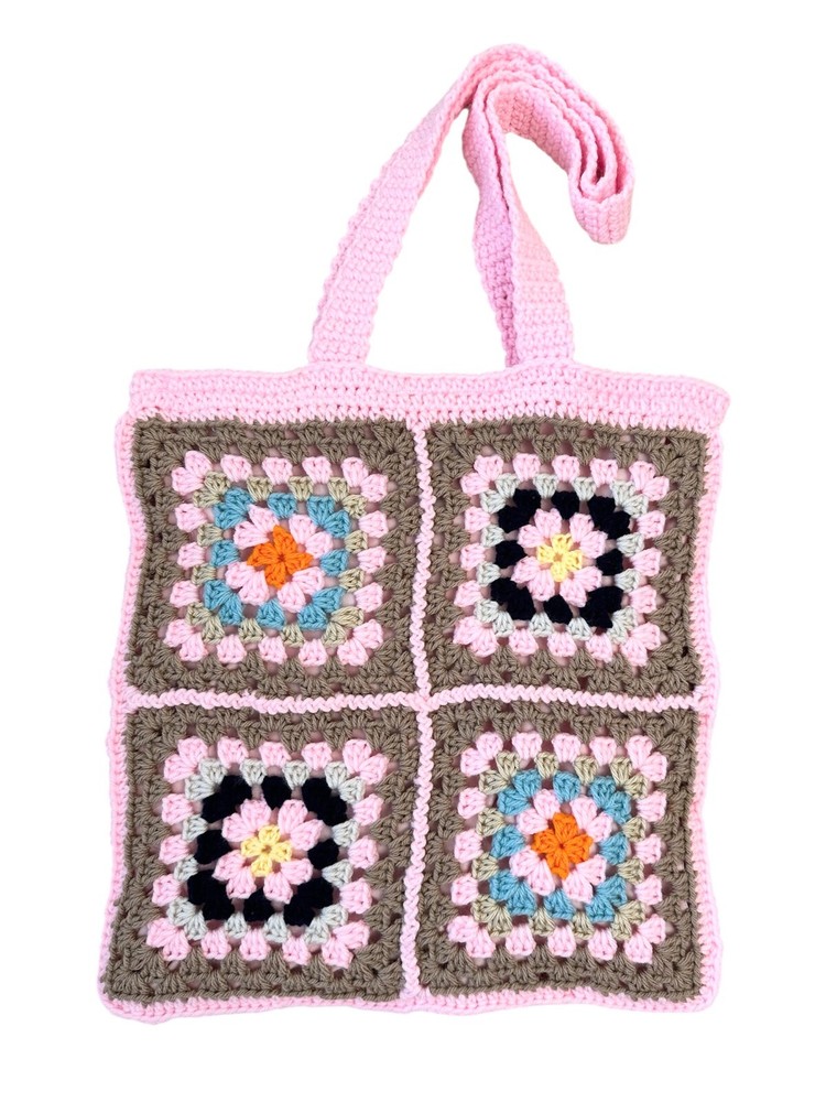 Features: Pockets Vintage: No Occasion: Casual, Party/Cocktail, Travel, Workwear Country of Origin: United States Exterior Color: Multicolor Brand: Handmade Closure: No Closure Shape: Square Accents: Crochet Size: Large Lining Color: Pink Handle/Strap Color: Pink Exterior Material: Acrylic Handle Style: Shoulder Strap Bag Width: 15 in Bag Height: 16 in Department: Women Handle/Strap Material: Acrylic Strap Drop: 14.5 inches Style: Tote Personalize: No Model: Granny Lining Material: Cotton Handmade: Yes Pattern: Granny Square