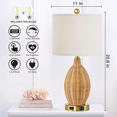 Menu 1. We require immediate payment. 2. We currently accept payment via eBay managed payments only. 3. Once payment is cleared, we will dispatch your shipment within 1-3 business days. Please refer to the "Shipping" tab for more information regarding shipping speed to your destination. Touch Control Rattan Table Lamps, 3 Way Dimmable Bedside Lamps for Bedroom Set of 2 with 2 USB Ports and AC Outlet, Gold Wicker Nightstand Lamps for Living Room Office (LED Bulbs Included) Product description 【Handmade Natural Rattan Style】Boho table lamps for living room not only illuminate your home, but are a unique handicraft which is perfect integration of nature and home that adds vitality and elegance to your space. This dimmable table lamp is made of rattan, hand-woven by skilled artisans. Sturdy frame is wrapped with rattan in a unique way and finished in a natural linen beige lampshade that blends well with versatile furnishing style like coastal / nautical / seaside / natural style. 【3-Way Dimmable Touch Control】Our woven living room table lamps are designed with three level brightness to meet your different needs for lighting. Just lightly tap on anyw of lamp base to make quickly change brightness level, and response sensitively without delay, saving you from the trouble of fumbling with the switch in the dark. Low-grade is a perfect nightlight for sleeping or nursing, mid-grade is ideal for daily use, and high-grade is excellent for reading, studying and working. 【Professional LED Bulb & Eye-Caring Shade】The bedside lamp with usb port comes with A19 LED Bulb,800 lumens,2700k, with a 25,000 hour lifespan,it will save up to 90% energy. Natural linen beige lampshade softens the light and provides comfortable and natural light, no flicker, no dazzle, has an effect on preserve eyesight. It's perfect decorative lamps to any living room, dining room, bedroom, entry or office. 【SAFE USB Charging Ports and AC Outlet】Are you botd by the lack of charging ports when want to charge? The Built in Dual 5V/2.1A USB Charging Ports and 120V AC power outlet, allowing you to quickly charge 3 DEVICES at the same time, no worries about now to charge your phones, tablets, speaker, etc. The charging function is available whether the rustic table lamp is on or off. Reduce the clutter of wall chargers or outlets while keeping your desk cleaner and tidier. 【60 Months & Quick Service Response】 We are strict about the quality of modern table lamps. All touch lamps for bedrooms have passed the UL standard testing to ensure product safe. Any problem or inquires, please don't hesitate to contact us directly via , please feel free to contact us, we will provide you with a 100% satisfying after-sales service. PLEASE MESSAGE US IF YOU HAVE ANY OTHER QUESTIONS, AND MANY THANKS FOR READING ALL OF THIS. Copyright ©#. All Rights Reserved.