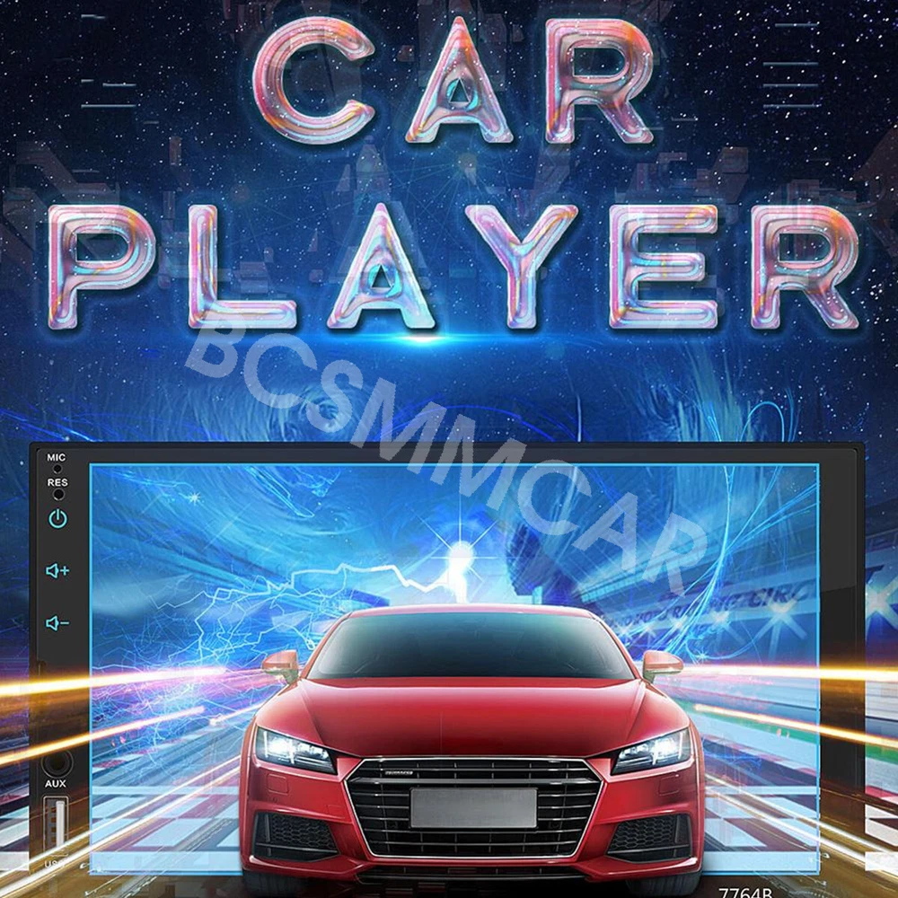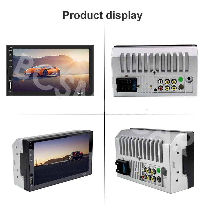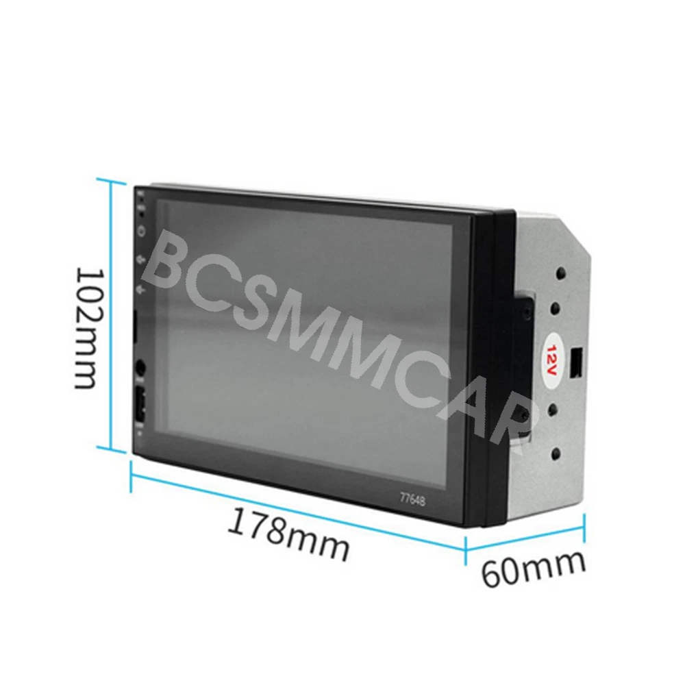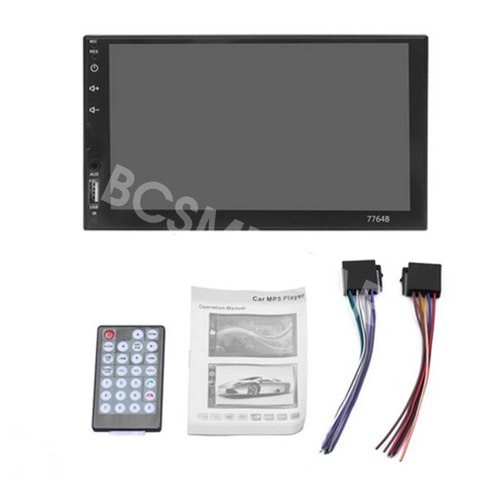 7 Inch Double 2 DIN Stereo Radio Car MP5 Player Bluetooth Touch Screen Audio Feature: Main product function:Mirror Link+ capacitive touch screen + aux Product parameters: Product model: SWM-7764B Type: Touch MP5 Decoding chip: quanzhi c2005 System: WINCE Screen size: 7 in Net product weight: about 500g 1024 * 600 screen resolution Mobile phone interconnect: bidirectional interconnect from android and iPhone version below 8P support Radio chip: QN8035 Amplifier chip: TDA7388 Audio frequency (band): fm 87.5 m-108 m (fm1 / fm2 / fm3) Bluetooth: Bluetooth 4.0 version SD card slot: TF memory card Standby time: support Mobile phone charging: support most mobile phones Steering wheel control (original car): support Button light: seven colors Playback mode: usb card / tf / aux / bluetooth 4.0 (password: 0000) USB interface: 2.0 interface to play music / video / images Flipping image: support (requires optional camera) Output terminal: 2 channels of audio output, 1 way of reverse input, 1 channel of video input, 2 channels of video output Image format: jpg / gif Audio format: mp3 / wma / wav / flac Video format: rm / rmvb / avi / mp4 / mkv / 3gp (with resolution less than 720 p) Product size: 178mm * 102mm * 60mm Language: support Chinese / English / Spanish / Portuguese / Russian / Italian / German / French / Polish / Turkish and 24 other languages Machine list: Host * 1, Power cord * 1, Manual * 1, Remote control * 1(The remote control battery (not included): CR2025 3V)