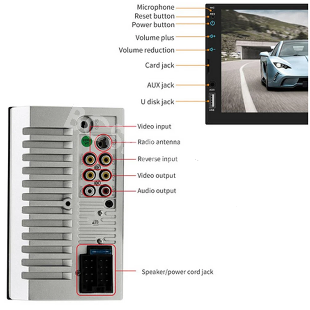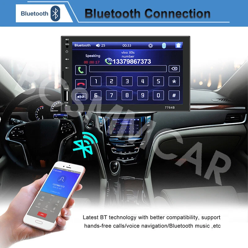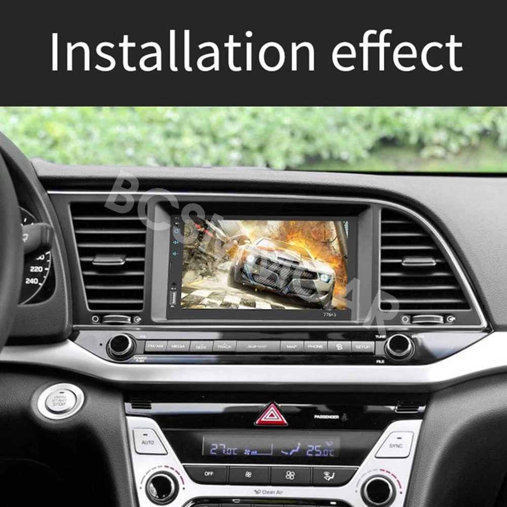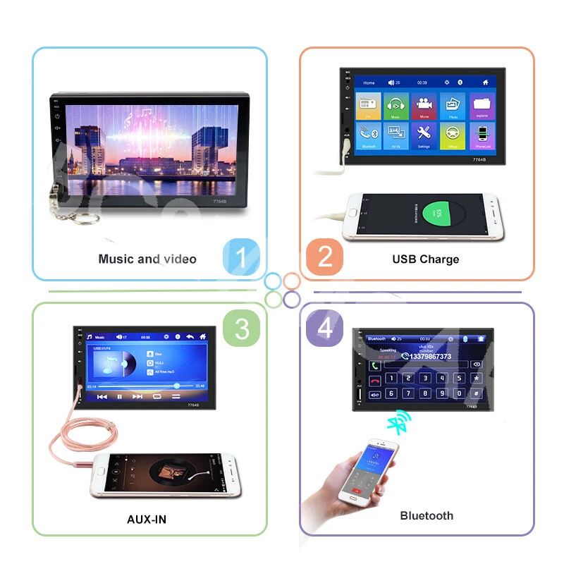 7 Inch Double 2 DIN Stereo Radio Car MP5 Player Bluetooth Touch Screen Audio Feature: Main product function:Mirror Link+ capacitive touch screen + aux Product parameters: Product model: SWM-7764B Type: Touch MP5 Decoding chip: quanzhi c2005 System: WINCE Screen size: 7 in Net product weight: about 500g 1024 * 600 screen resolution Mobile phone interconnect: bidirectional interconnect from android and iPhone version below 8P support Radio chip: QN8035 Amplifier chip: TDA7388 Audio frequency (band): fm 87.5 m-108 m (fm1 / fm2 / fm3) Bluetooth: Bluetooth 4.0 version SD card slot: TF memory card Standby time: support Mobile phone charging: support most mobile phones Steering wheel control (original car): support Button light: seven colors Playback mode: usb card / tf / aux / bluetooth 4.0 (password: 0000) USB interface: 2.0 interface to play music / video / images Flipping image: support (requires optional camera) Output terminal: 2 channels of audio output, 1 way of reverse input, 1 channel of video input, 2 channels of video output Image format: jpg / gif Audio format: mp3 / wma / wav / flac Video format: rm / rmvb / avi / mp4 / mkv / 3gp (with resolution less than 720 p) Product size: 178mm * 102mm * 60mm Language: support Chinese / English / Spanish / Portuguese / Russian / Italian / German / French / Polish / Turkish and 24 other languages Machine list: Host * 1, Power cord * 1, Manual * 1, Remote control * 1(The remote control battery (not included): CR2025 3V)