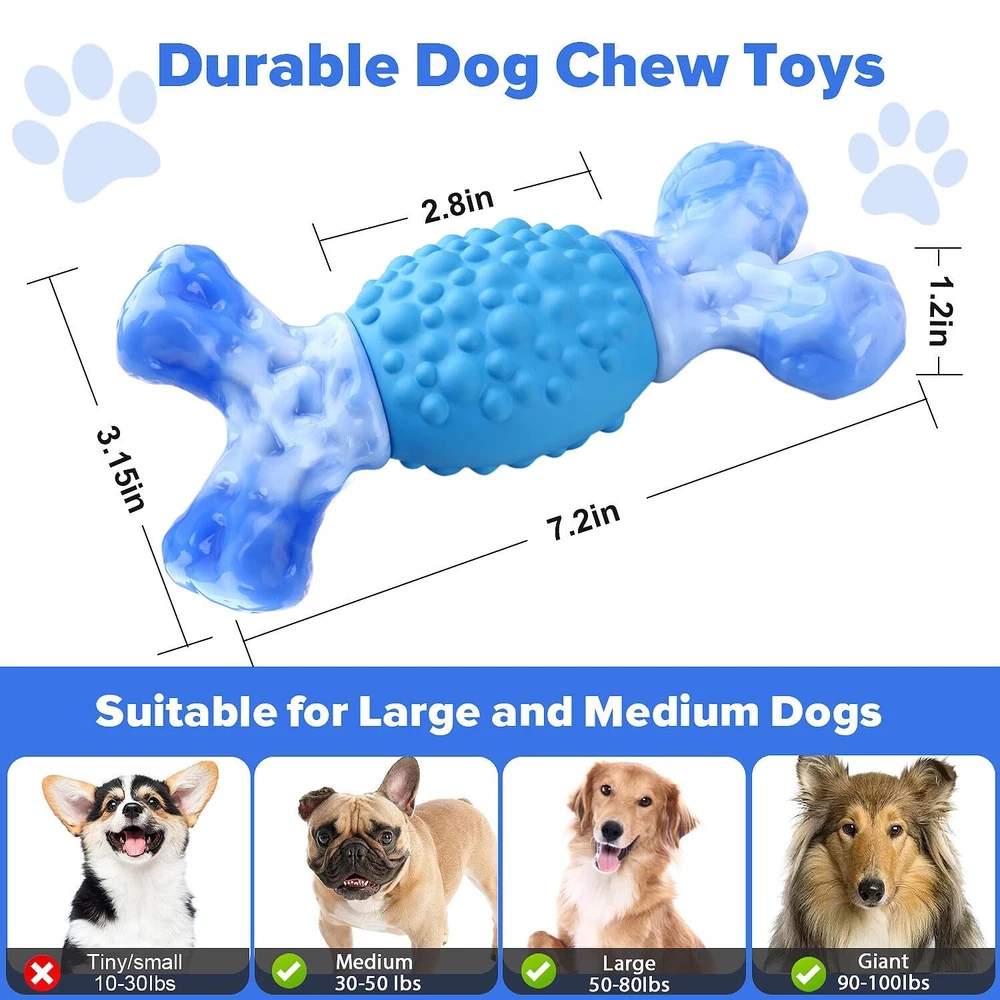 Tough Dog Toys for Aggressive Chewers, Almost Indestructible Dog Chew Toys for Medium Large Breed, Sturdy Aggressive Chew Dog Toys to Keep Them Busy, Dog Chew Bones Toy for Long Lasting (Blue) Indestructible & Long Lasting: This dog chew toys for aggressive chewers suitable for medium and large dogs. The dog enrichment toys are tough, ensuring long-lasting chewing. No need to worry about frequent replacements due to breakage. Safety Special Design: The indestructible dog toys are crafted from high-quality food-grade nylon and natural rubber. The combination offers a textured dual chewing experience that promotes extended chewing duration and facilitates the release of your pet's energy. Dental Care and Health: Apply a thin layer of toothpaste to the surface of long lasting dog chew bones can help clean your dog's teeth and mouth. Using premium tough dog toys for aggressive chewers can help dogs develop good chewing habits, which can improve their oral hygiene and overall health. Irresistible Milk Flavor: Tough dog chew toys release a slight milk scent, while the 100% real milk flavor will entice your dog to drool and encourage them to engage in repeated chewing, providing ample play time. Excellent After-sales Service: We recommend regular inspections and supervision when using tough chew toys for your dogs. If you encounter any problems, you can get in touch with us, we will undoubtedly offer you a satisfactory solution within 24 hours. About is a brand dedicated to providing safe and high-grade pet products. We are a team of pet lovers who carefully design the premium pet product. Safety Dog Bone Toys High-quality food-grade nylon and natural rubber ensure the safety of the dog bones for aggressive chewers, suitable for large and medium dogs . Don't Let Your Pup Get Bored This sturdy aggressive chew dog toys perfect for keeping them busy and satisfied, with their long-lasting design, they are built to endure constant chewing. Promise of , as a responsible seller, upon your purchase of our products, should you encounter any problem, you can get in touch with us. We will undoubtedly offer you a 100% satisfactory solution. Every email you send to us will be replied to within 24 hours. Shipping We offer FREE shipping on all orders! We ship within Three business days of payment, usually sooner. We use a selection of shipping services such as UPS, FedEx, USPS etc. We only ship to the lower 48 states, no APO/FPO addresses or PO Boxes allowed. Local pickups and combined shipping options are not provided at this time. Return You can return a product for up to 30 days from the date you purchased it. Any product you return must be in the same condition you received it and in the original packaging. Please keep the receipt. Payment We accept payment by any of the following methods: PayPal Please pay as soon as possible after winning an auction, as that will allow us to post your item to you sooner! Feedback Customer satisfaction is very important to us. If you have any problem with your order, please contact us and we will do our best to make you satisfied. Contact Us If you have any queries, please contact us via ebay. We usually respond within 24 hours on weekdays. Please visit our eBay store to check out other items for sale! Thank you for shopping at our store.