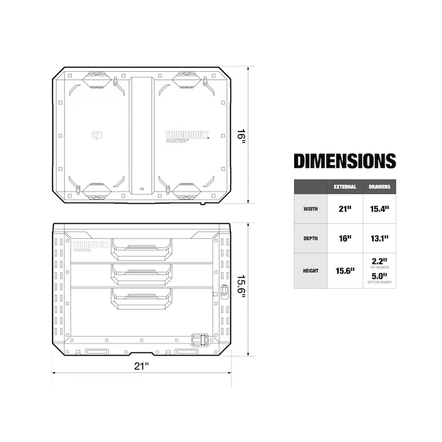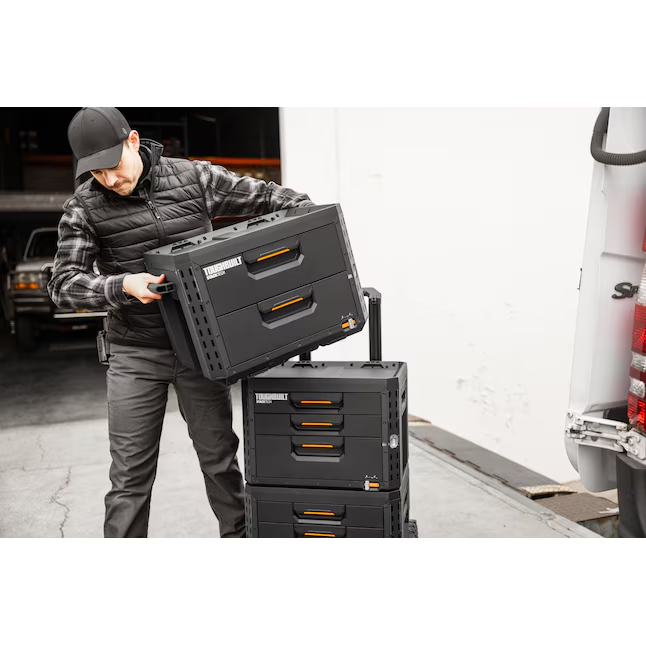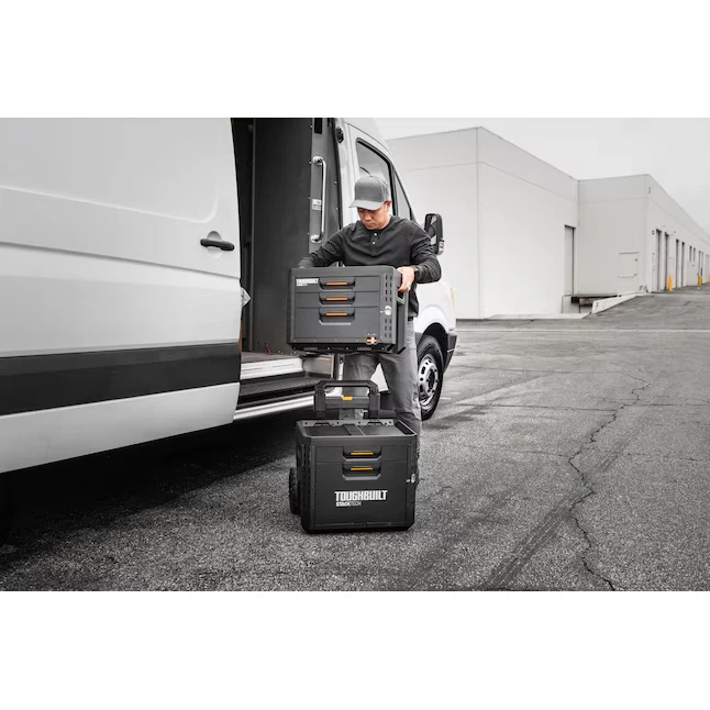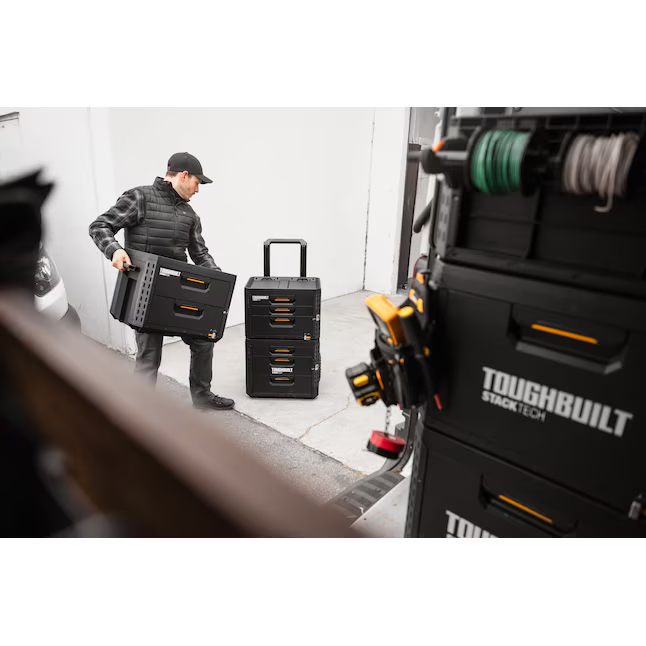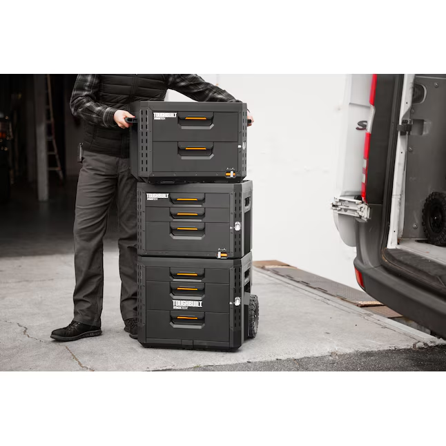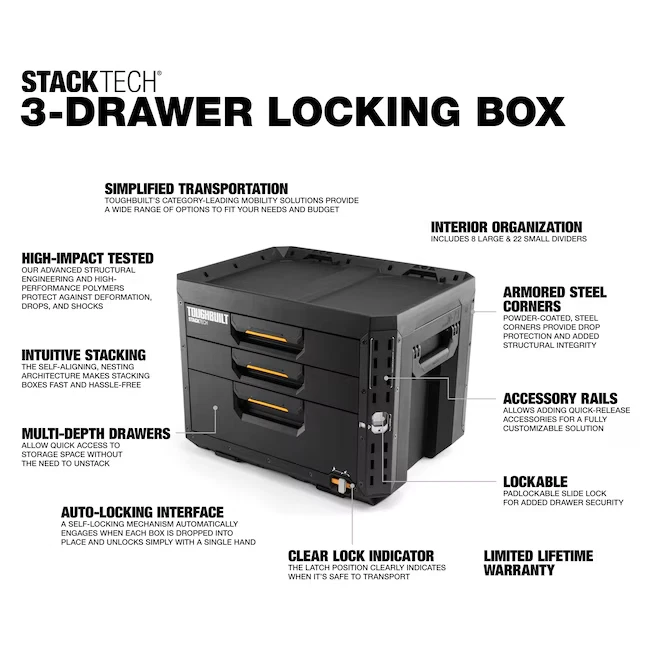 The ToughBuilt StackTech 3-Drawer Locking Box delivers deep, segmented storage in a compact modular footprint. Designed to organize a range of materials and accommodate the diverse needs of those who work across tools, kits, parts, precision gear and more. The multi-depth drawer arrangement balances form and flexibility, while offering rugged protection in the field. With updated drawer layouts, accessory rails, and full-stack integration, it’s a system component made to scale up performance. MULTI-DEPTH DRAWERS: Allow for quick access to storage space without the need to unstack LOCKABLE: Padlockable slide lock for added drawer security ACCESSORY RAILS: Allows adding quick-release accessories for a fully customizable solution INTUITIVE STACKING: The self-aligning, nesting architecture makes stacking boxes fast and hassle-free AUTO-LOCKING INTERFACE: A self-locking mechanism automatically engages when each box is dropped into place and unlocks simply with a single hand CLEAR LOCK INDICATOR: The latch position clearly indicates when it's safe to transport ARMORED STEEL CORNERS: Powder-coated, steel corners provide drop protection and added structural integrity HIGH-IMPACT TESTED: Our advanced structural engineering and high-performance polymers protect against deformation, drops, and shocks SIMPLIFIED TRANSPORTATION: ToughBuilt's category-leading mobility solutions provide a wide range of options to fit your needs and budget