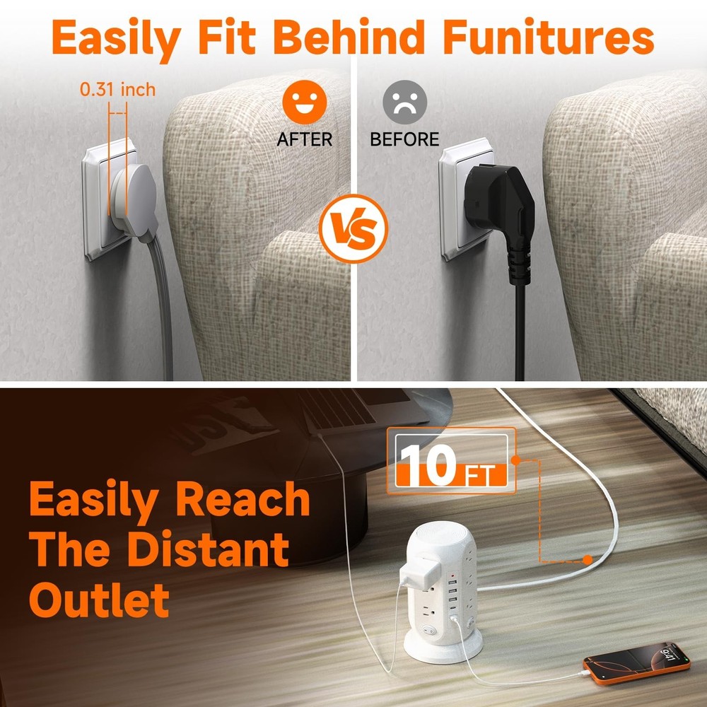 Tower Power Strip with 12 Outlets and 5 USB Ports (2 USB-C), Flat Extension Cord 10 Ft, Surge Protection 1250W Multiple Outlets Charging Station for Home Office Dorm Room Product Details Color: White Brand: FIYQVXK MPN: Does not apply UPC: Does not apply EAN: Does not apply Brand: FIYQVXK Color: White Total Power Outlets: 12 Voltage: 110 Special Feature: Lightweight Package Dimensions: 10 x 5.87 x 5.35 inches Item Weight: 1.7 pounds Date First Available: September 9, 2025 Manufacturer: FIYQVXK 17 IN 1 Power Strip Tower with USB- This vertical power strip with USB ports features 12 AC outlets and 5 smart-charging USB ports(2 USB-C), allowing you to power up to 17 devices simultaneously, widely use in office, school, and dorm room USB Power Strip- 5 USB Charging Ports- 3 USB A ports can charge up to 2.4A, and the 2 USB C ports provide charging speed up to 3A; which can power multiple devices. Such as PC, computers, laptops, phones, tablets, TV, printers, speakers, smartphone, smartwatch, and other office supplies Small Power Strip Tower with On/off Button- The vertical tower design takes up less desk space but offers multiple plugs. Four-sided tower also allows you to use bulky plugs without worrying about blocking adjacent outlets. The size is 558 inch 45 Angled Flat Plug with 10FT Extension Cord -The flat plug features a low profile fits easily in tight spaces, and the 45 degrees angled plug does not cover other outlets,This extension cord 10ft easily reaches distant outlets without excess length on the floor, Surge Protection & Overload Protection- This power strip surge protector with overload protection protects against spikes and fluctuations. This power strip tower has overload protection, short-circuit protection, over current protection, over-voltage protection, over-temperature protection, surge production, and lightning protection.