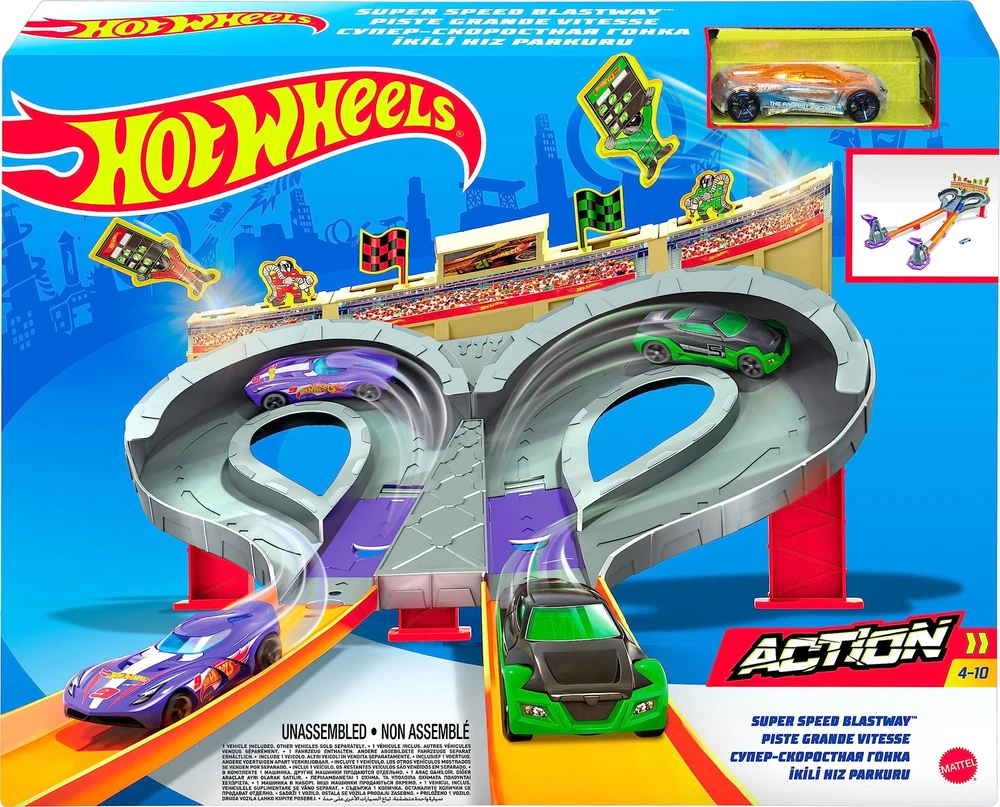 On the Super Speed Blastway, race their cars around a track to pop off flags and secure victory. Drivers launch cars toward the grandstands, releasing the flags that count toward the score. The set comes with 1 vehicle to start racing right out of the box; challenge a friend to do head-to-head battle on the dual tracks. (Additional cars sold separately.) Connect this set to others for extended excitement and extra stunting action. Colors and decorations may vary. Engage in thrilling, high-speed action with the side-by-side racing of the Super Speed Blastway! kid-activated launchers get the race started sending toy cars toward a grandstand that has pop-off flags for each completed lap. Score first and score fast to be the winner. Set comes with 1 vehicle and can be played with single or players. (Additional cars sold separately.) Connect the track to other track sets to extend the racing adventures. 4 to 10 years old will love the competitive excitement and challenge of this track set that hones problem-solving skills and encourages good sportsmanship.