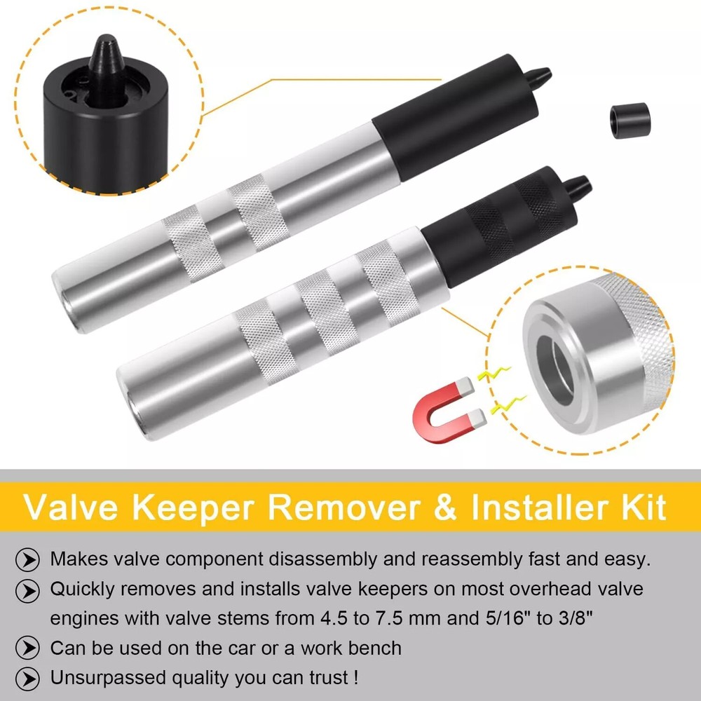 36050 Valve Keeper Remover and Installer Kit Quickly Removes and Installs APPLICATIONS -- Suitable for most overhead valve engines, valve stems from 4.5 to 7.5 mm and 5/16" to 3/8". The new smaller size works for Toyota 4 cylinder and for Chrysler New World Engine applications. Works on automobiles, motorcycles, and boats. MATERIAL -- Made of top quality Aluminum Alloy, sturdy and durable, corrosion-resistant, anti-rust, oxidation resistant, provides longer service life. FEATURES -- Makes valve component disassembly and reassembly quick and easy. Push or tap tool with a hammer to remove valve keepers. Magnet in tool body captures keepers for quick removal and valve disassembly. EASY TO USE -- To install keepers, load in retainer on the valve stem, then push or tap handle to install. Can be used on the car or bench. Design - - A magnet is built into the main body of the tool to attract and fix the retainer immediately before it falls into the engine. Avoid any potential damage. Usage -- The disassembly of the valve keepers: push or tap the tool with a hammer. The installation of valve keepers: load in retainer on valve stem, then push or tap handle to install. Can be used in a car or on a bench. Package included: 1*Valve Keeper Remover and Installer Kit Note: --Please BE AWARE that the vehicle compatibility list on eBay may not be 100% accurate. Please Comfirm The Parts Number And Confirm This Item Fits Yours Before Purchasing. --Above listed items are a main reference, for detailed model, please use the year/make/model check finder and check the replace part numbers to confirm the compatibility before purchasing. --If you have any issues with our product, please contact us immediately and we will do our best to resolve your issue.