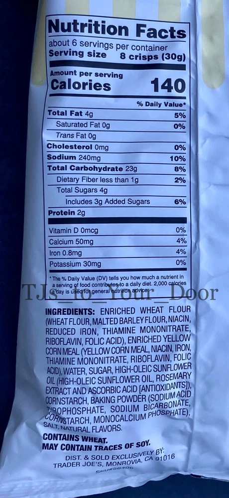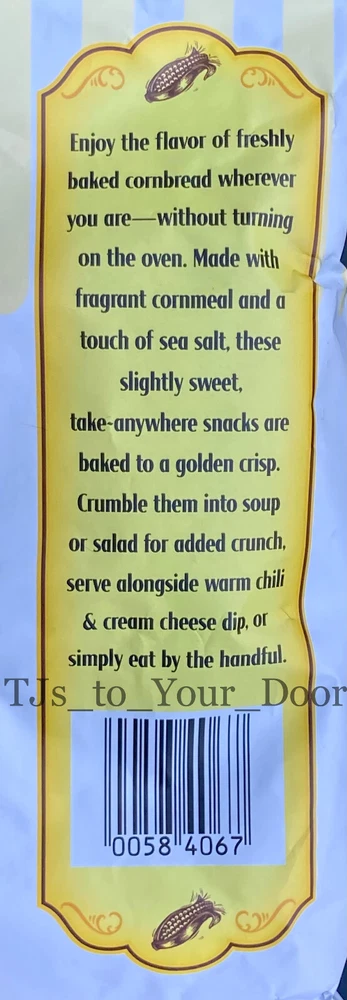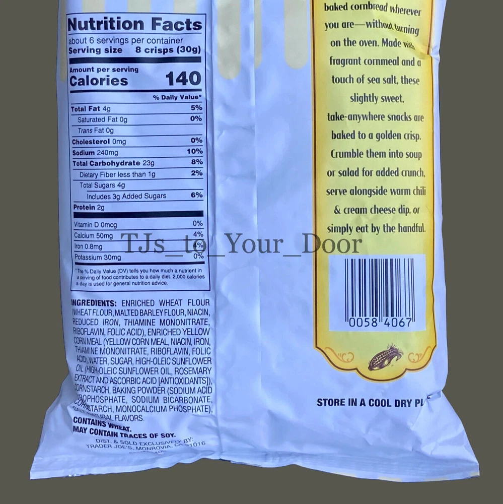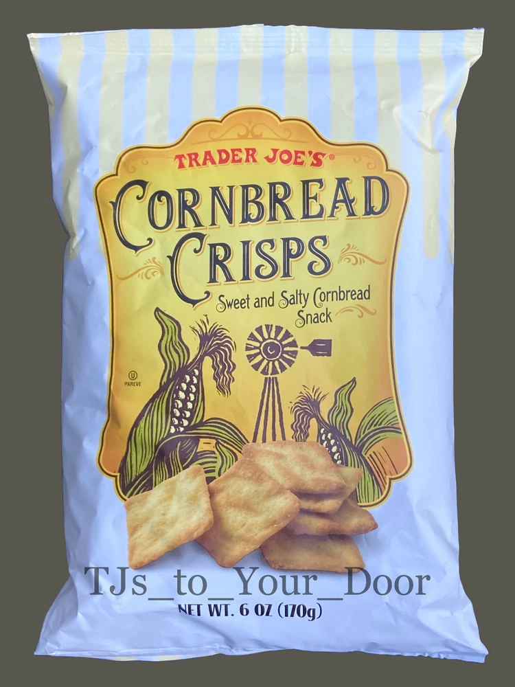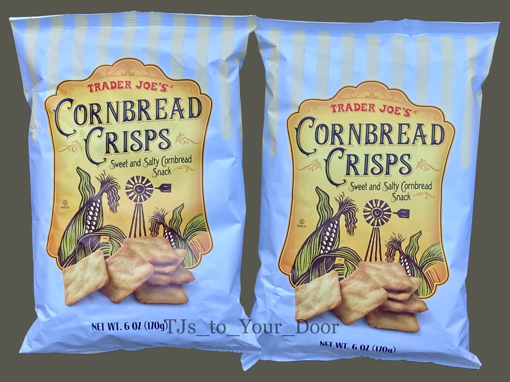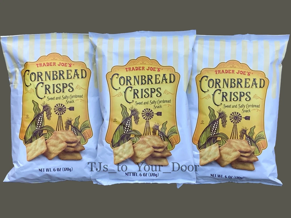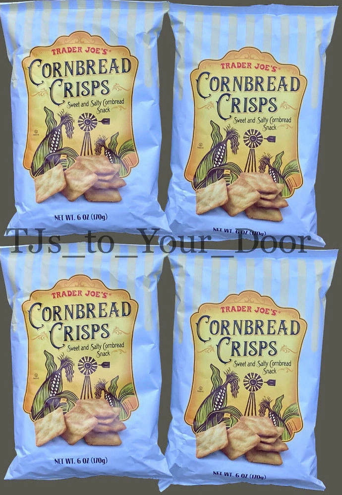 Trader Joe's Cornbread Crisps Sweet & Salty Cornbread Snack Kosher ~ Limited Production Choose 1, 2, 3, or 4 Bags! (6oz/Bag) Free Shipping via USPS Priority Mail** Best By: September 2025 Enjoy the fresh flavor of cornbread wherever you are - without turning on the oven. Trader Joe's Cornbread Crisps are made with a fragrant cornmeal and a touch of sea salt; these slightly sweet take-anywhere snacks are baked to a golden crisp. Crumble them into chili, soup, or salad for added crunch; serve alongside warm chili & cream cheese dip or simply eat by the handful. This item is sold in the following quantities: * 1 Bag (6 oz) for $14.95 (Free USPS Ground Advantage Shipping is Included)** * 2 Bags for $26.95 (Free USPS Priority Mail Shipping is Included) * 3 Bags for $36.95 ( Free USPS Priority Mail Shipping is Included ) BEST DEAL --> * 4 Bags for $44.95 ( Free USPS Priority Mail Shipping is Included ) TJs to YOUR DOOR Information and Policies Fresh and New: Fresh items are purchased regularly from Trader Joe's to fulfill your orders.The expiration dates shown on listings are updated monthly to reflect the dates shown on items that are on the shelves of Trader Joe's. 'Limited-production/seasonal' items are sometimes available from the seller's inventory, and the expiration dates shown in the listing descriptions are accurate for these products. Shipping: All items sold by TJs to Your Door include free shipping to U.S. addresses via USPS Priority Mail, or USPS Ground Advantage for items weighing less than 1lb. This means that most orders will arrive within 2-5 business days, with 3 days being the most common. Orders placed before 8AM, Mon-Sat, may receive the benefit of same day shipping; other orders will be shipped the next business day. Returns: All purchases are eligible for returns within 30 days of receiving the item. If your item arrives damaged, please document the condition of the packaging and item by taking photos. Food items may be returned unopened in their original packaging for a full refund. Opened food items may be returned under the guidelines of Ebay's 'first taste policy', meaning if an item is determined to be defective after the first taste it may be returned with open packaging, as long as only a minimum amount of the item has been consumed. If the items arrives damaged or defective the seller will pay for the cost of the return. In all other cases, the buyer will be responsible for the cost of the return. Prices: The prices you see in the listing are more than what the item costs on the shelves at Trader Joe's. In addition to the value of the item, listing prices include: shipping costs (packaging materials, postage), Ebay Final Value Fees for sellers (13 percent of purchase price + 0.40), and compensation to the seller for the shopping and shipping services being provided. Notice of Non-Affiliation: This seller is not affiliated, associated, authorized, endorsed by, or in any way officially connected to Trader Joe's. The items being sold in this listing were purchased new from Trader Joe's retail locations at full retail price.