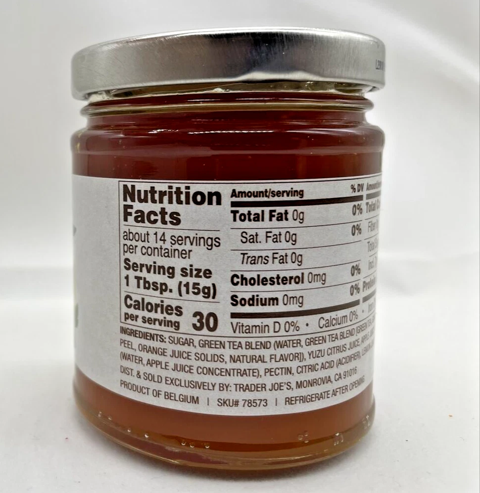 Enjoy the seasonal limited time Trader Joe's Green Tea and Yuzu Spread, perfect for your daily course. This jam and preserve is made with citrus as the main ingredient, and is California Certified Organic Farmers (CCOF) labeled. The jar packaging contains 7.75 oz of the spread, with 15 servings of 40 grams each. This modern style jam is made in Belgium and is perfect for those who are caffeine-free, dairy-free, and vegan. It contains alcohol and has less than 50 calories per serving. The Trader Joe's Green Tea and Yuzu Spread is a must-have for any tea lover's pantry, and is a great addition to any breakfast or afternoon snack. Ships free one business day.