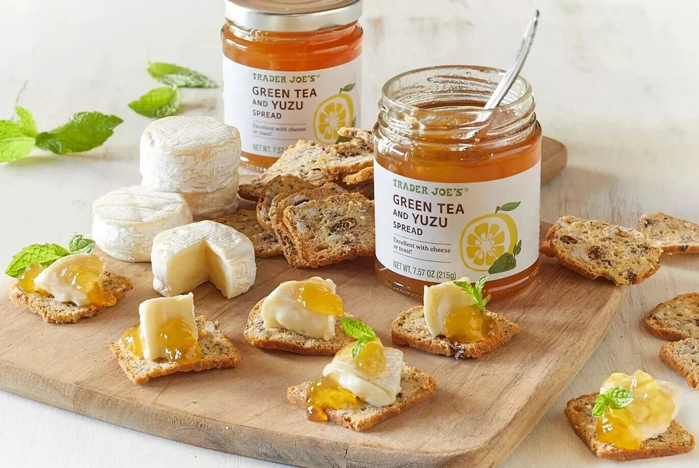 riginally cultivated in mainland East Asia, but now more typically associated with Japanese cuisine, specifically, a yuzu is a refreshingly aromatic citrus with a flavor somewhere between a grapefruit and a Mandarin orange. It’s often paired with sweeter, spicier, and earthier flavors, and makes a particularly great pairing with honey, chile peppers, and green tea. In fact, that last combo is what inspired our uniquely delicious, summer-seasonal, Trader Joe’s Green Tea & Yuzu Spread. It’s crafted for us in small batches by a supplier in Belgium, who’s particularly adept at combining complementary ingredients to create uniquely rich flavor profiles. In this case, they mix Green Tea that’s been infused with lemongrass, ginger, and orange peel, along with apple and lemon juice concentrates and tantalizingly tart Yuzu juice, resulting in a sweet, citric, marvelously multi-dimensional Spread. Aside from making an excellent jelly for your morning toast or muffin, it also provides a pronounced pop of flavor when spread on sandwiches, over roast chicken and fish, or mixed into marinades. And when you’ve got friends over for a charcuterie board or cheese plate, trust us: adding a bit of Green Tea & Yuzu Spread will make those savory flavors truly sing.