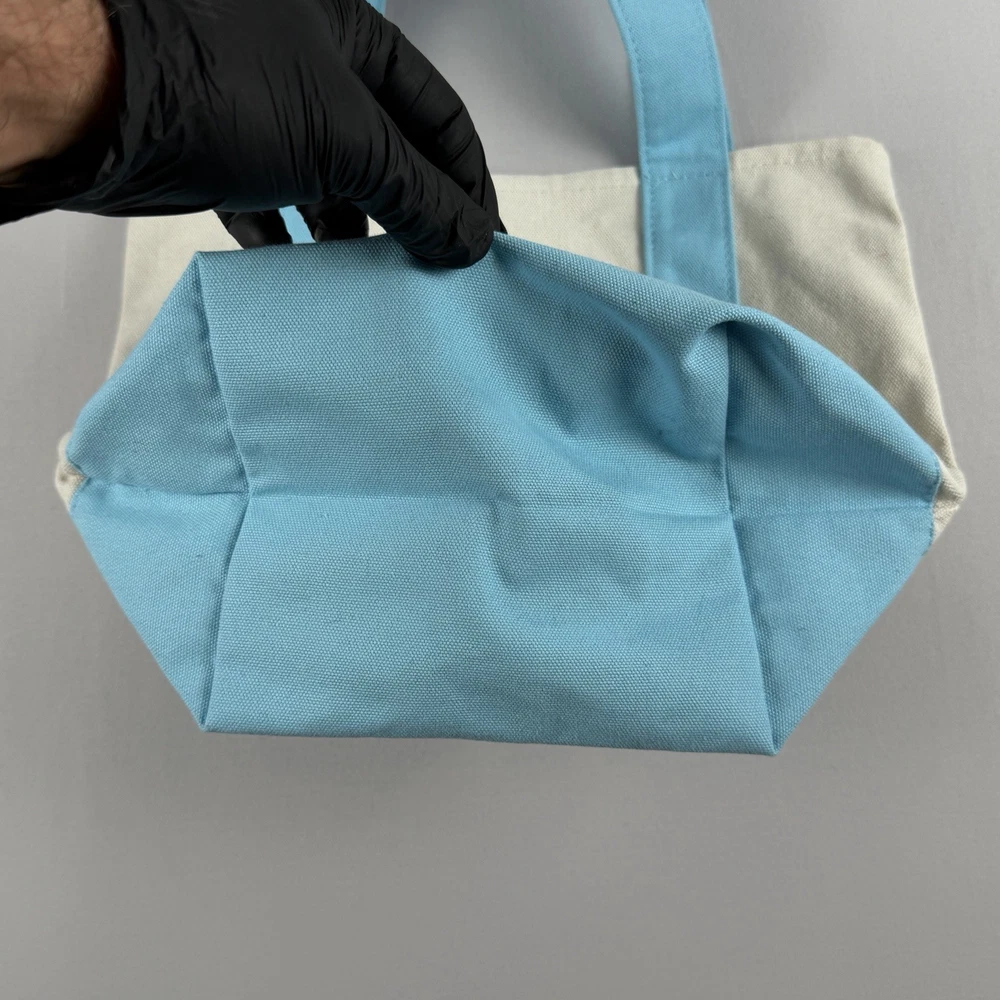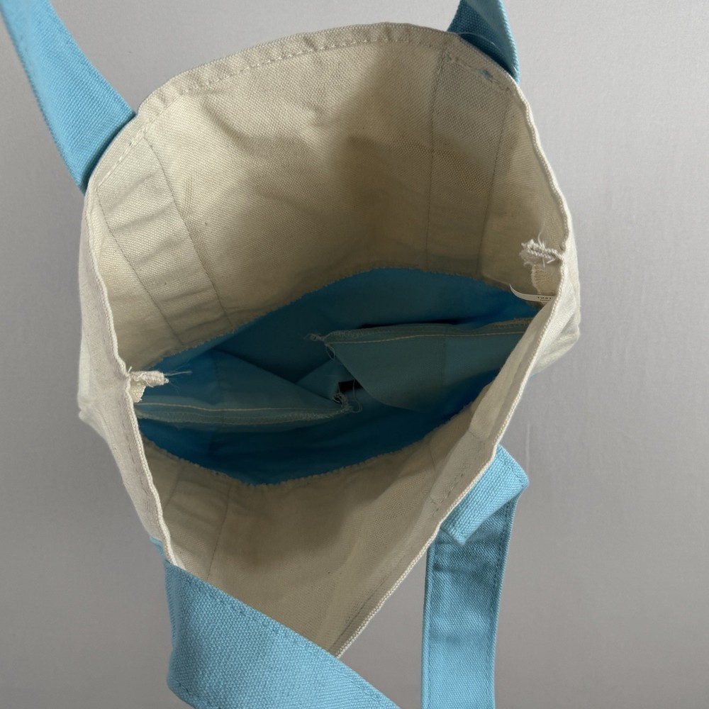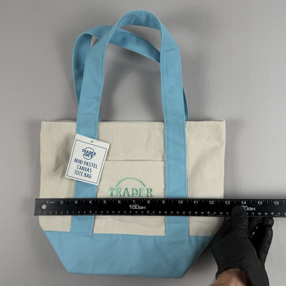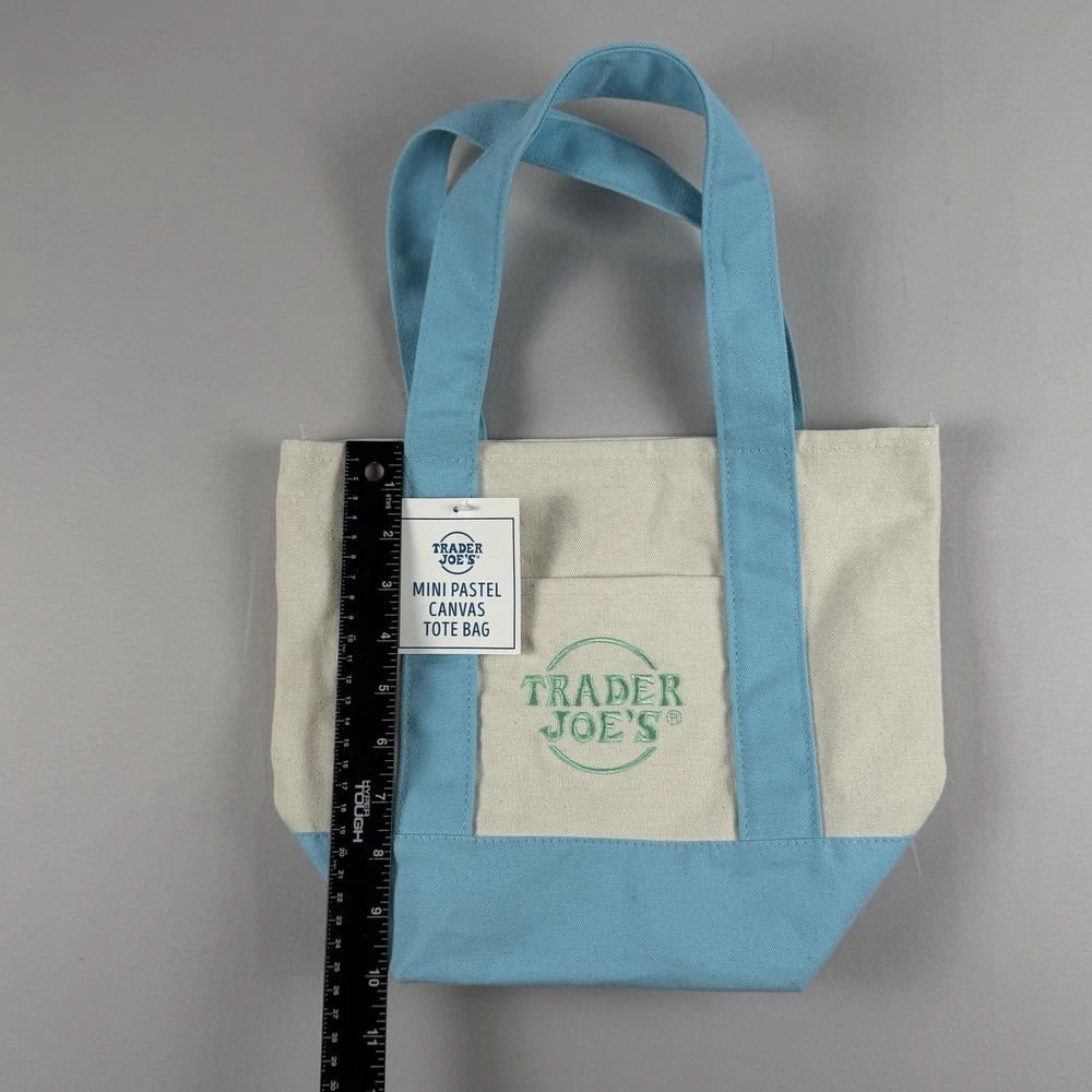Trader Joe’s Mini Pastel Canvas Tote Bag in blue and natural canvas. Dimensions: Width: 12.5" Height: 10" Depth: 6" 65% Cotton / 35% Polyester canvas construction. Open top design with dual carry handles. Reusable bag designed for at least 125 uses. Made in Vietnam. New with original tag attached. No defects observed. See photos for details.