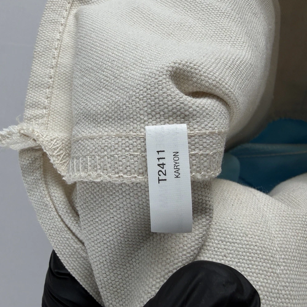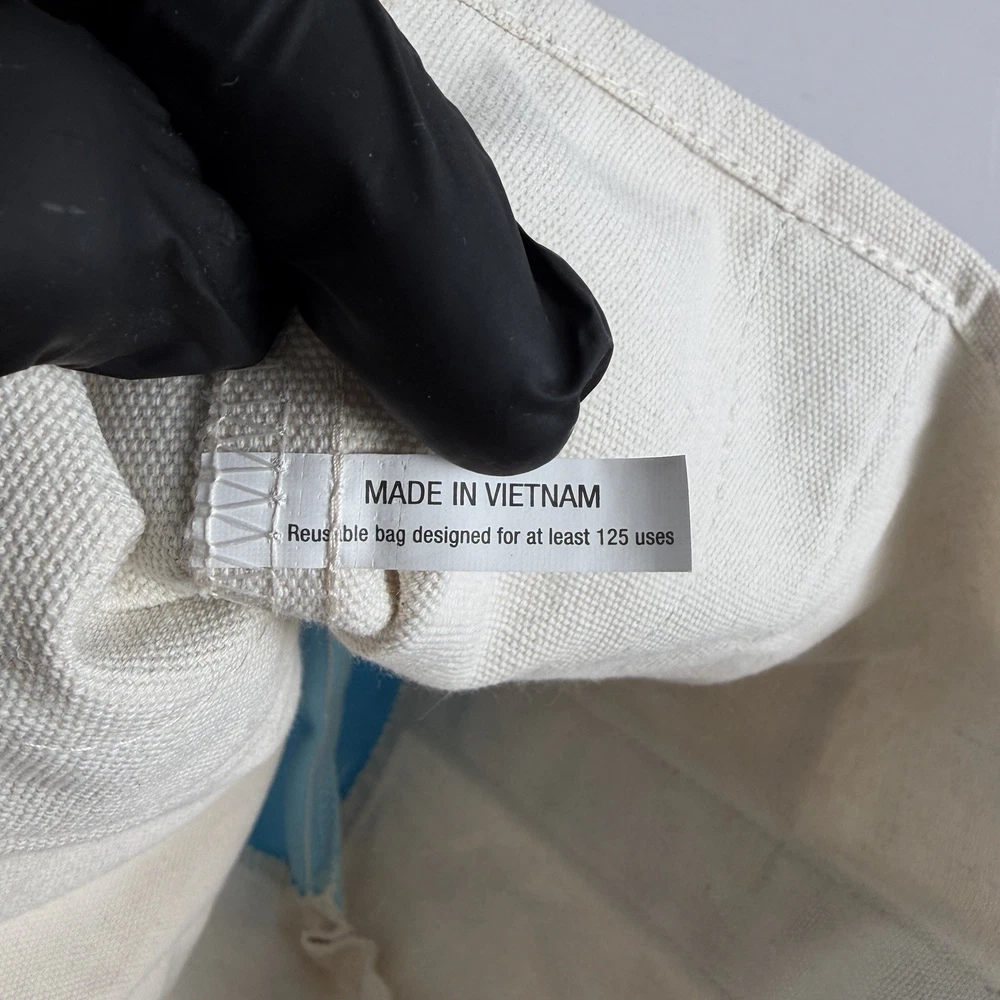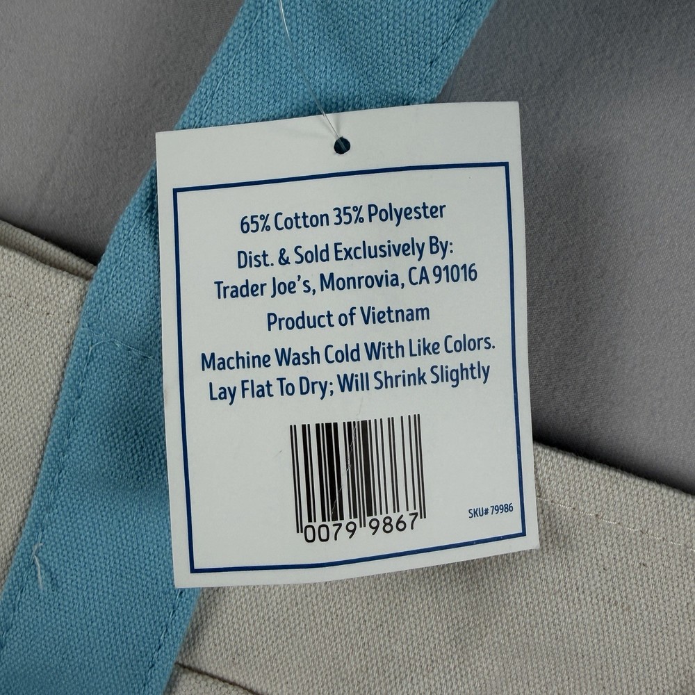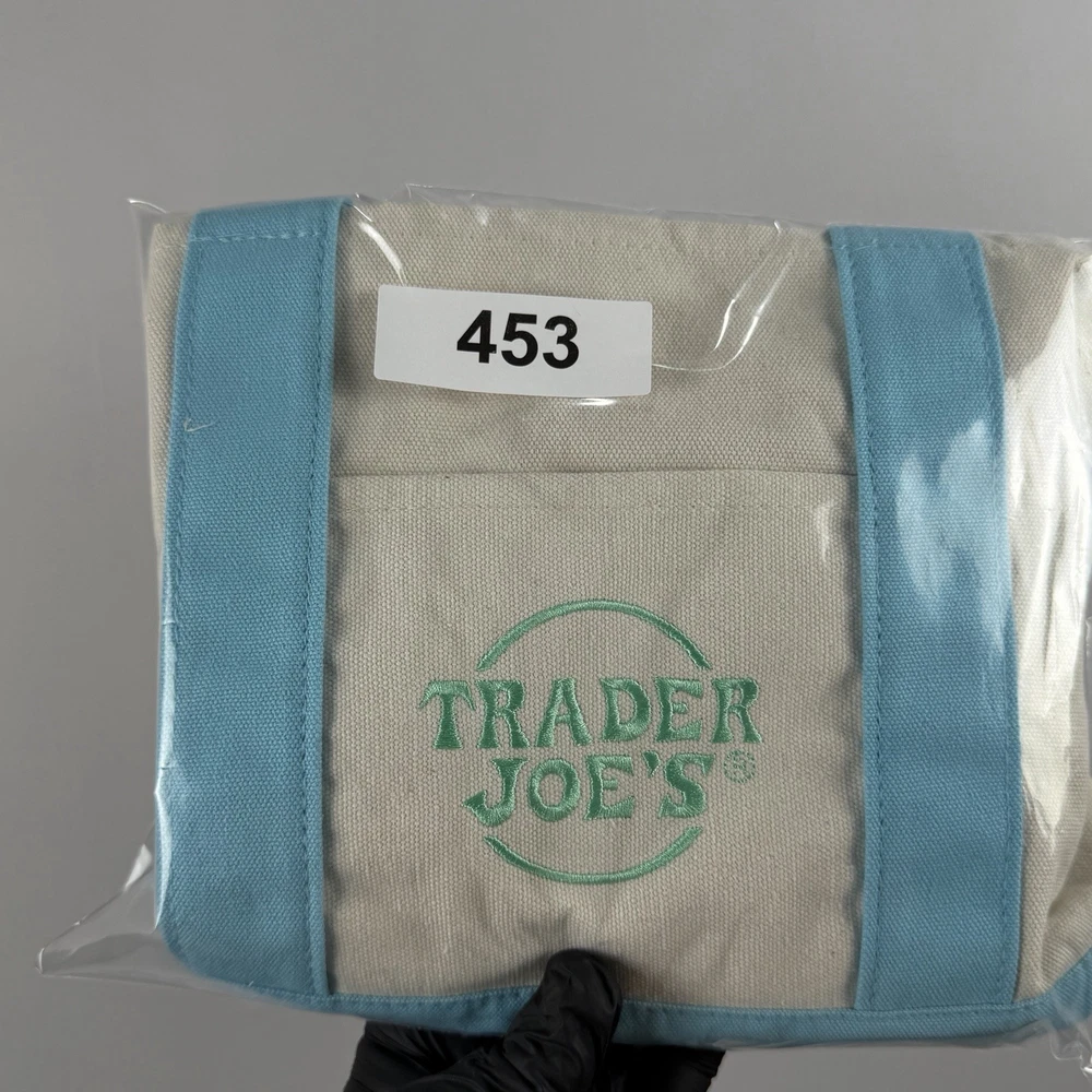 Trader Joe’s Mini Pastel Canvas Tote Bag in blue and natural canvas. Dimensions: Width: 12.5" Height: 10" Depth: 6" 65% Cotton / 35% Polyester canvas construction. Open top design with dual carry handles. Reusable bag designed for at least 125 uses. Made in Vietnam. New with original tag attached. No defects observed. See photos for details.