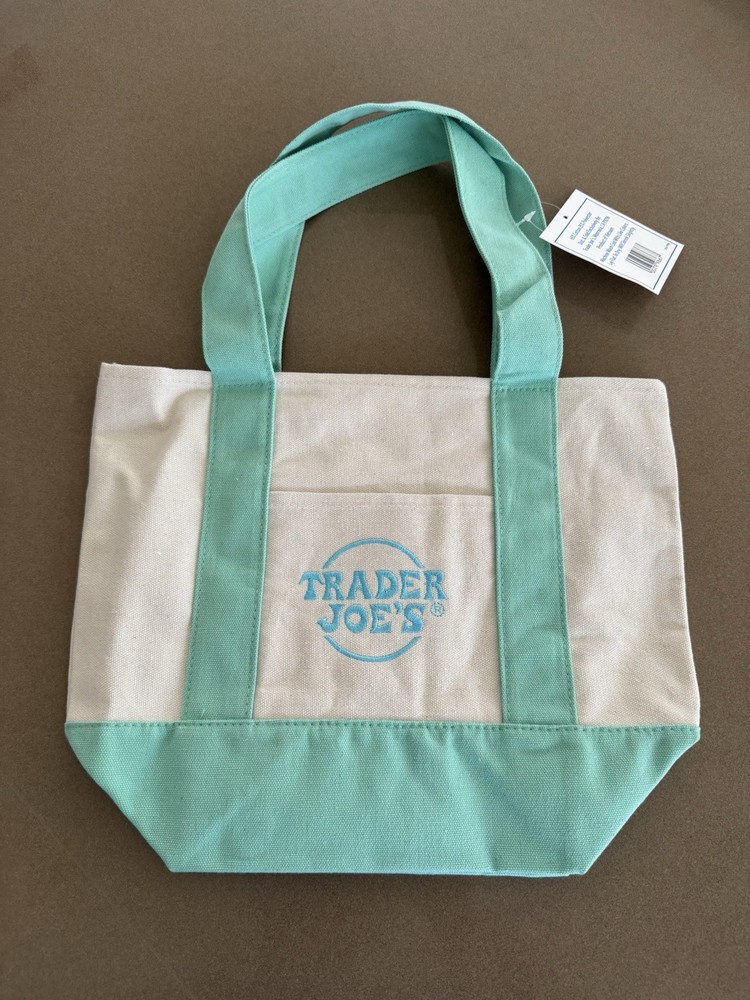 This Teal Trader Joes Mini Reusable Tote Bag is a stylish and convenient accessory for women on-the-go. With the iconic Trader Joes logo as the pattern, this canvas bag features a mini size which makes it perfect for carrying essentials while shopping or running errands. The green exterior color adds a pop of color to any outfit, while the canvas lining and handle/strap material provide durability and comfort. Limited time only, this tote bag from Trader Joes is a must-have for any fashion-forward woman looking for a practical and trendy accessory.