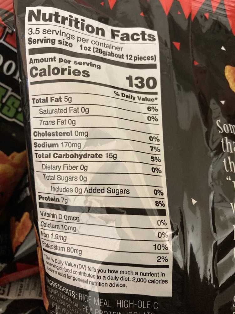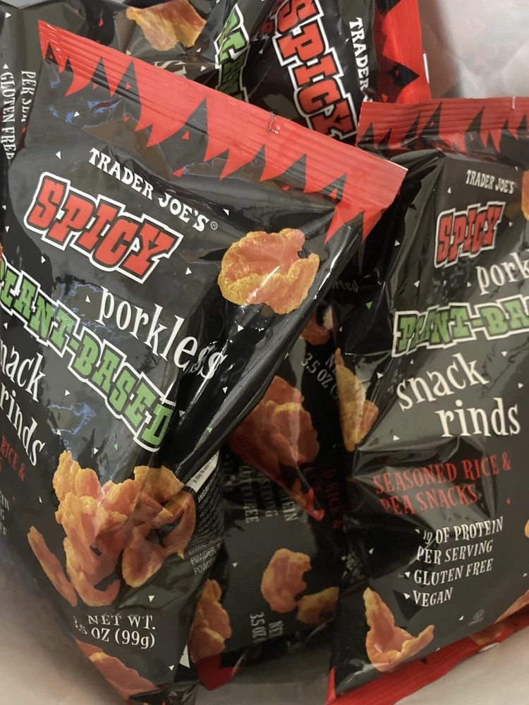 Trader Joe's Spicy Porkless Plant-Based Snack Rinds This is a leaner and great tasting alternative to traditional pork skins and you will fall in love! Made from Seasoned Rice and Pea snack it is: Vegan Gluten free And offering 7 grams of Protein per serving Enjoy!