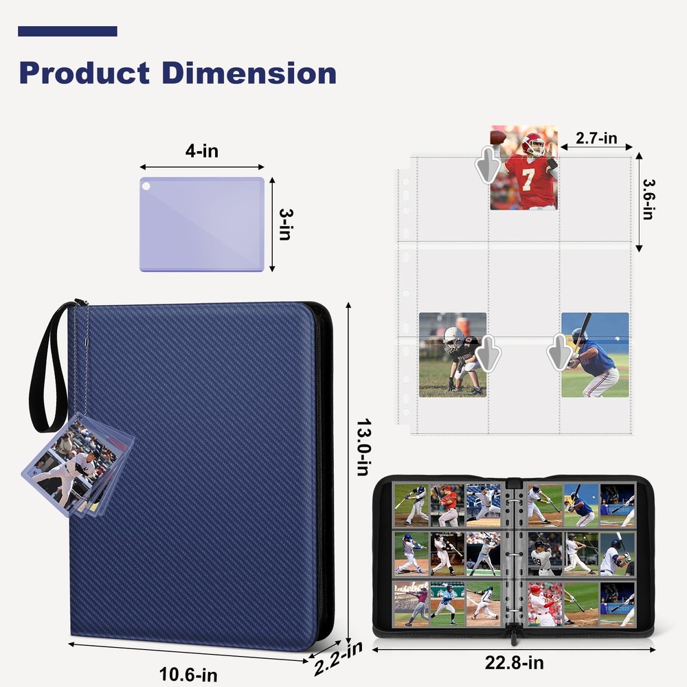 Trading Card Binder, 9 Pocket Card Binder with Sleeves 720 Double Sided Pocket Sports Card Binder, Premium Card Binders Compatible with MTG, TCG, Baseball Cards, and Football Cards(Blue) 【Unique Display Design】The newly upgraded card binder seamlessly integrates display and storage functions. Equipped with 4 punched hard plastic card protectors and 2 hanging chains, it is meticulously designed to showcase your treasured cards, while the trading card binder itself offers ample storage space for your collection. 【Large Capacity】The 3 ring design allows you to easily add or remove pages. The baseball card binder includes 40 pages of double-sided 9 pocket card sleeves binder sheets, with a total capacity of up to 720 cards, offering ample space to organize and display your precious collection. 【Exquisite Details】Crafted with high-quality PU leather exterior, the sports card binder is waterproof and durable. The card sleeves are acid-free, non-toxic, and highly transparent, ensuring card safety while providing perfect display clarity. The wristband design makes it easy to carry, allowing you to enjoy your collection on the go. 【Wide Compatibility】Compatible with MTG, PKM, TCG, baseball cards, football cards, the trading card binder meets all your card collection and protection needs. It's a must-have for all trading cards aficionados 【Perfect Gift】The card binder is an ideal gift for card enthusiasts. Whether it's a birthday, holiday, or any special occasion, it will delight your friends or children. They can store their favorite trading cards in it and showcase and share them anytime, anywhere.