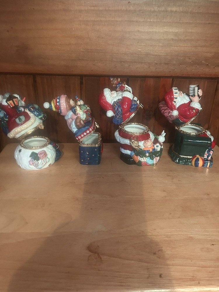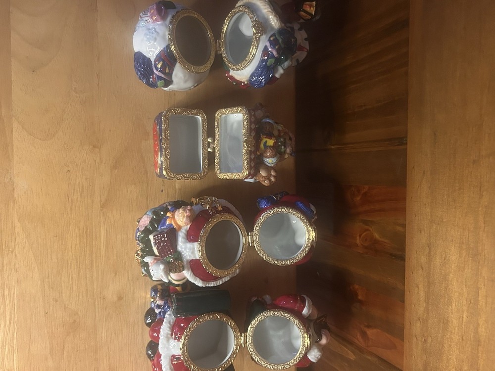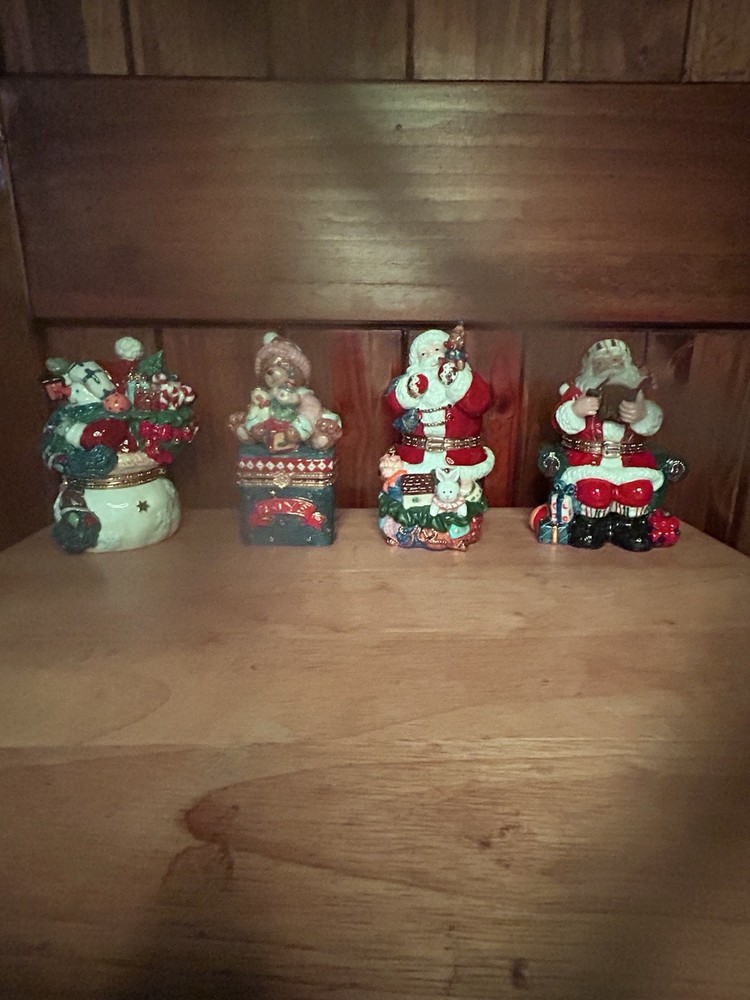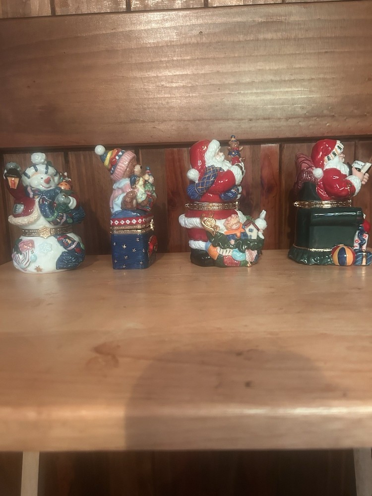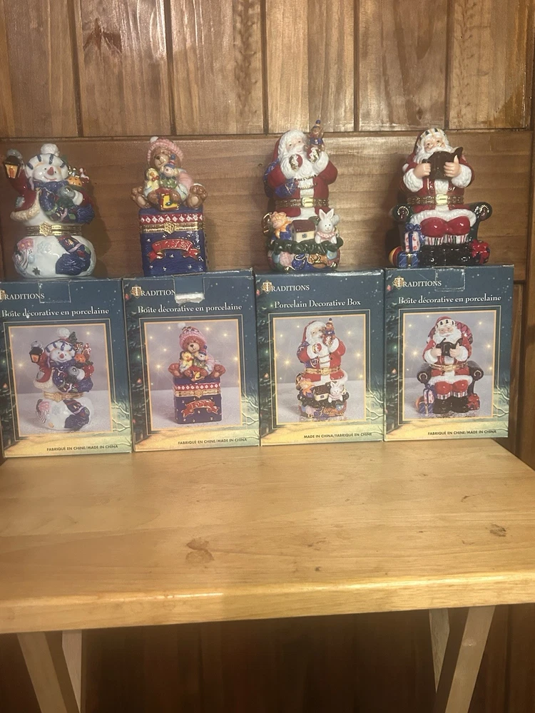 The Tradition Hinged Keepsake Boxes Set of 4 features a festive collection of trinket boxes perfect for storing small treasures or holiday ornaments. This set includes a Snowman, Bear, and two Santa Claus trinket boxes, all adorned in a traditional style. Each box is beautifully crafted with hinged lids, making them ideal for collecting and displaying holiday decor or cherished keepsakes. Perfect for adding a touch of nostalgia and charm to your festive celebrations.
