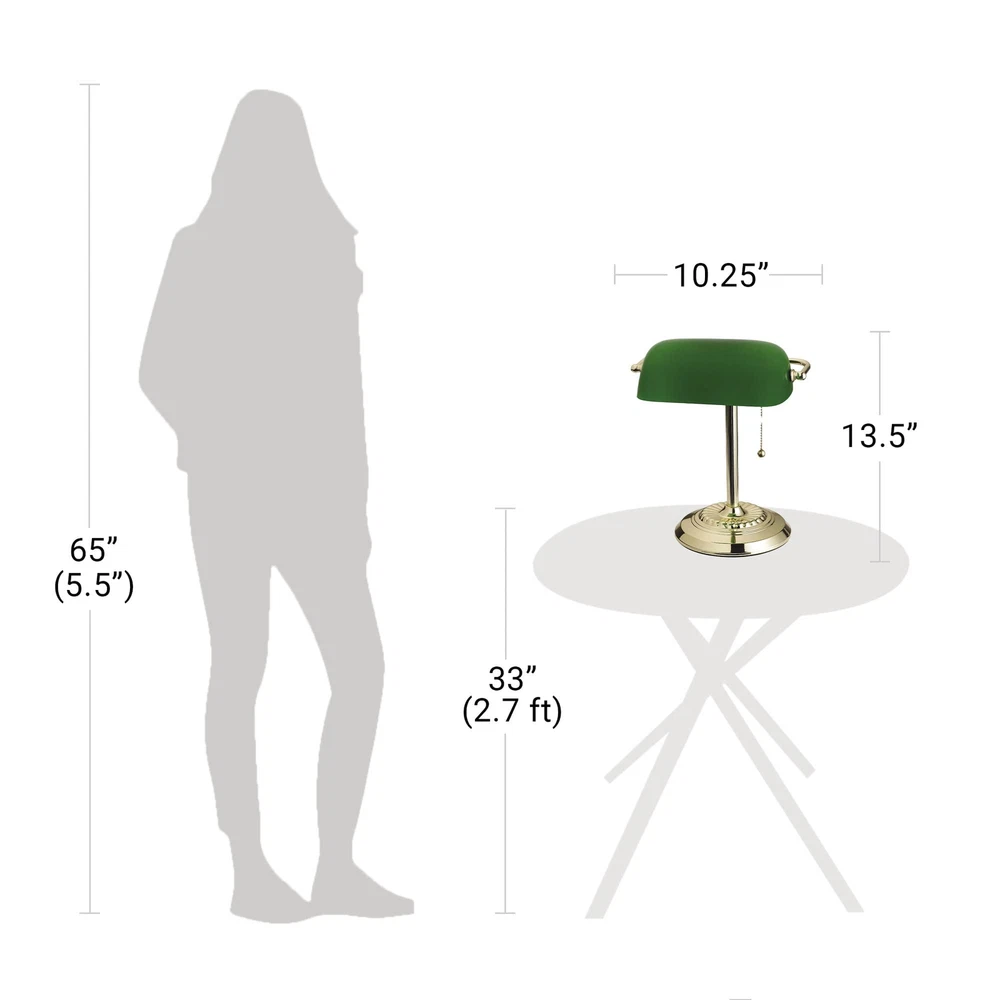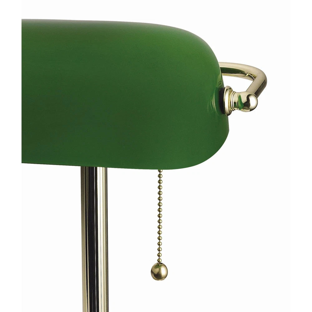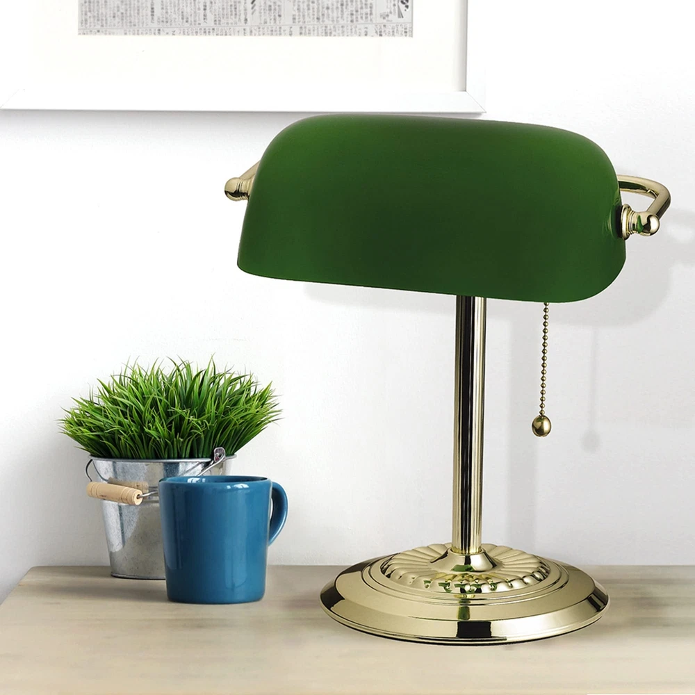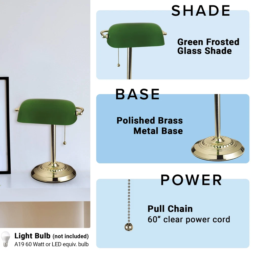 Your desk will have never looked so refined, thanks to the Catalina Traditional Bankers Desk Lamp. Suitable for your study, office, library, or even your bedside, this lamp is a stylish and efficient accent light for your desk or other surface. Classic in design- down to the adjustable green frosted glass shade and brass plated finish- this lamp is with an A19/E26 60-watt lightbulb or the LED equivalent to provide comfortable and direct light while wasting less energy and money than an incandescent lamp would. With a durable easy-to-use pull chain switch under the shade, casting light throughout the room will come easily. Powered by a 60-inch long black cord, this desk lamp is smart home , and can be plugged into a smart outlet or smart switch to connect with Alexa, Google Home, or other smart home devices. This vintage-inspired bankers lamp measures 10.28"" x 10.54"" x 13.5"", making it the perfect size to sit on even smaller desks. Bulb NOT Included. · ELEGANT BANKER'S LAMP: A traditional desk lamp suitable for providing ambient lighting to your study, bedroom, living room, or anywhere else in your home · CLASSIC DESIGN: Complete with an attached on/off pull chain under the shade, this lamp is reminiscent of a vintage bankers lamp with a brass-plated finish and adjustable frosted-glass green shade · EFFICIENT LIGHTING: with A19/E26 60-watt lightbulb or the LED equivalent (not included) · SMART HOME : Powered by a 60" long cord, this lamp can be set up using a smart outlet or smart switch (sold separately) to easily connect to Alexa, Google Home or any other smart home device · DESK-SIZED: Measures 10.28" x 10.54" x 13.5" with simple assembly