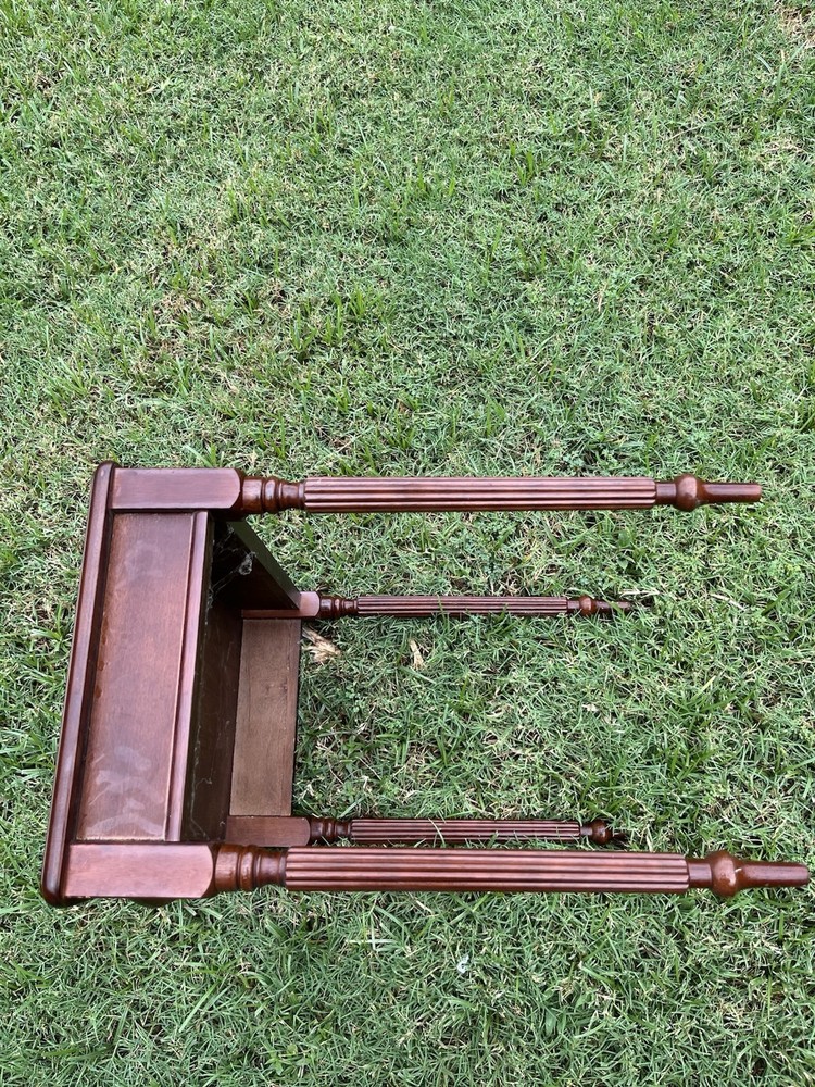 This traditional mahogany nesting indoor table features a rectangular shape with a brown color and a sturdy wood tabletop made of mahogany. Perfect for indoor use, this table is 11.5 inches long with a height of 18 inches and 18 inches wide. The nesting design allows for easy storage and transport, making it ideal for use in various room such as the living room, bedroom, home office, or dining room. With a classic style and pedestal feature, this table adds a touch of elegance to any space.