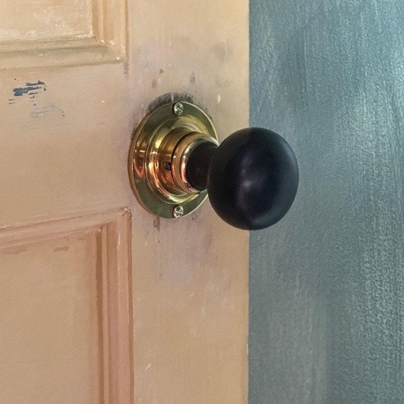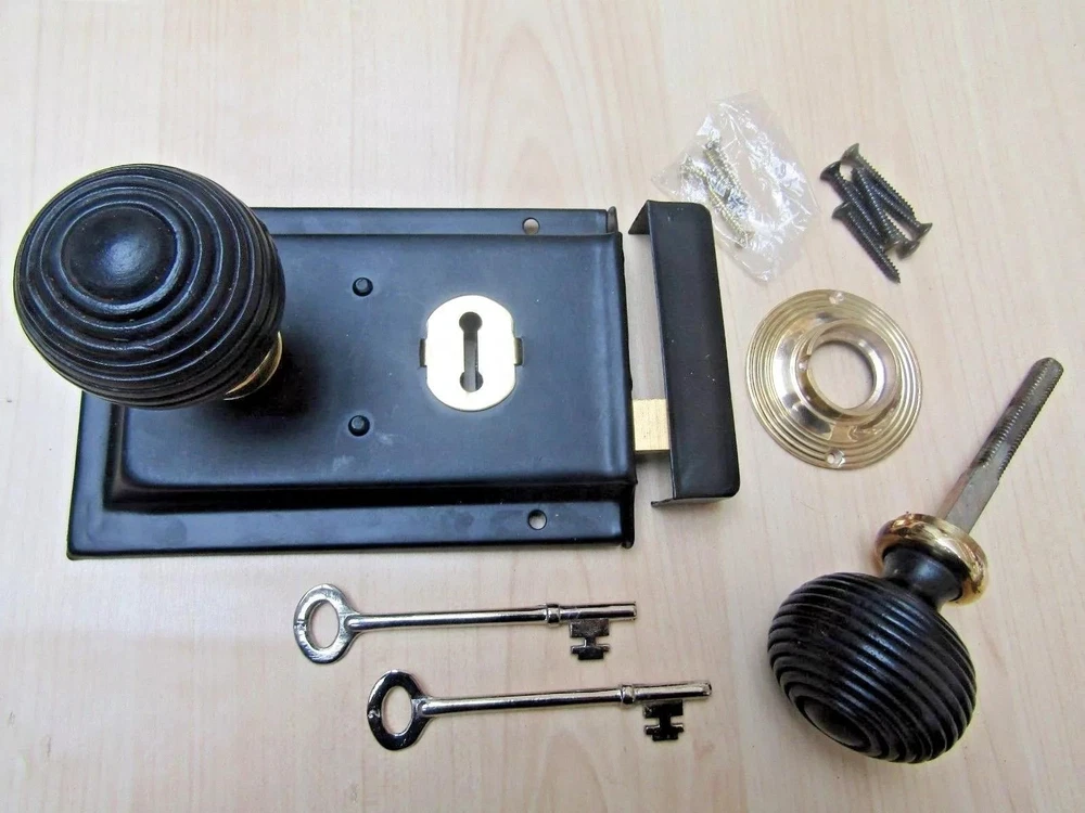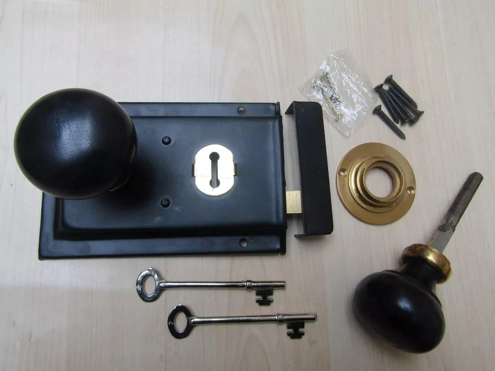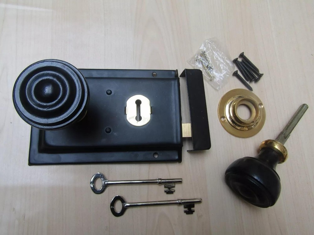 Black Steel rim lock with Brass & Ebony black wood knob set These rim locks are surface mounted. Designed for bathroom & bedroom doors or rooms requiring privacy. Please note that rim lock is reversible and can be fitted to both left and right hand opening doors. Can be locked from either side of the door. Rim lock 152mm x 102mm Keep 102mm x 20mm Edge of lock to centre of keyhole: 45mm Edge of lock to centre of square latch: 105mm WOODEN BEEHIVE KNOB DIAMETER 50MM ROSE 65MM DEPTH 60MM WOODEN BUN RIMMED -KNOB DIAMETER 55MM ROSE 65MM DEPTH 60MM WOODEN PLAIN BUN -KNOB DIAMETER 55MM ROSE 65MM DEPTH 60MM