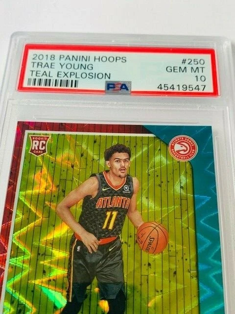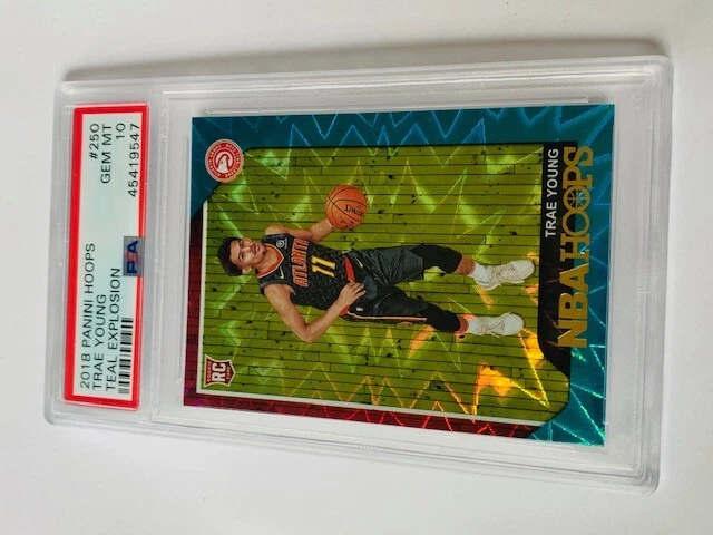 Absolutely awesome and highly collectible RARE Trae Young Rookie Card Hoops Teal Explosion short print graded PSA 10. VERY low population, POP 22. See all pictures for amazing condition, size, and detail. There are absolutely no returns on sports cards as the market for sports cards changes literally on a daily basis. Check out my store for some of the rarest vintage collectibles online from all eras. Thanks for looking and have a great day! :)