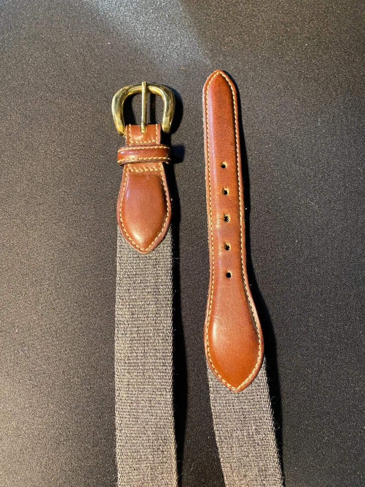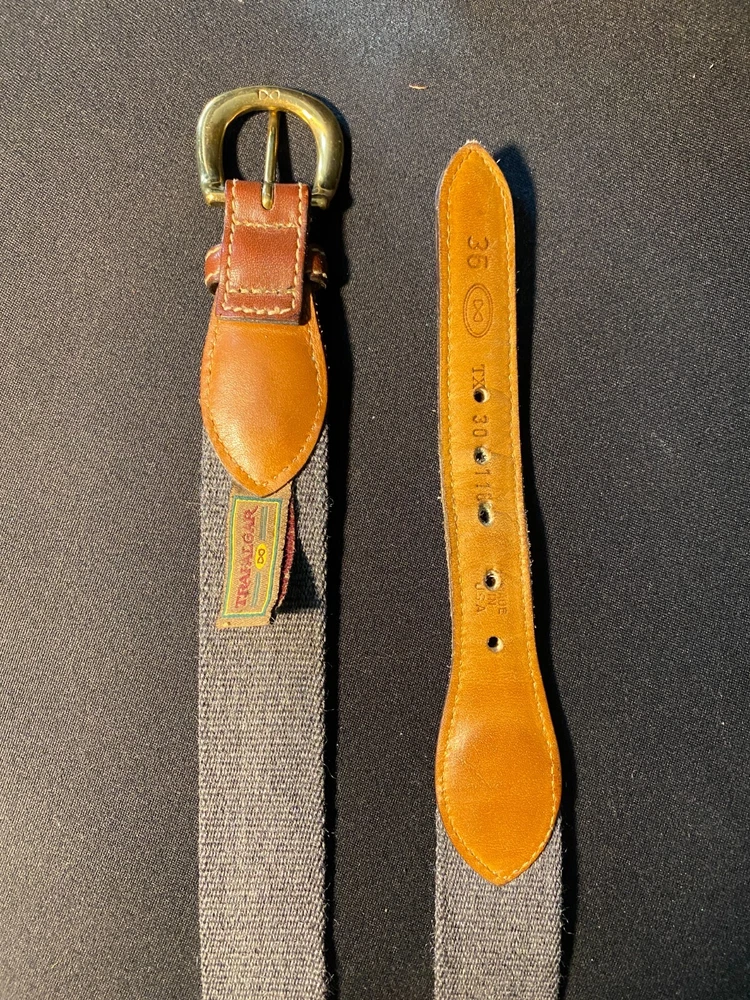 This Trafalgar belt is a vintage-inspired piece made of brown cowhide leather with a solid pattern. It features a brass buckle and is handmade with classic styling, making it suitable for both work and dress occasions. The belt is adjustable and comes in a size 32, perfect for men looking for a timeless accessory to add to their wardrobe.