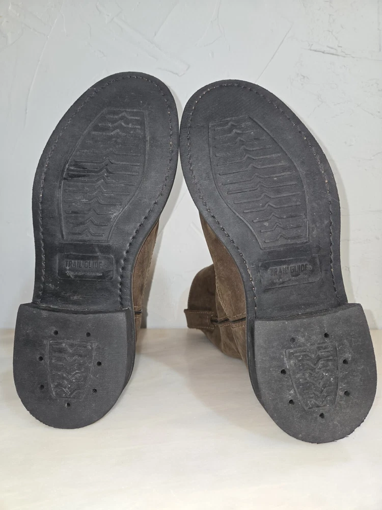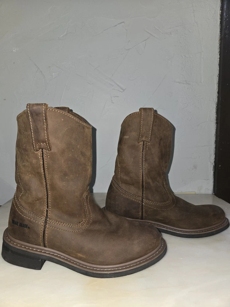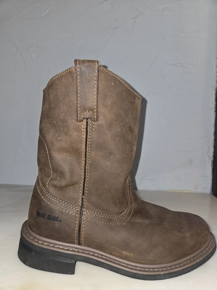 These Trail Guide Wellington leather workwear boots in dark brown with a round toe shape and pull-on closure, they're perfect for casual or workwear occasions. The boots feature pull-on tabs, slip-resistant and oil-resistant properties, making them ideal for winter, fall, and spring seasons. The mid-calf shoe shaft style and solid pattern. The boots are made of leather and have a foam insole material. They're available in men's size 8 and were manufactured in Guatemala. These boots are part of the Trail Guide product line and are perfect for those who love the motorcycle, equestrian, horse, work, or cowboy theme.