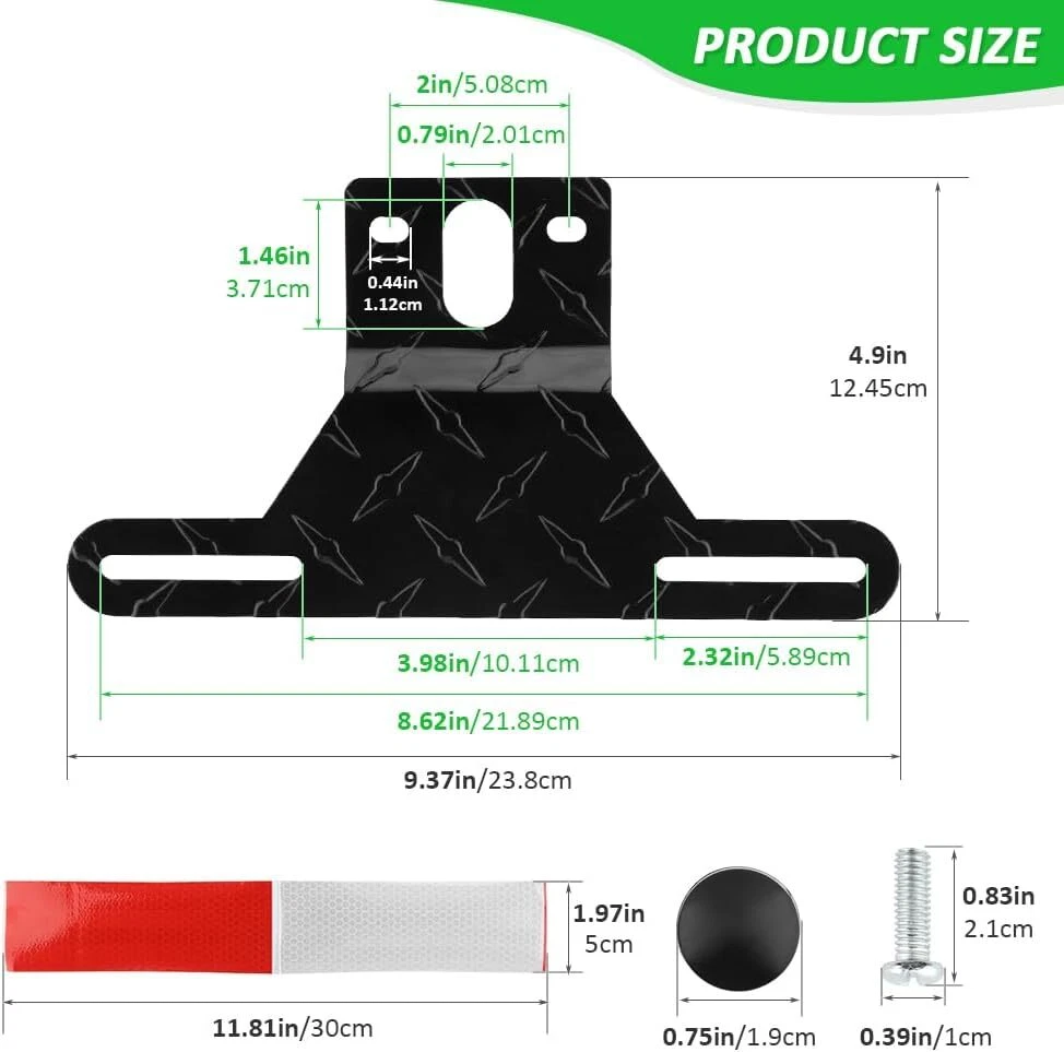 Trailer License Plate Bracket Holder, Aluminum Car Tag Frame for UTV black Product Details Manufacturer: Tookie Brand: Tookie Item Weight: 3.52 ounces Product Dimensions: 9.84 x 5.51 x 0.59 inches Country of Origin: China Manufacturer Part Number: 17120509020404 Color: black Brand: Tookie Vehicle Service Type: ATV, Car, UTV, Trailer Product Dimensions: 4.9"L x 9.37"W Manufacturer: Tookie MaterialFit Type: AluminumStandard Fit 【DURABLE MATERIAL】The American black license plate holder is made of aluminum alloy, with a sturdy structure, durable and wear-resistant, not easily deformed or damaged and weather-resistant, providing longer service time. 【REFLECTIVE STICKER】Reflective sticker is made of PVC material, durable, wear-resistant, water-resistant and scratch-resistant, dual-color design, high-visibility reflective effect, making your vehicle immediately eye-catching at night and reducing accidents. Highly adhesive, easy to install, not easy to fall off. 【REPLACEMENT PART】Can be used to replace your old plastic license plate holder, easy to install, the bracket can be easily fixed with screws. Simple black color with unique pattern, practical and beautiful, adding a touch of decoration to your trailer. 【WIDE APPLICATION】The license plate holder has a wide range of applications and is used to secure license plates and license plate lights. The standard size is suitable for most trailers and trucks, motorcycles, boats, RVs, snowmobiles, etc. 【PACKAGE CONTENT】You will receive 1pc black aluminum license plate light bracket, 1pc hex wrench, 4pcs US standard screws with caps and 4pcs PVC reflective stickers, this set comes with mounting accessories so you can use it as soon as you receive it. Description:【DURABLE MATERIAL】The American black license plate holder is made of aluminum alloy, with a sturdy structure, durable and wear-resistant, not easily deformed or damaged and weather-resistant, providing longer service time.【REPLACEMENT PART】Can be used to replace your old plastic license plate holder, easy to install, the bracket can be easily fixed with screws. Simple black color with unique pattern, practical and beautiful, adding a touch of decoration to your trailer.【REFLECTIVE STICKER】Reflective sticker is made of PVC material, durable, wear-resistant, water-resistant and scratch-resistant, dual-color design, high-visibility reflective effect, making your vehicle immediately eye-catching at night and reducing accidents. Highly adhesive, easy to install, not easy to fall off.Specification:License Plate Bracket Color: BlackLicense Plate Bracket Material: Aluminum AlloyLicense Plate Bracket Size:Lower screw hole: length about 5.89cm/2.32inch,distance about 10.11-21.89cm/3.98-8.62inchTop screw hole: lengthabout 1.12cm/0.44inch, distance 5.08cm/2inchTop middlehole: about 3.71x2.01cm/1.46x0.79inch(LxW)Total size(LxW): about 23.8x12.45cm/9.37x4.9inchWrench Material: SteelWrench Color: SilverScrew Material: Zinc alloyScrew Size(LxW): about 21x10mm/0.83x0.39inch, cap diameter 19mm/0.75inchReflective Sticker Material: PVCReflective Sticker Color: Red+whiteReflective Sticker Size(LxW): About 30x5cm/11.81x1.97inchPackage includes:1pc x License Plate Light Bracket1pc x Hex wrench4pcs x US standard screws with caps4pcs x Reflective stickers