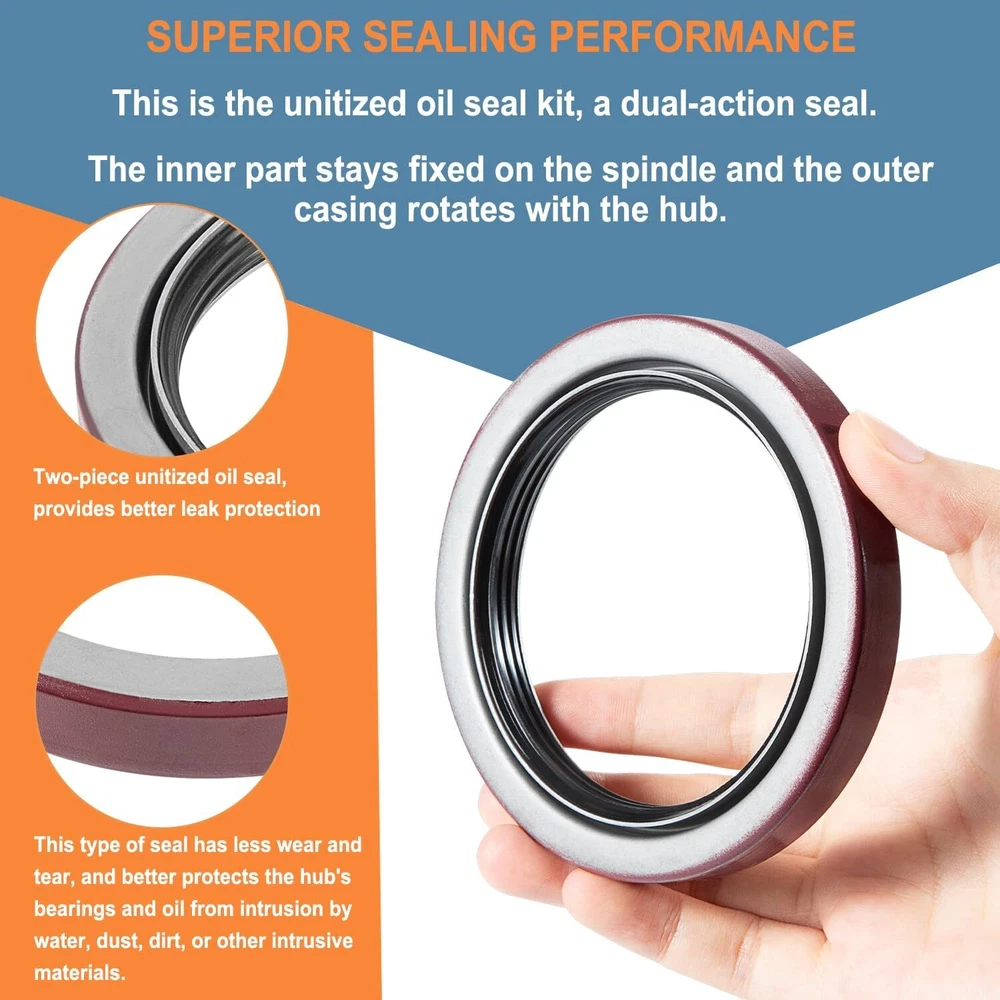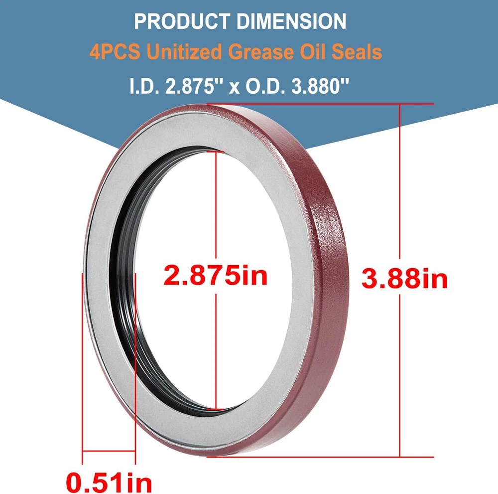 WIDE APPLICATION: The 370150BGO trailer wheel hub oil seals kit is compatible with Dexter axles 9K-10K axle capacity, and also fits heavy-duty trailer hubs. DIMENSION: The unitized trailer oil seal has an inner diameter of 2.875 inches and an outer diameter of 3.88 inches (I.D. 2.875'' x O.D. 3.880''). Compatible with Dexter 9k and 10k general duty hubs, but you will want to check your trailer hub and seal dimensions and seal numbers as well to ensure you are purchasing the correct seals for replacement. SUPERIOR SEALING PERFORMANCE: The unitized oil seals kit is a dual-action seal, the outer part of the seal connects to the hub and remains fixed in place, while the inner part of the seal remains fixed to the spindle and rotates. This makes the seal better protect the hub's bearings and oil from intrusion by water, dust, dirt, or other intrusive materials. MATERIAL: The trailer wheel hub unitized oil seal is made of quality steel and rubber. The unitized oil seal is a dual-action seal and helps prevent the seal from spinning or walking out of the hub bore. Satisfaction Guarantee-- 100% satisfaction guarantee. Please feel free to contact us if you have any questions about our product. On Dec 26, 2024 at 13:35:48 PST, seller added the following information: